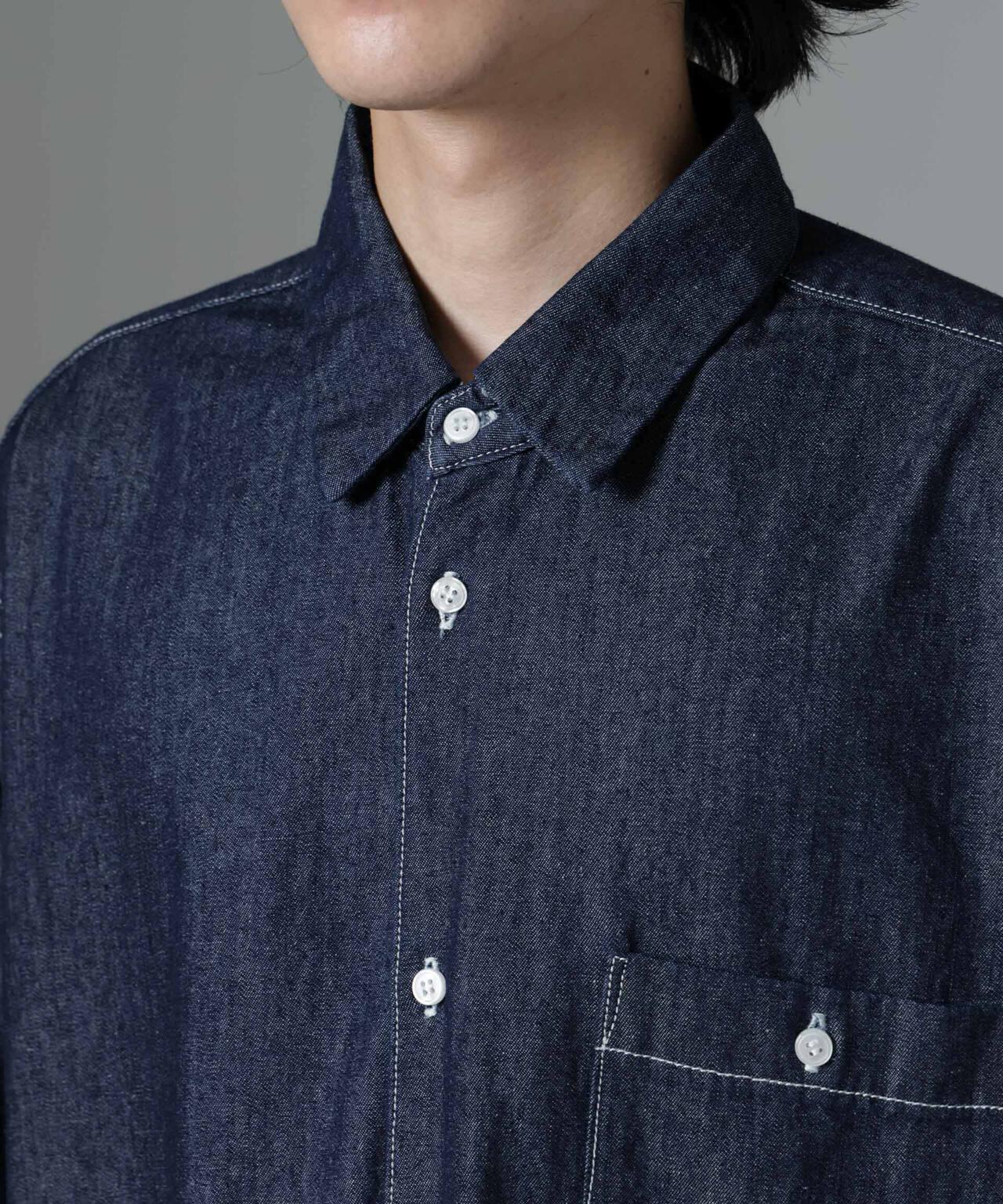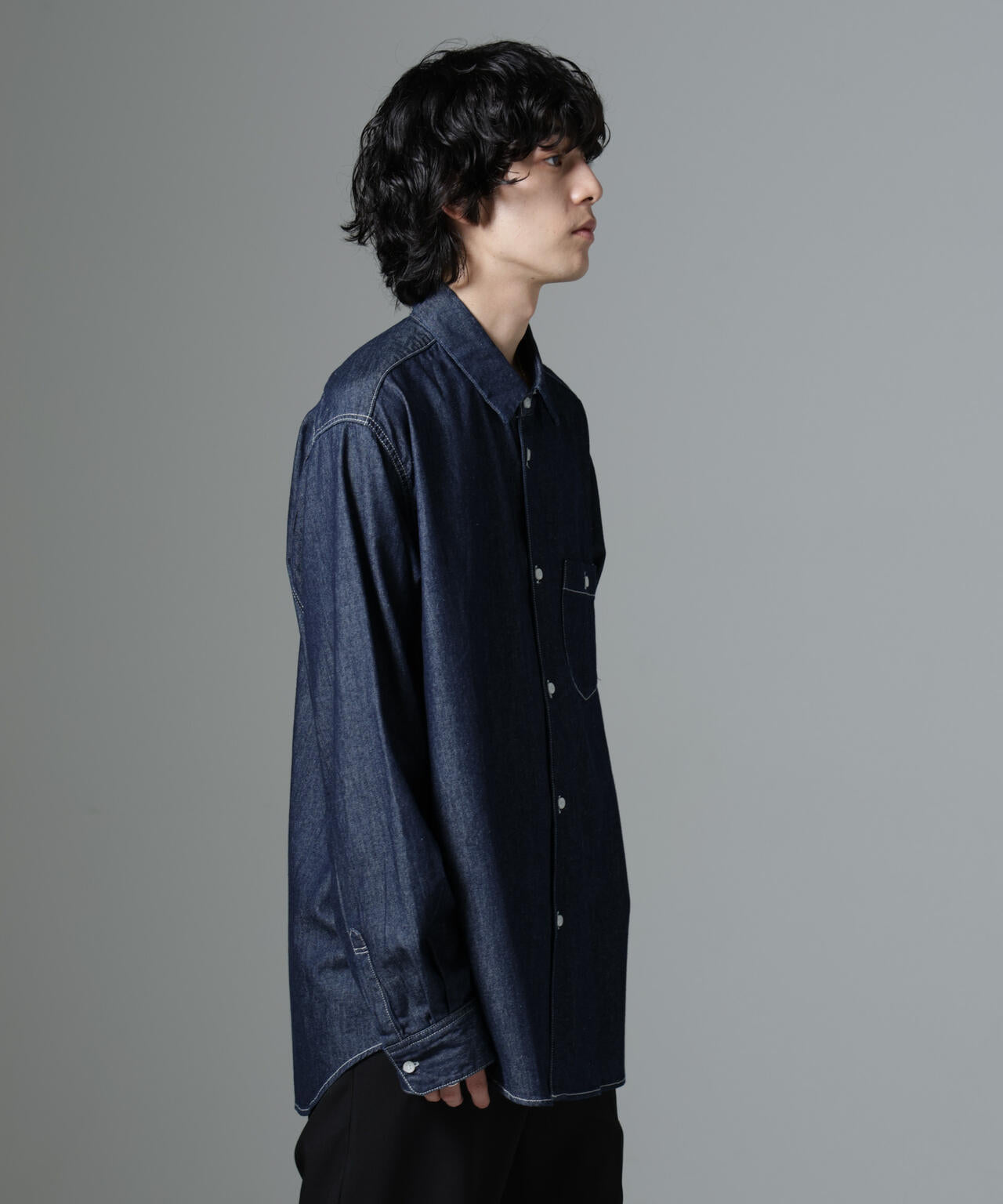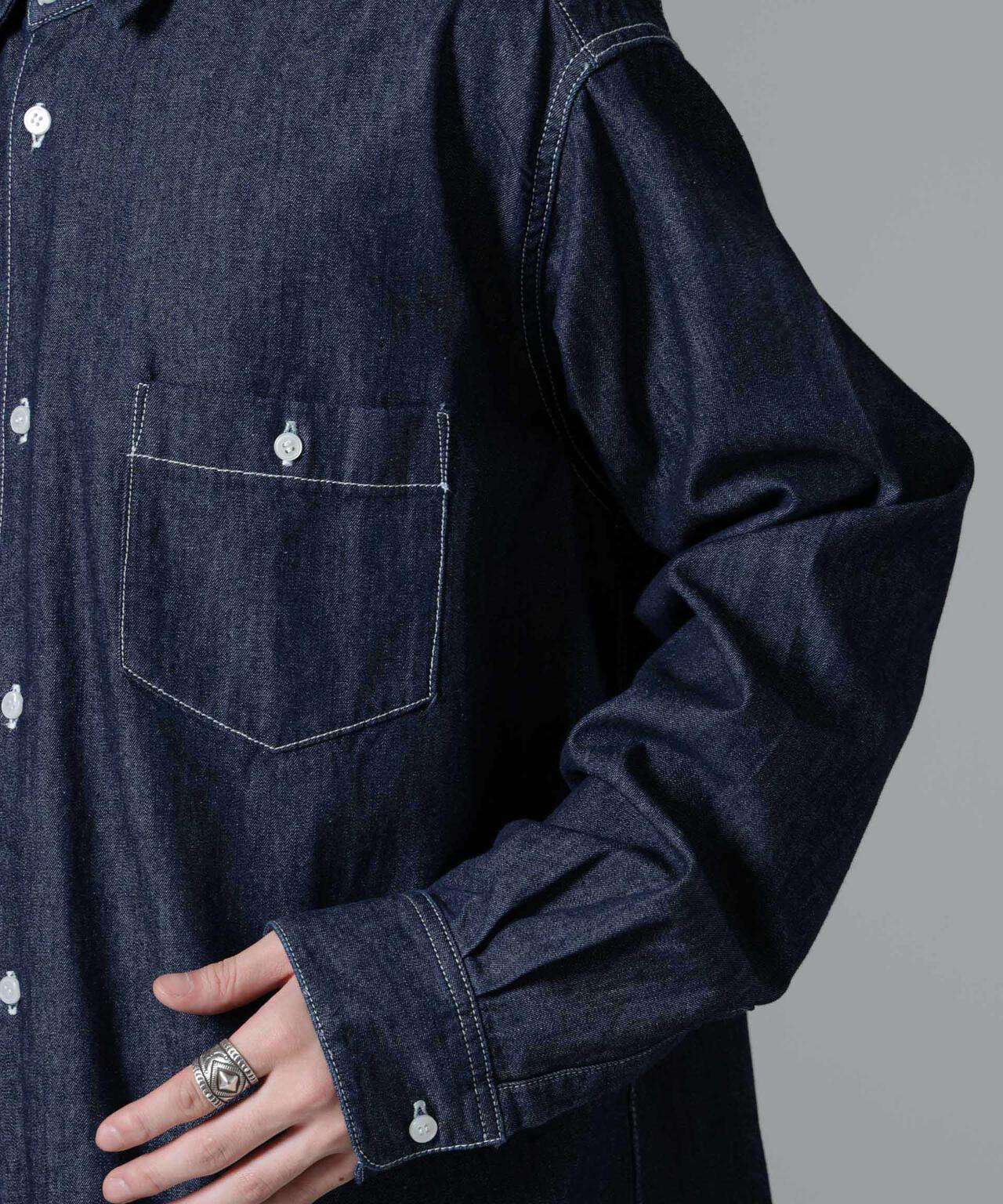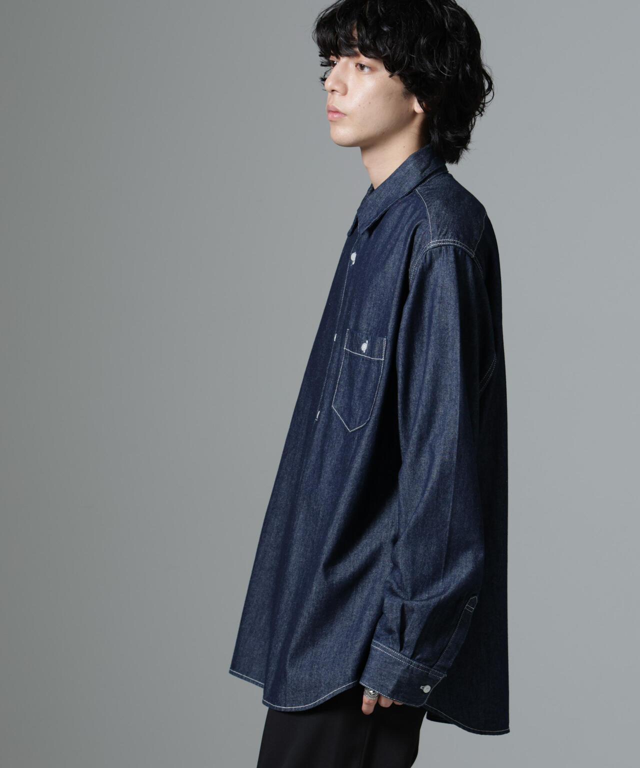 様々なスタイリングに活躍する今シーズンのキーアイテムのデニムシャツ。ステッチを太番手のチェーンステッチにすることで、縫い縮みさせ本格的なデニムシャツに仕上げた1着。ワークウェアのデザインをモチーフにしたデイリー使いにおすすめのアイテムです。