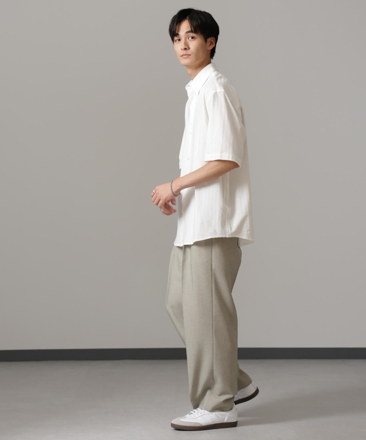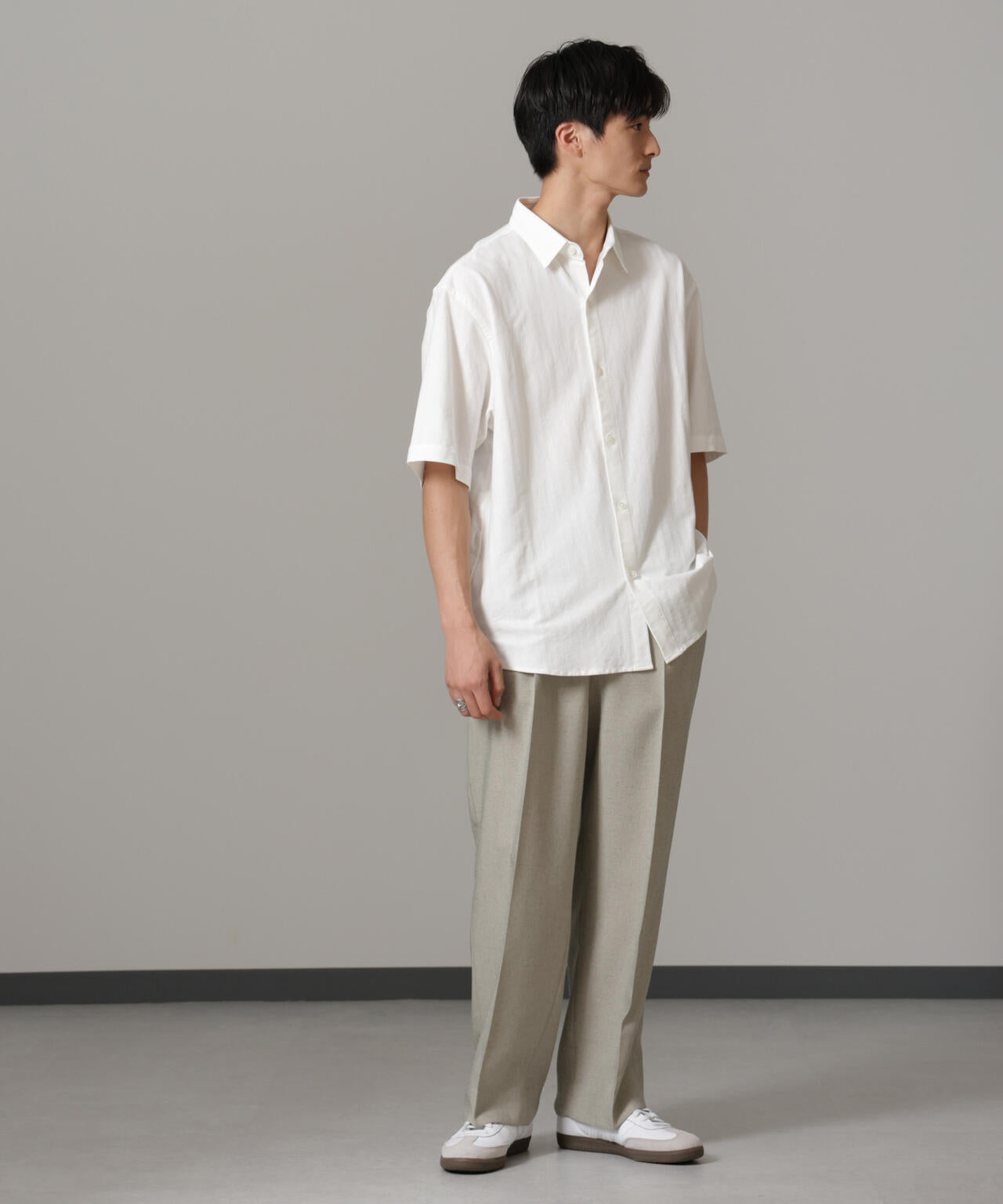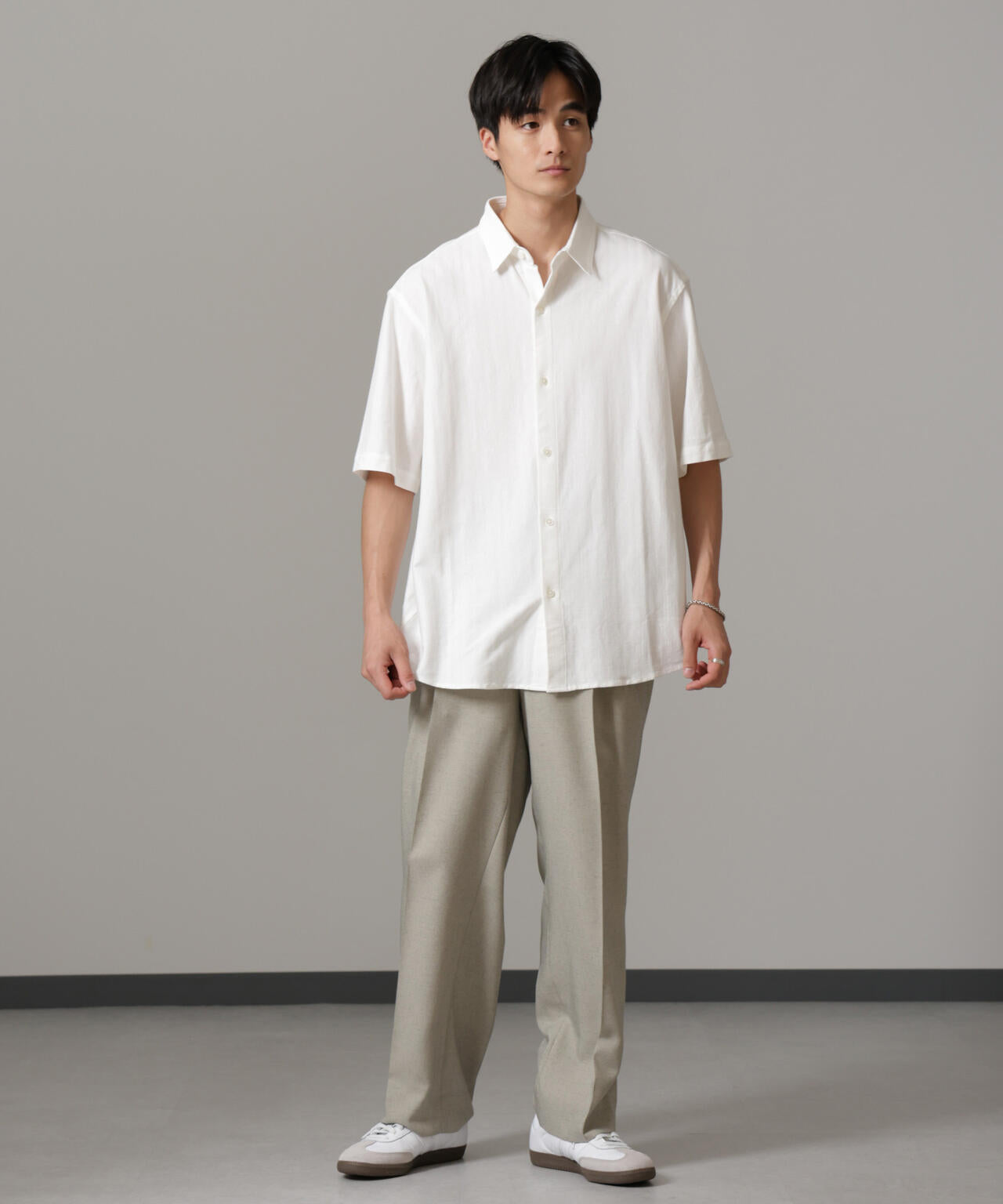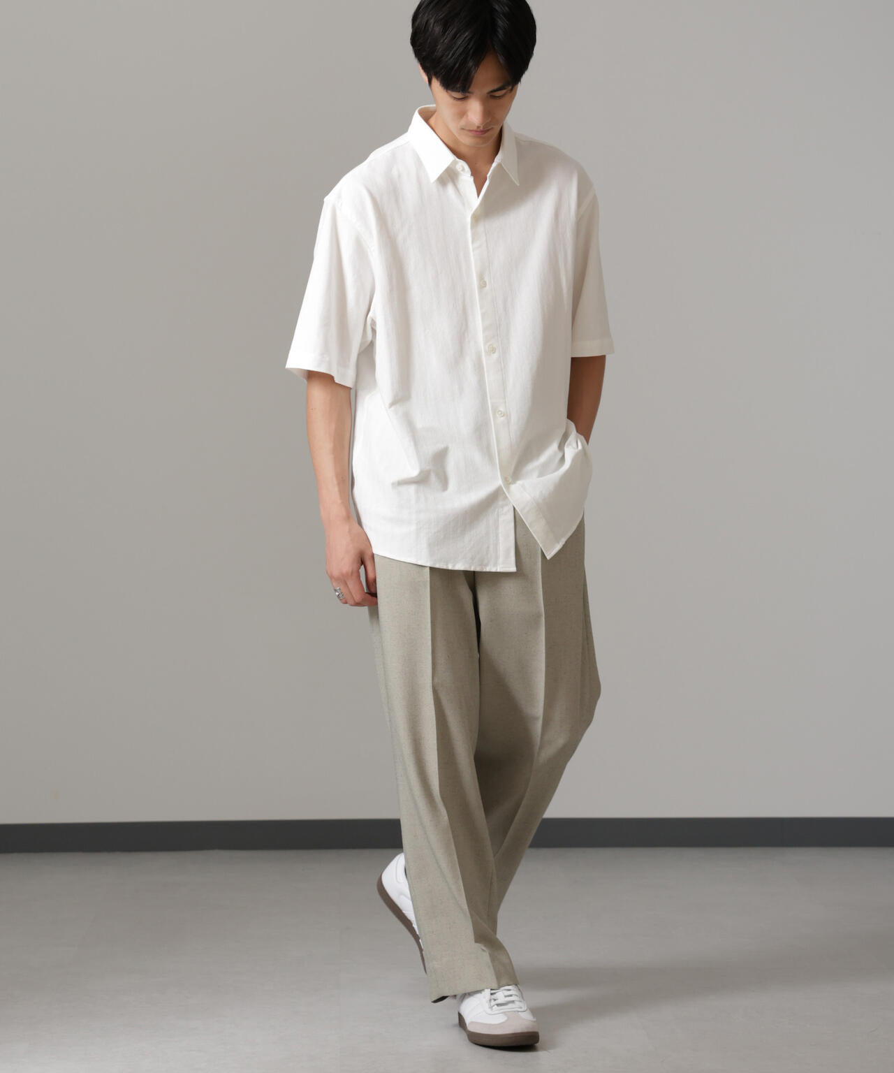 ワイドめなパンツと合わせ、Iシルエットを構築するスタイリングがおすすめです。