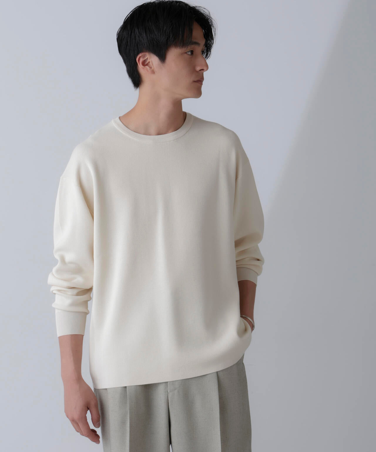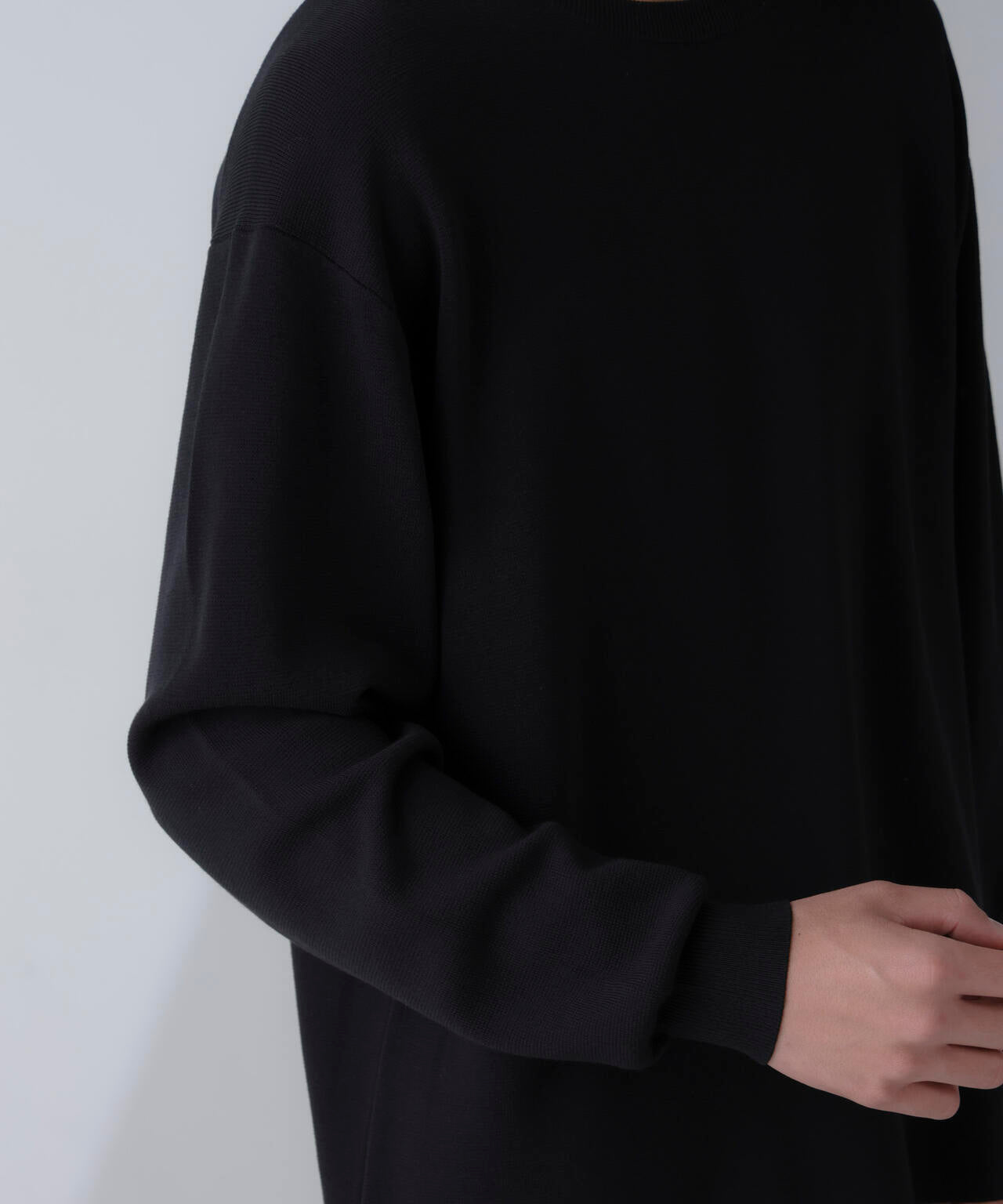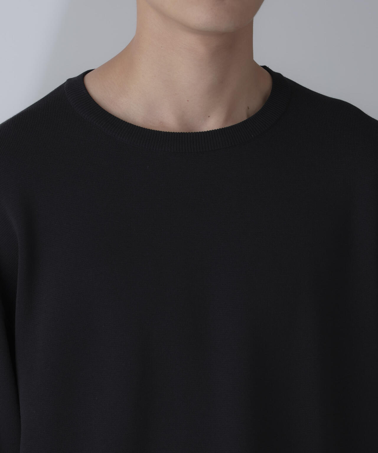 レーヨン混のミラノリブでさらっとした感触と程よく立体感のあるフォルムが特徴のクルーネックニット。微光沢で程よい落ち感のある素材と、裾部分のカットオフしたような仕上がりが上品な印象。カットソー感覚で着用でき、羽織りものなどのインナーとしても様になる汎用性の高い1枚です。