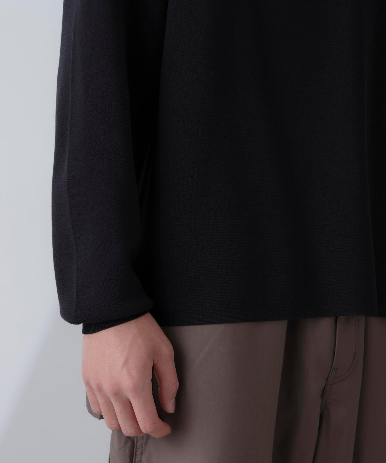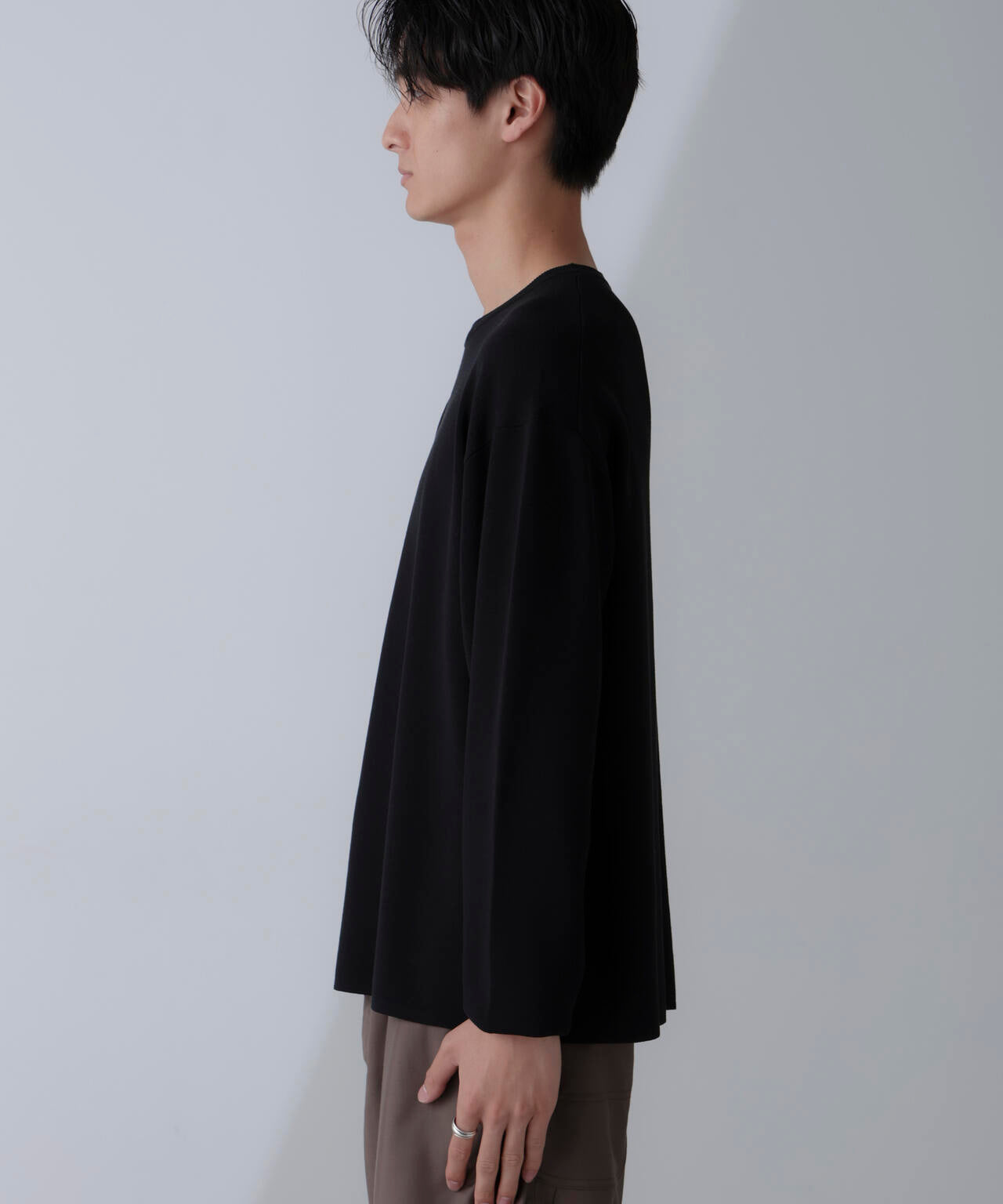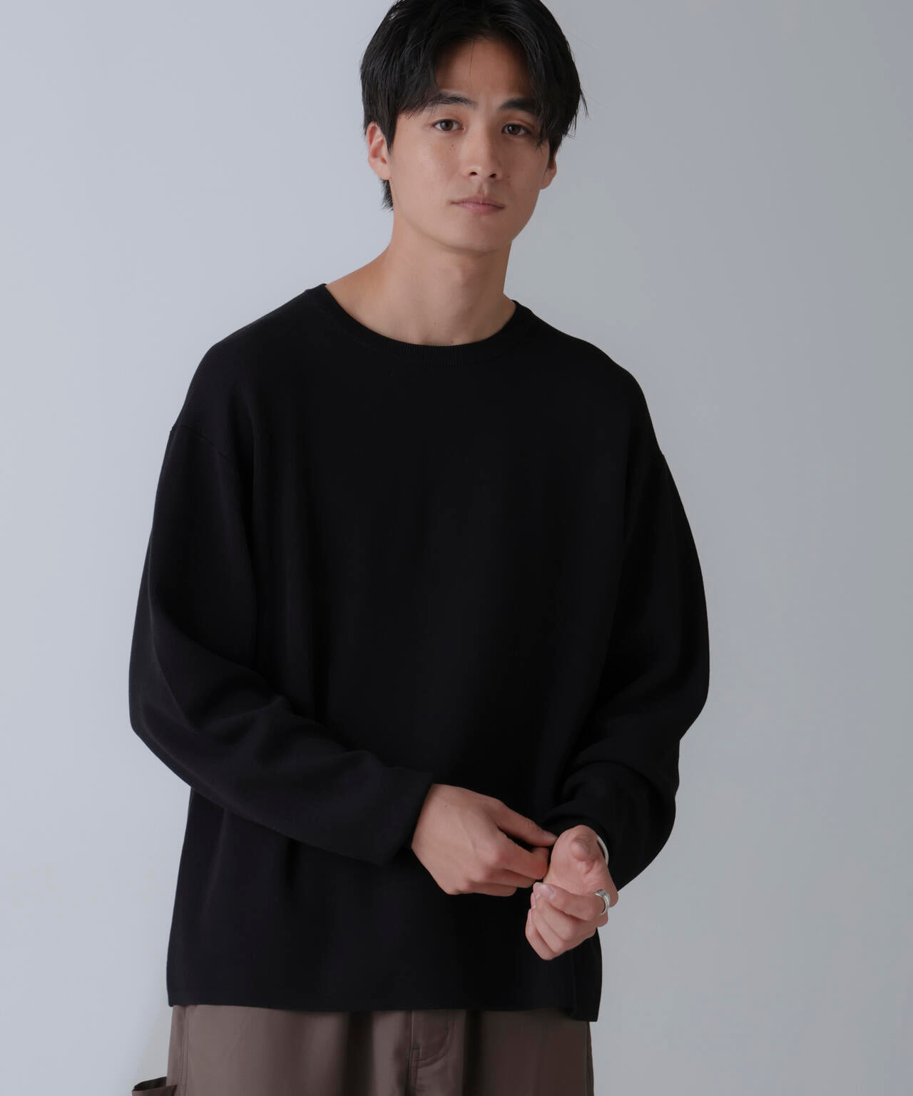 レーヨン混のミラノリブでさらっとした感触と程よく立体感のあるフォルムが特徴のクルーネックニット。微光沢で程よい落ち感のある素材と、裾部分のカットオフしたような仕上がりが上品な印象。カットソー感覚で着用でき、羽織りものなどのインナーとしても様になる汎用性の高い1枚です。