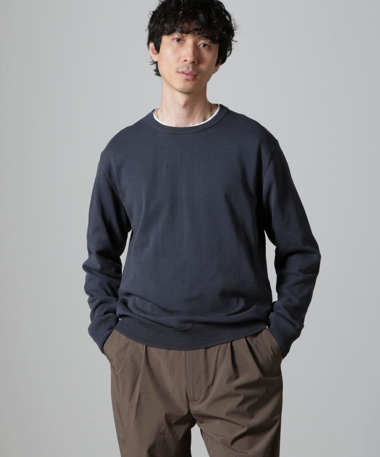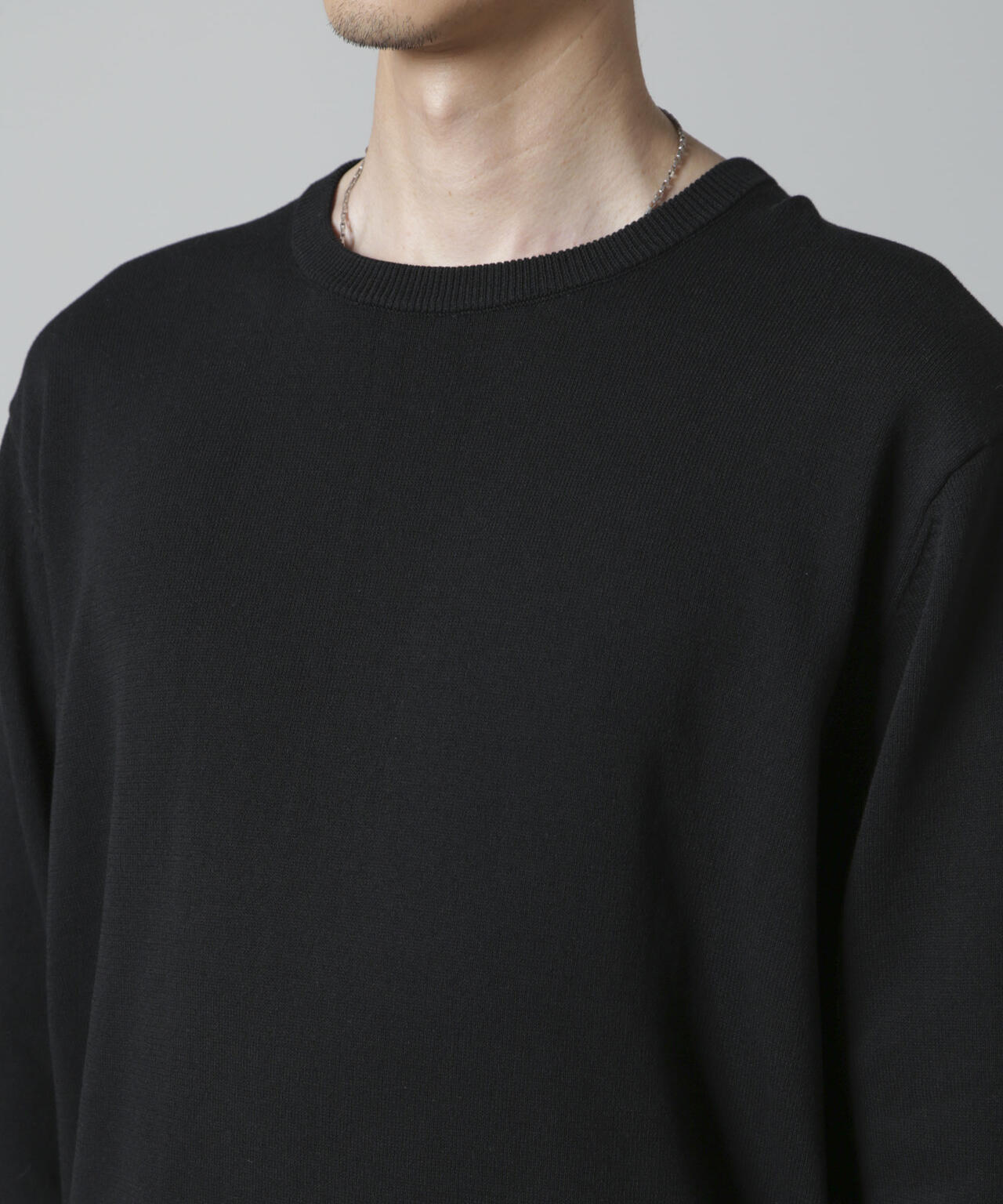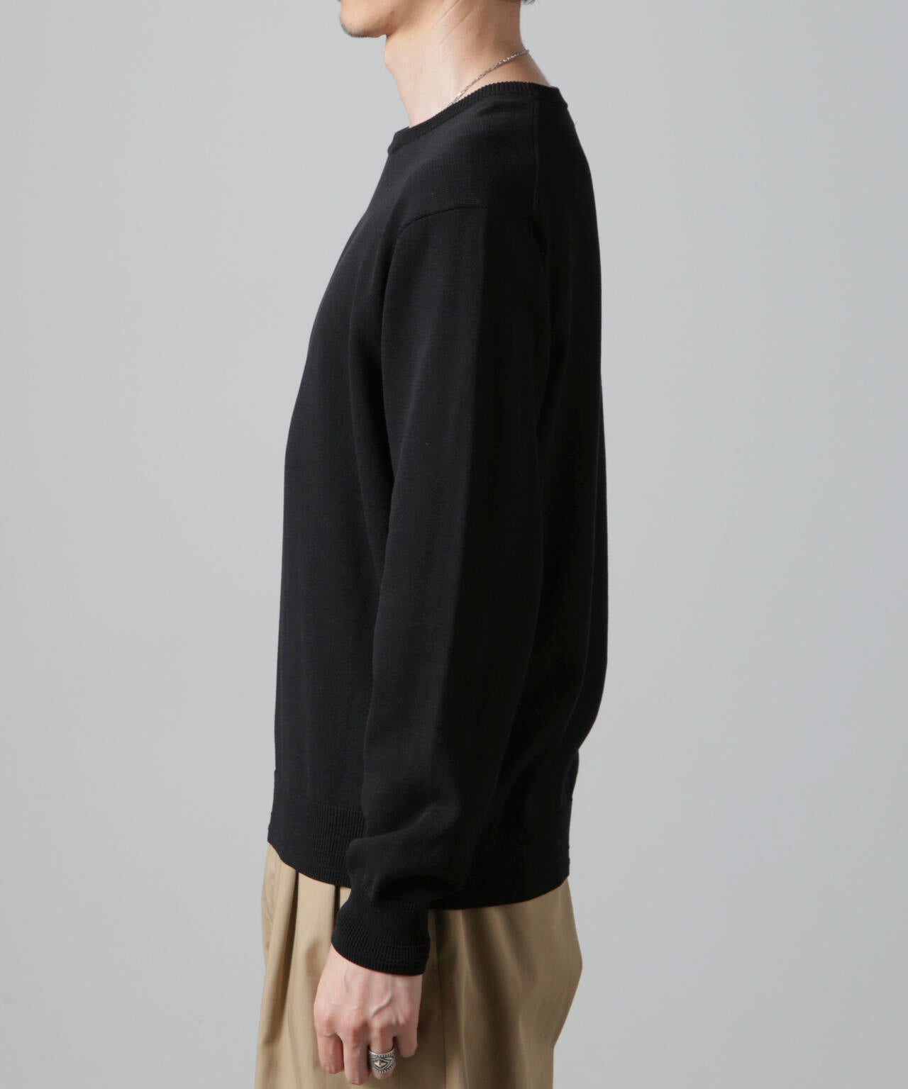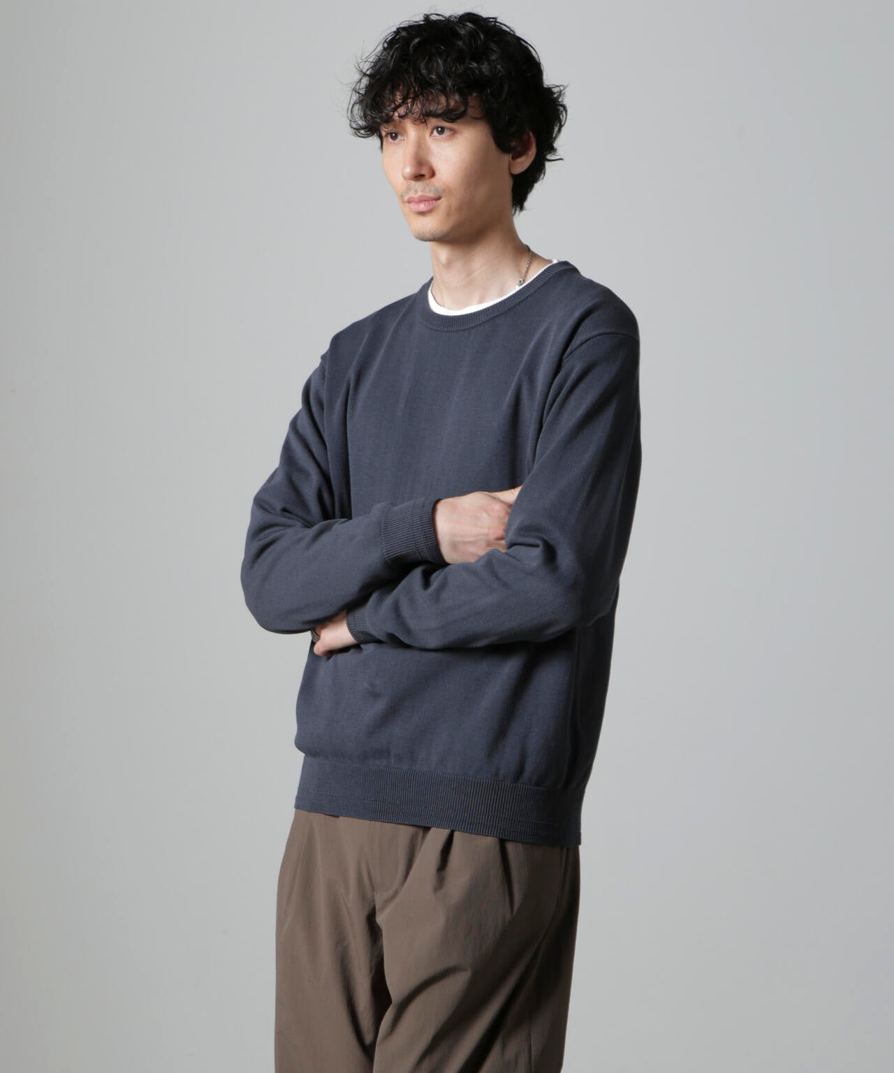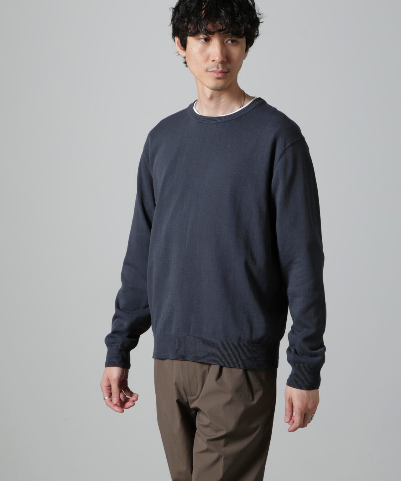 コットンとSOLOTEXの混紡糸を使用したモチ感のある肌触りが特徴のクルーネックニット。アウターにも合わせやすいデザインなので一枚ではもちろんインナーとしても着やすいアイテム。 オフィスカジュアルから休日スタイルまで幅広く活躍する万能な一着です。