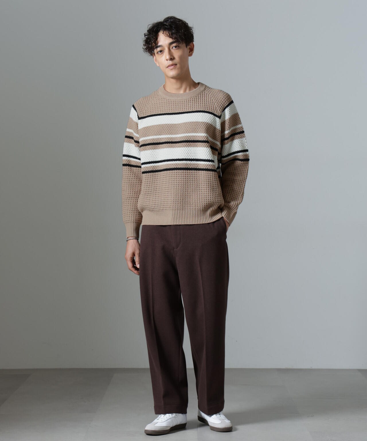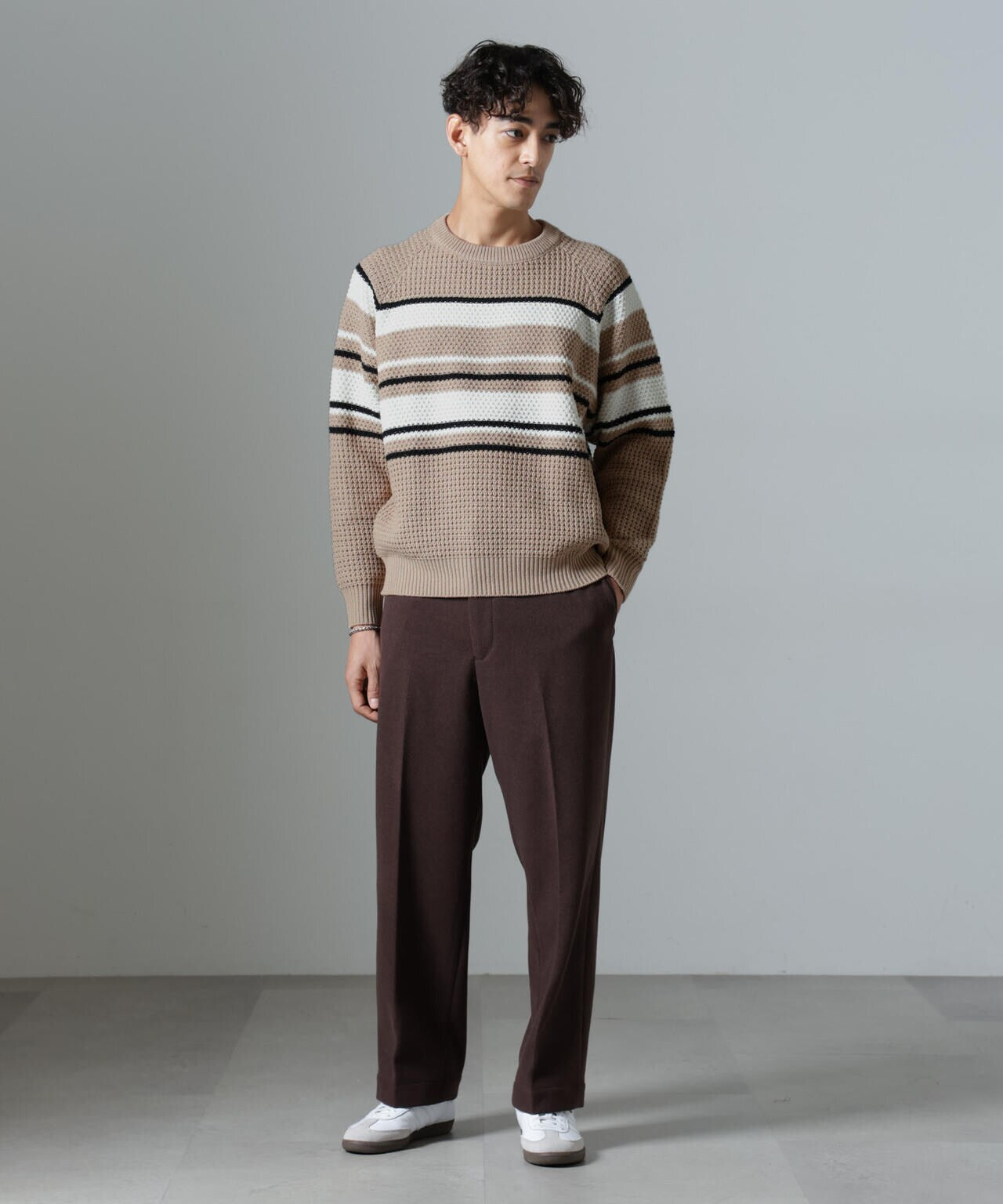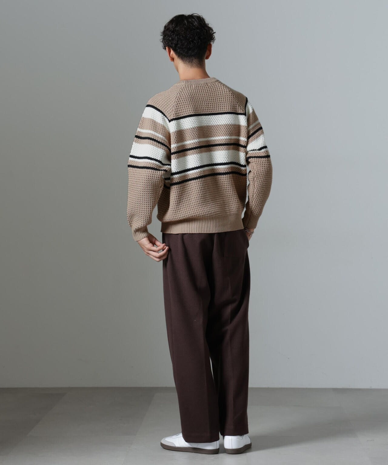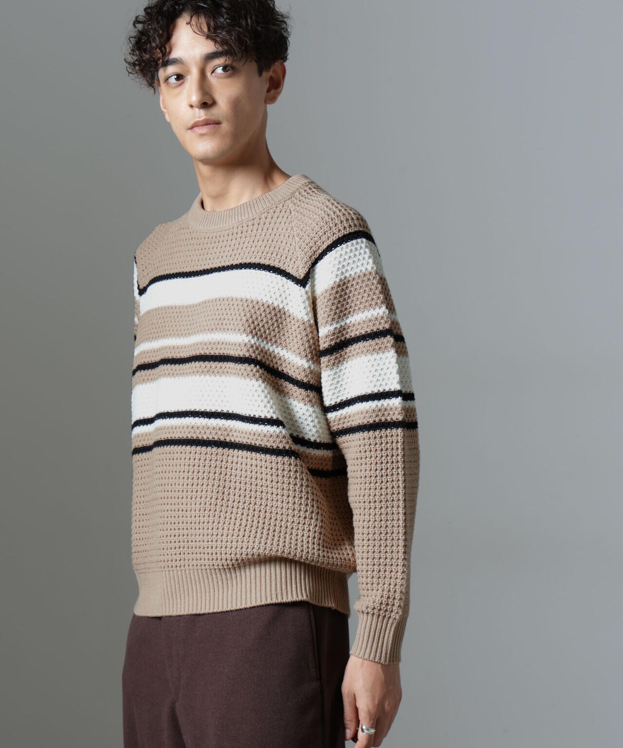 ボーダーピッチが抜け感を演出するのプルオーバー。肌触りの柔らかいコットンとバルキータイプのアクリルを混紡した糸を採用。リラックス感のある雰囲気で、室内でもラフに着用いただけるおすすめの1着です。
