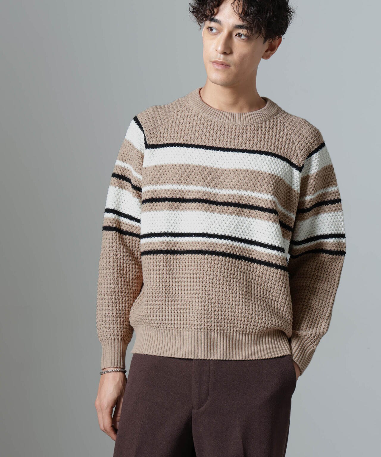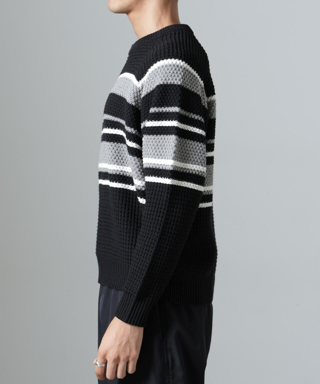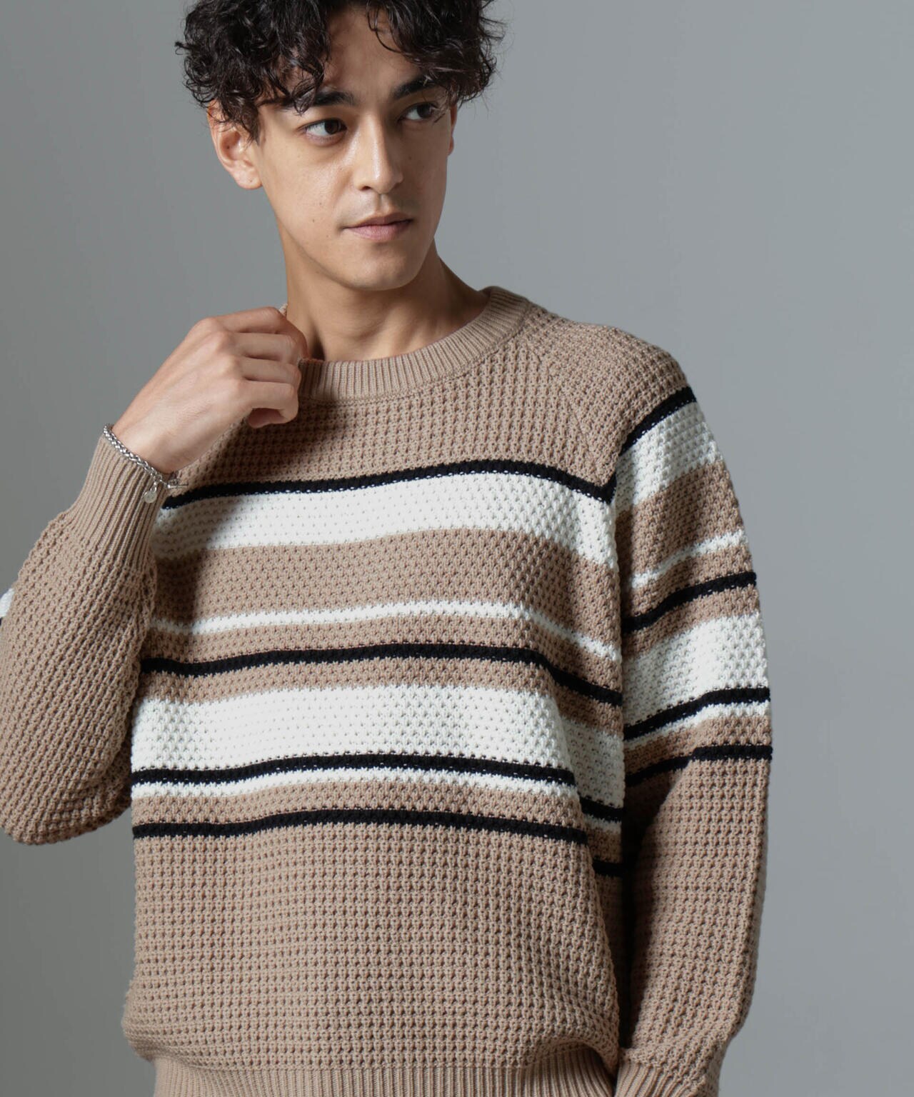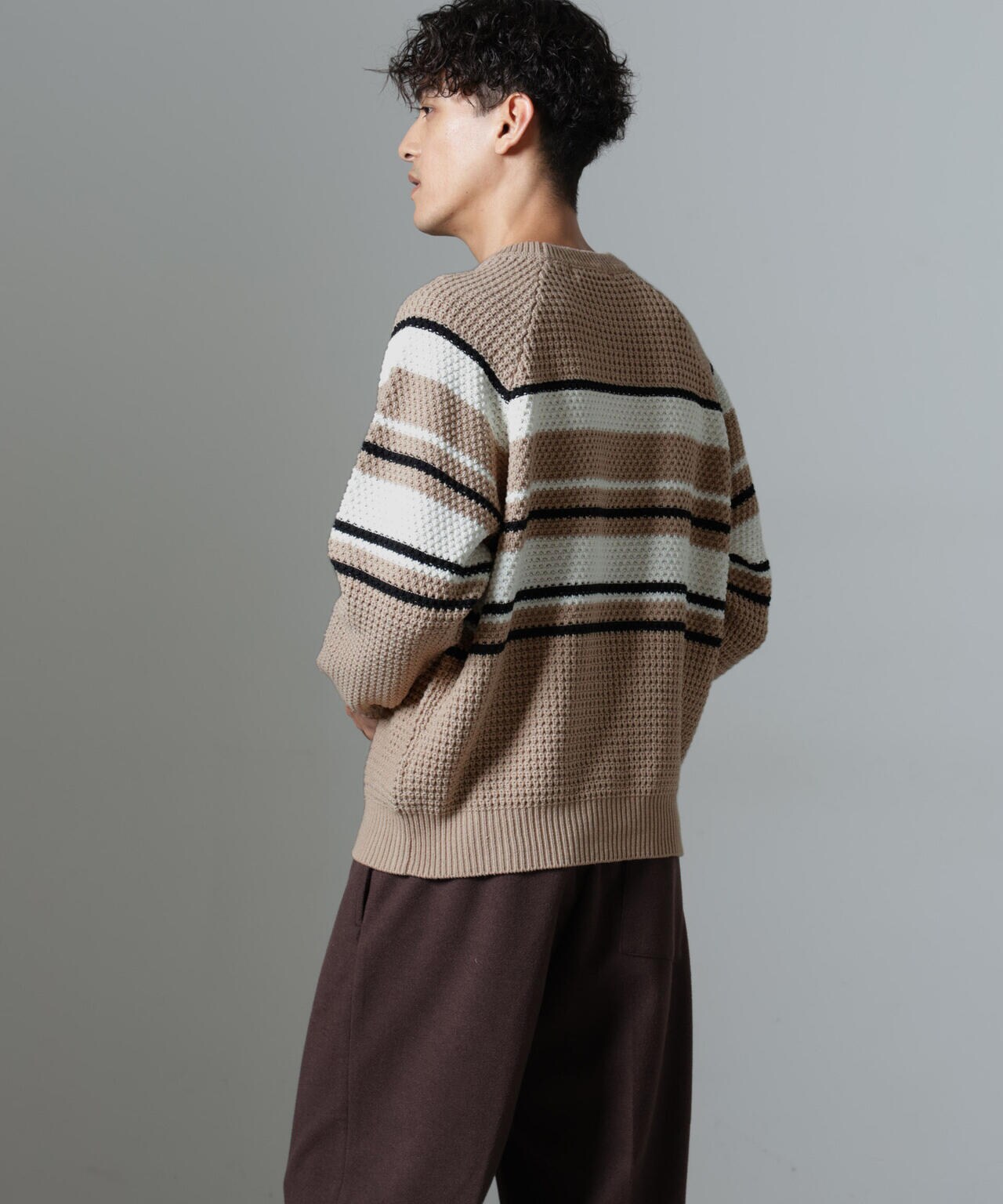 ボーダーピッチが抜け感を演出するのプルオーバー。肌触りの柔らかいコットンとバルキータイプのアクリルを混紡した糸を採用。リラックス感のある雰囲気で、室内でもラフに着用いただけるおすすめの1着です。