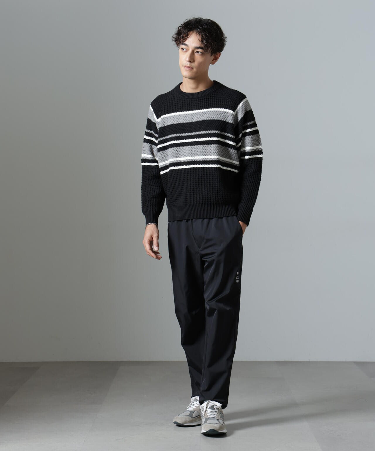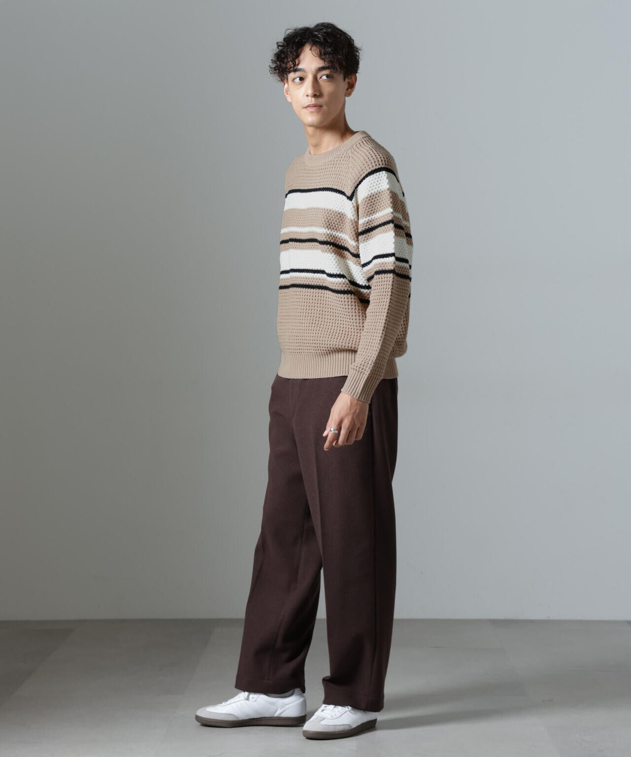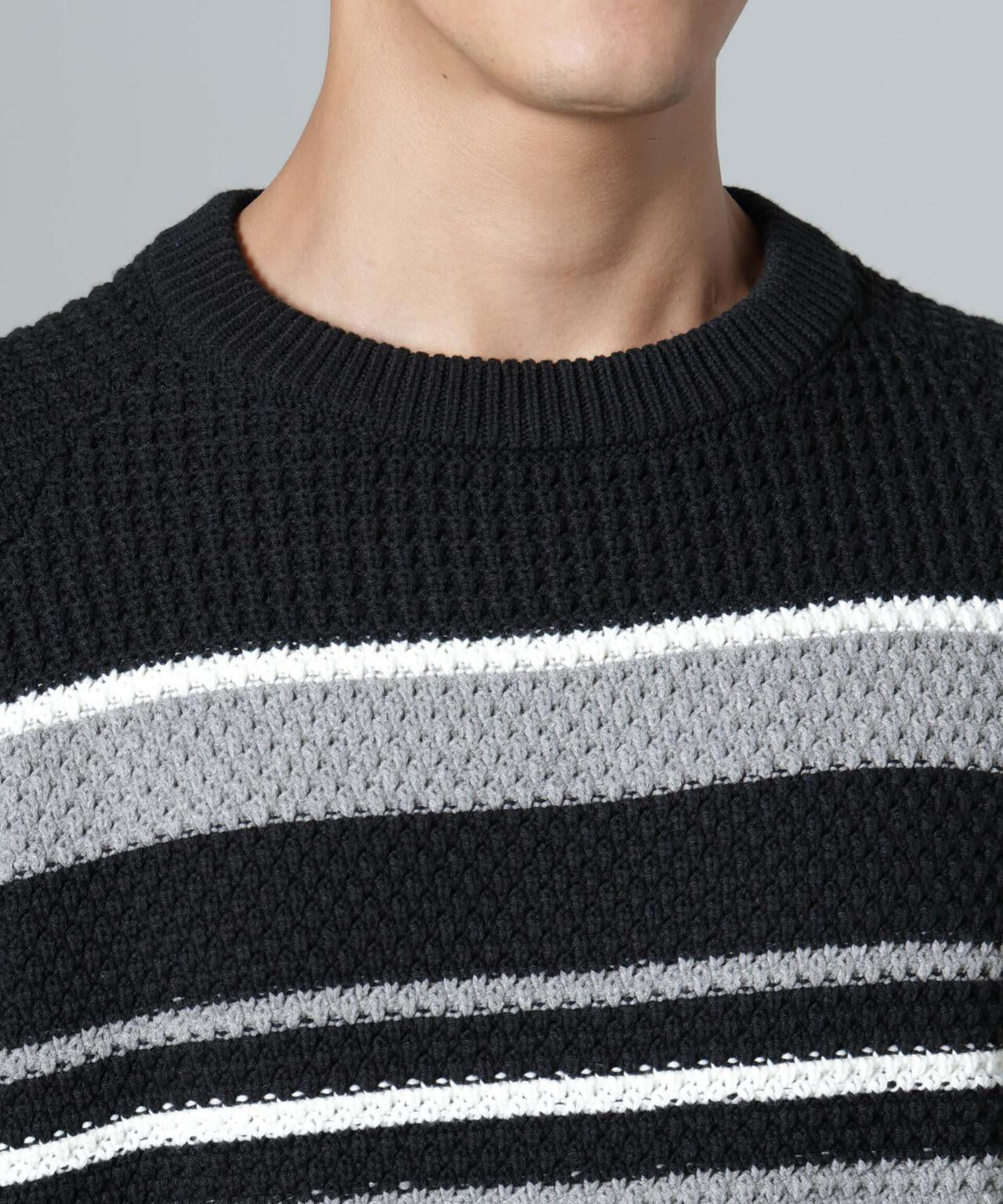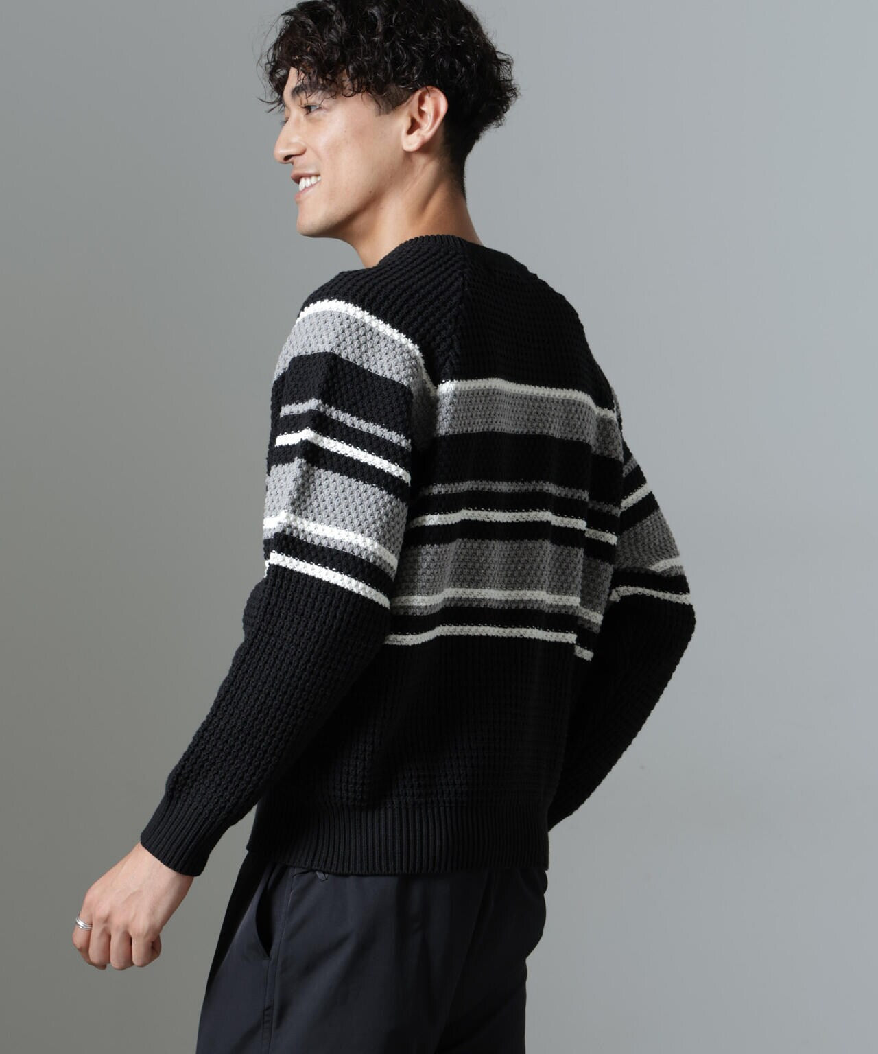 ボーダーピッチが抜け感を演出するのプルオーバー。肌触りの柔らかいコットンとバルキータイプのアクリルを混紡した糸を採用。リラックス感のある雰囲気で、室内でもラフに着用いただけるおすすめの1着です。