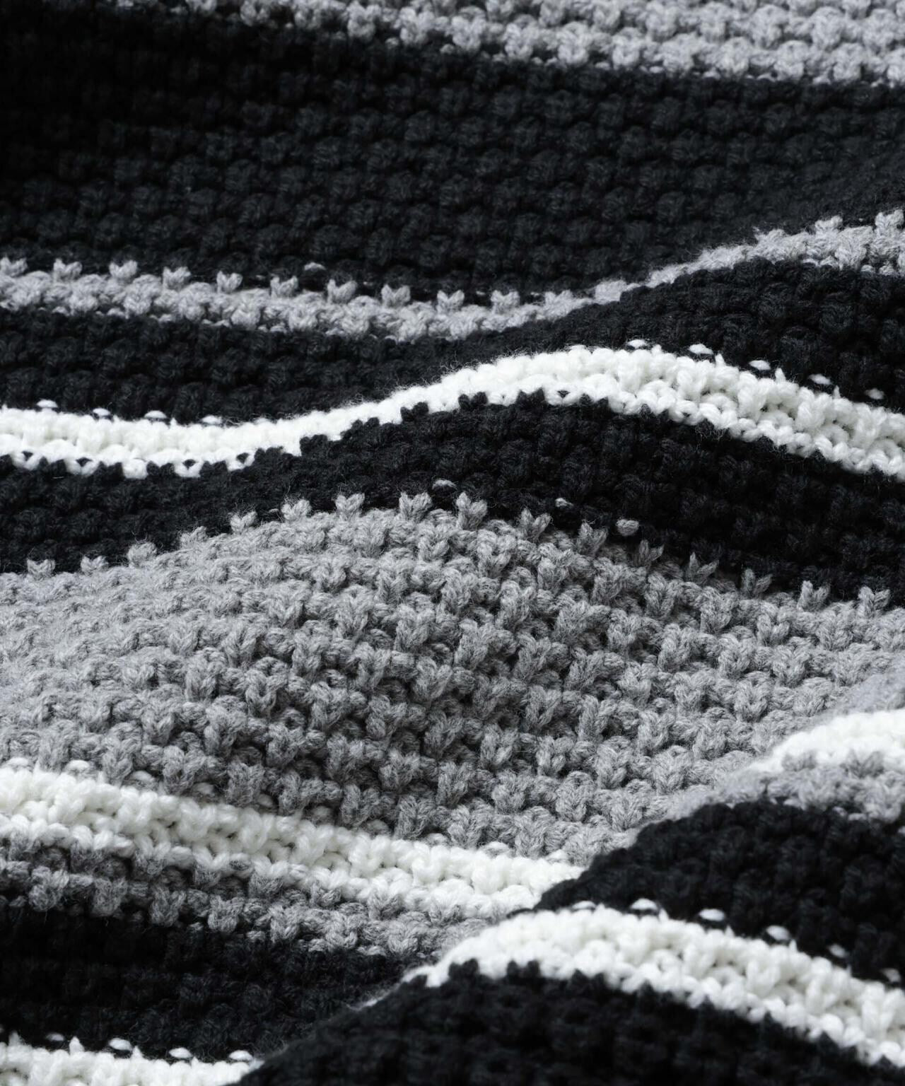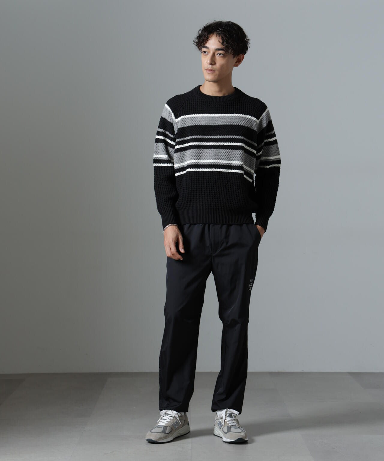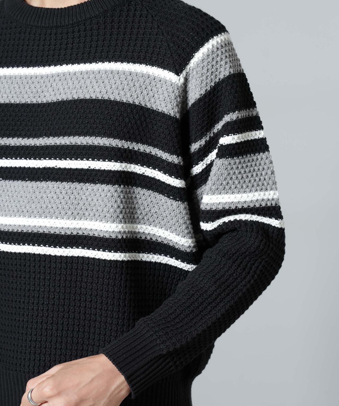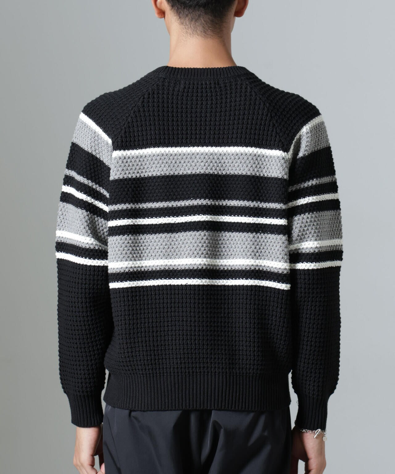 ボーダーピッチが抜け感を演出するのプルオーバー。肌触りの柔らかいコットンとバルキータイプのアクリルを混紡した糸を採用。リラックス感のある雰囲気で、室内でもラフに着用いただけるおすすめの1着です。