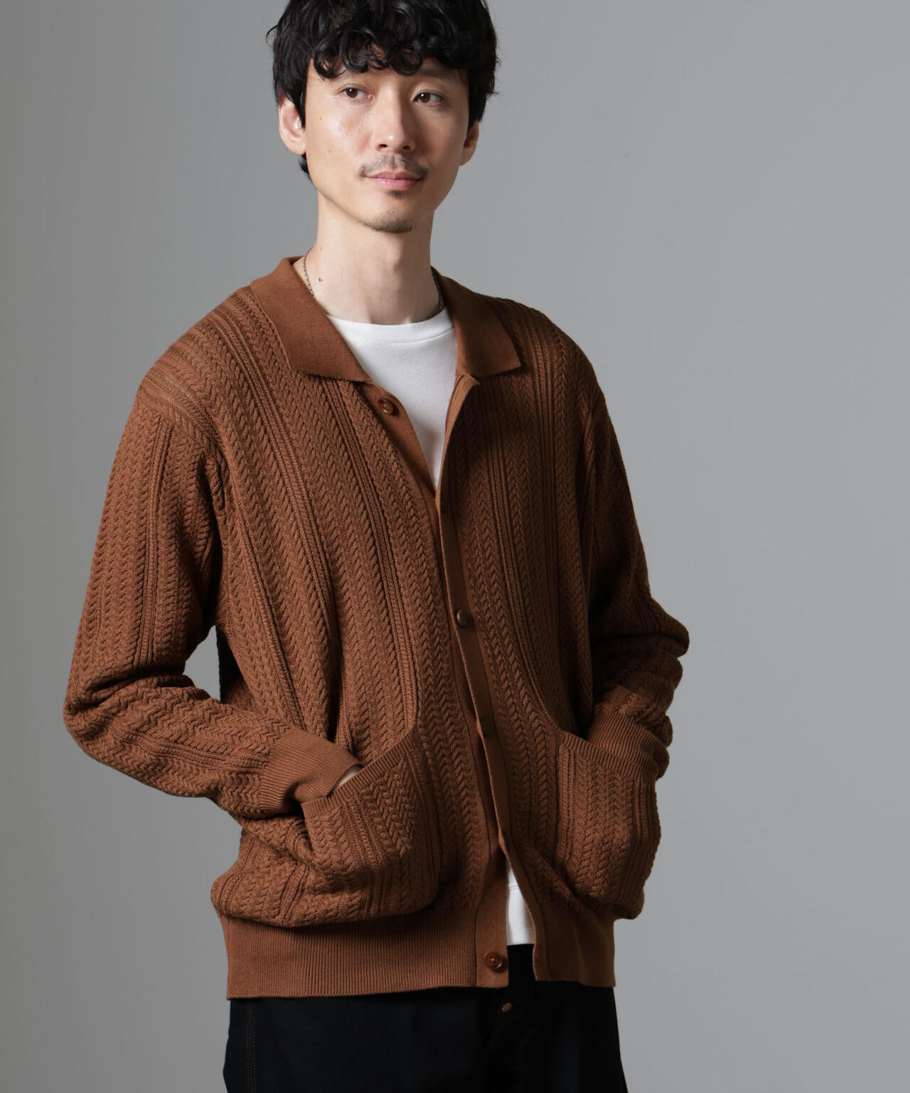 立体感のあるケーブルを使用したニットカーディガン。ベーシックで品のあるデザインが特徴の1枚でもサマになるアイテムです。