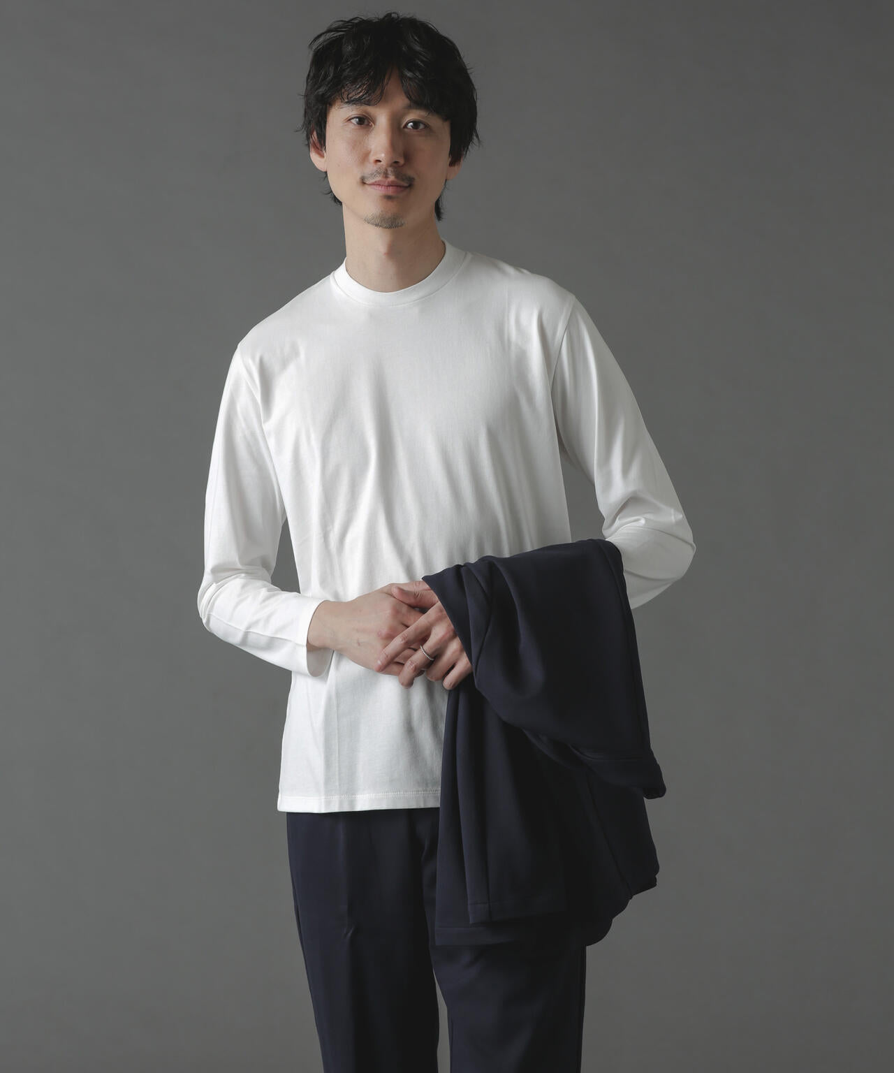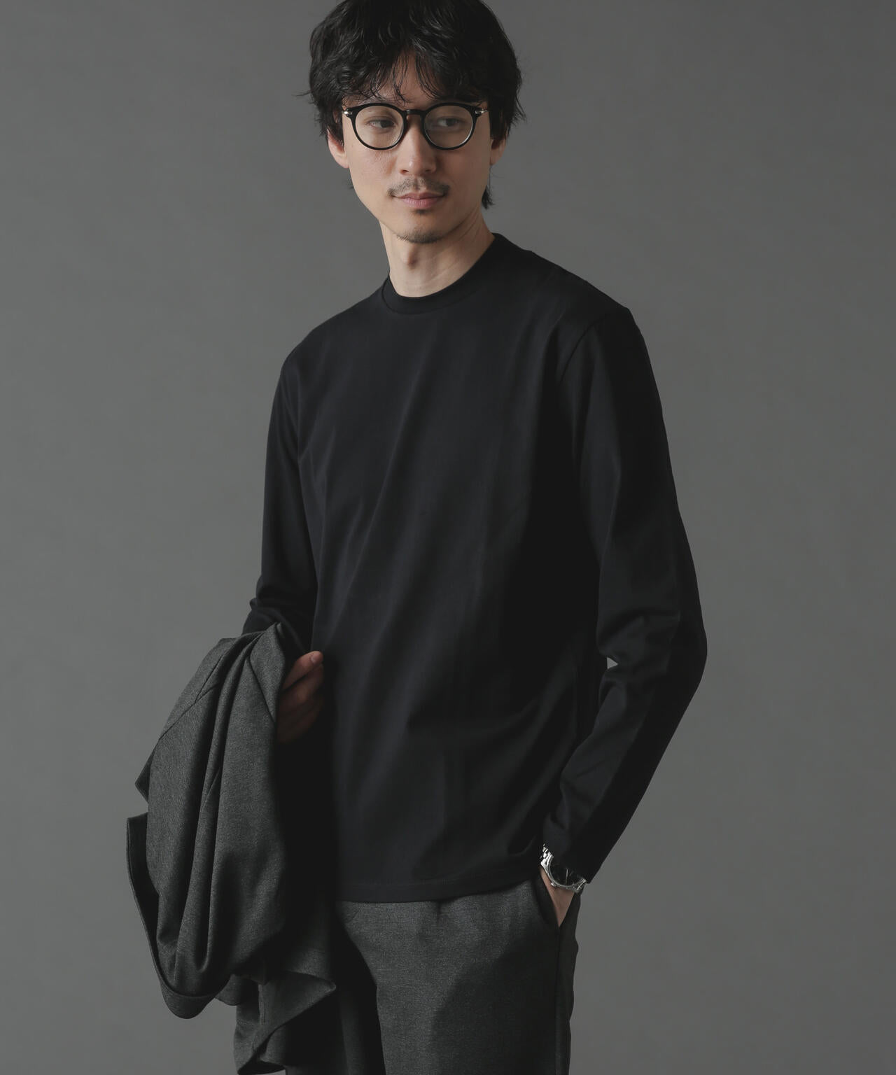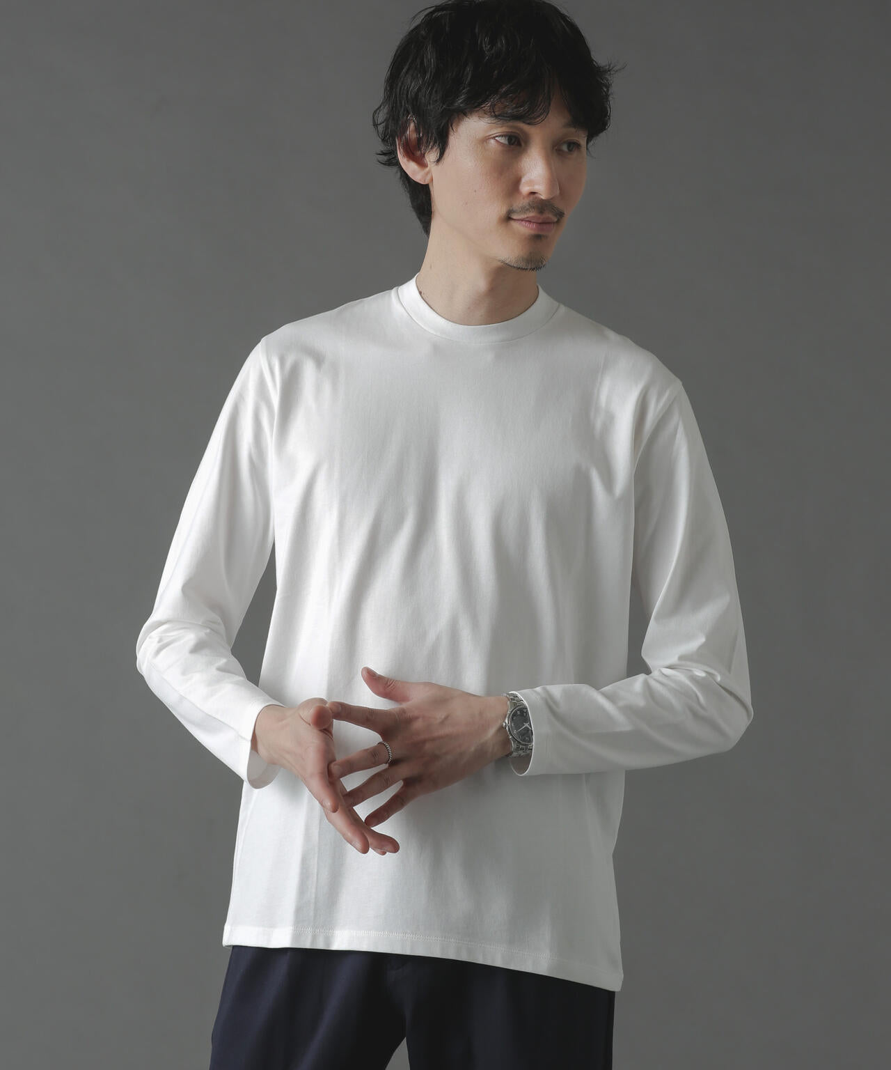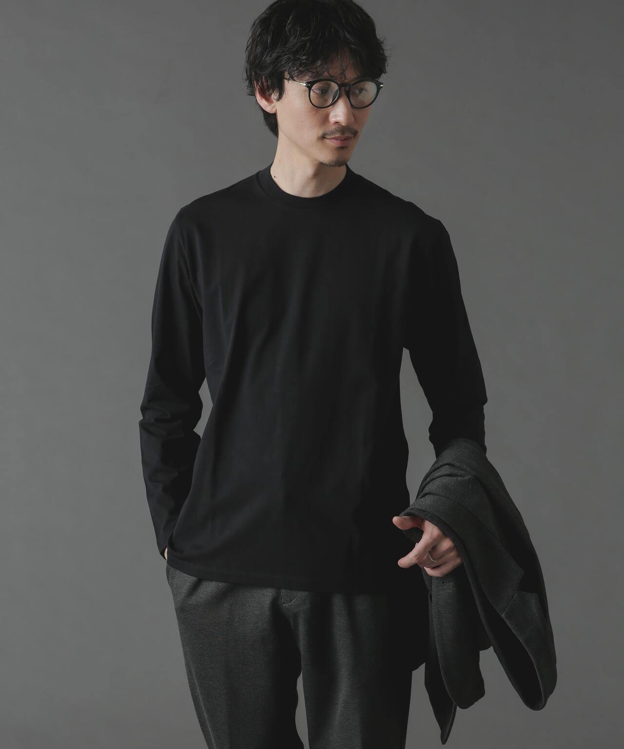 ジャケット着用の為に計算されて作られた毎シーズン大好評のTシャツの長袖タイプ。ジャケットのインナーとして計算されたネックデザインやシルエットは、ビジネスシーンにおいて抜群のパフォーマンスを発揮。インナーとして最適な仕様の1着です。綿100%ながらもシルクのような上品な光沢感を表現しているため、フォーマルな着こなしに映えるロンTに仕上げています。