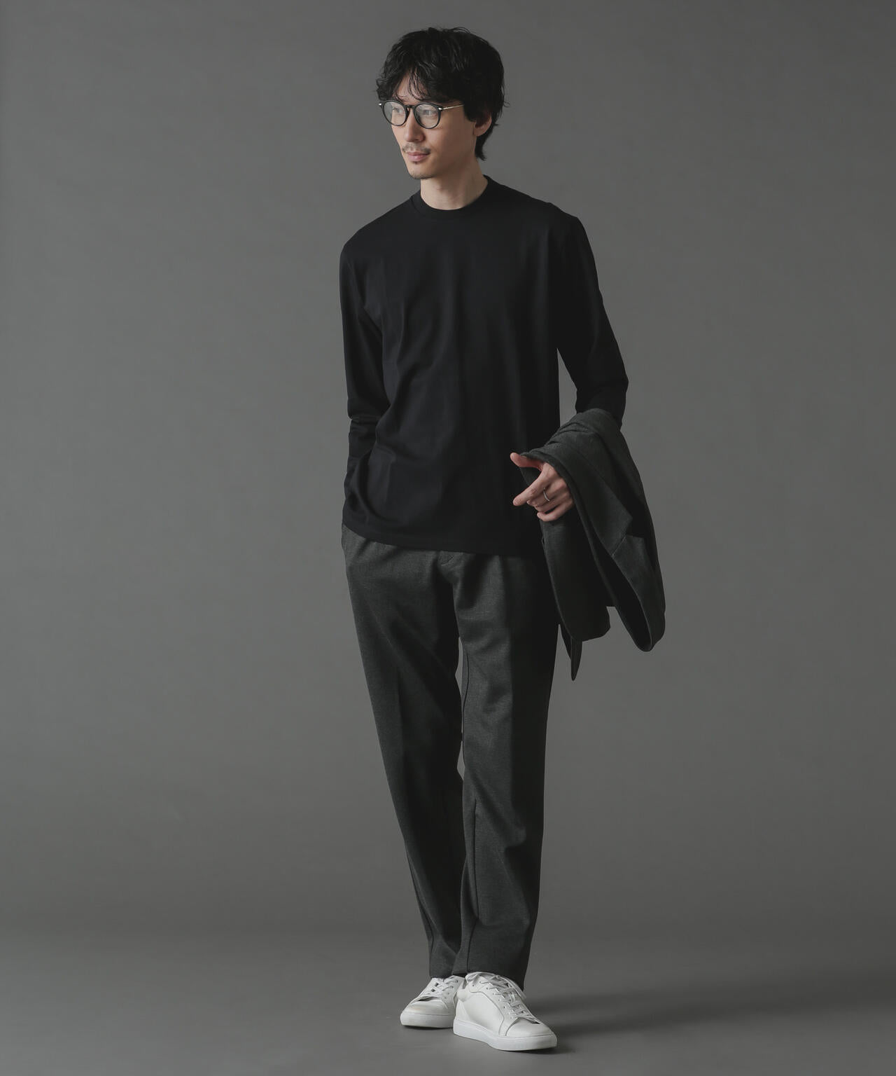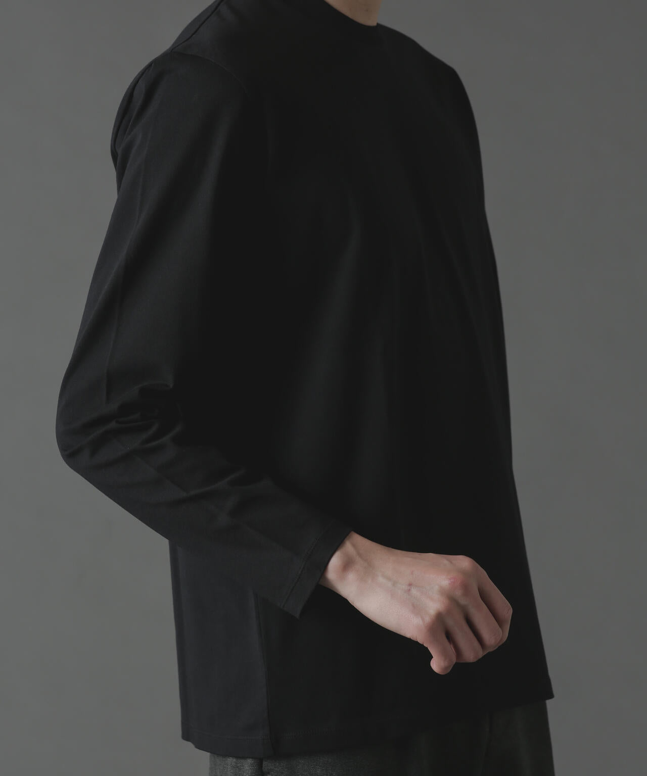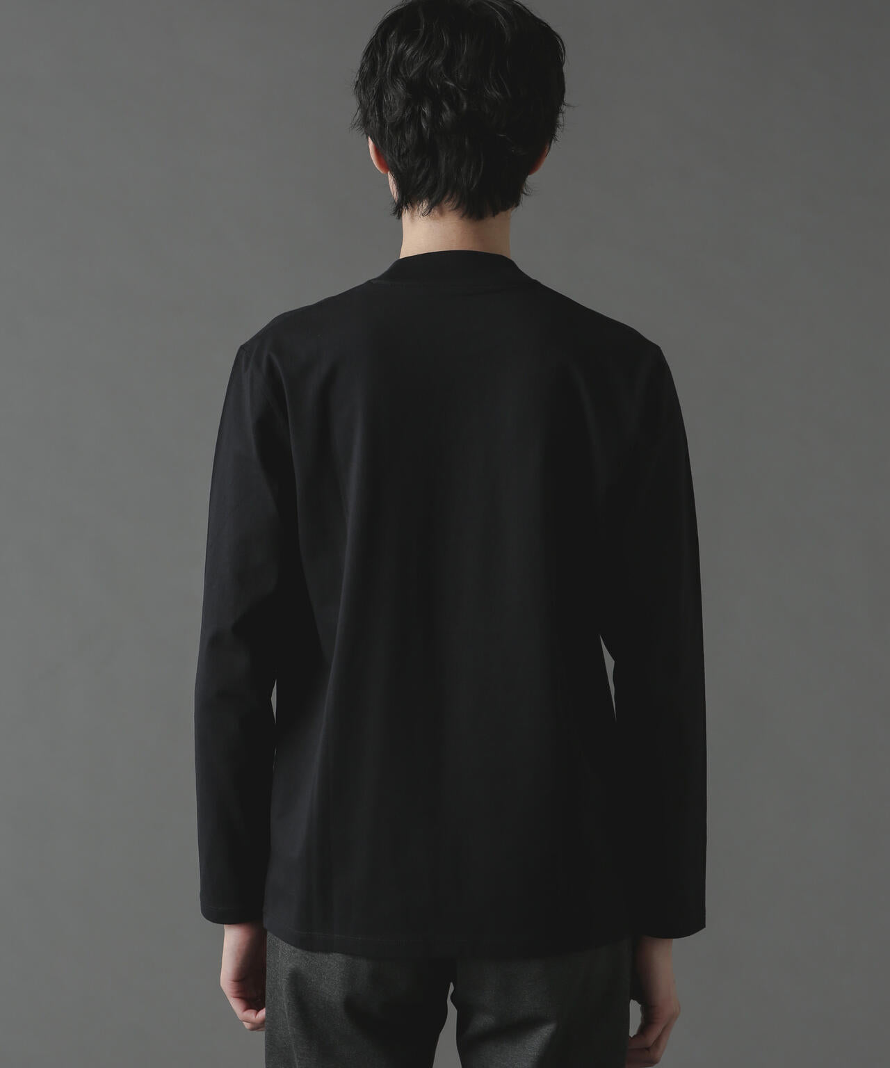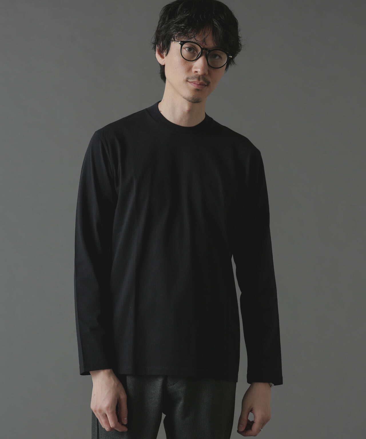 ジャケット着用の為に計算されて作られた毎シーズン大好評のTシャツの長袖タイプ。ジャケットのインナーとして計算されたネックデザインやシルエットは、ビジネスシーンにおいて抜群のパフォーマンスを発揮。インナーとして最適な仕様の1着です。綿100%ながらもシルクのような上品な光沢感を表現しているため、フォーマルな着こなしに映えるロンTに仕上げています。