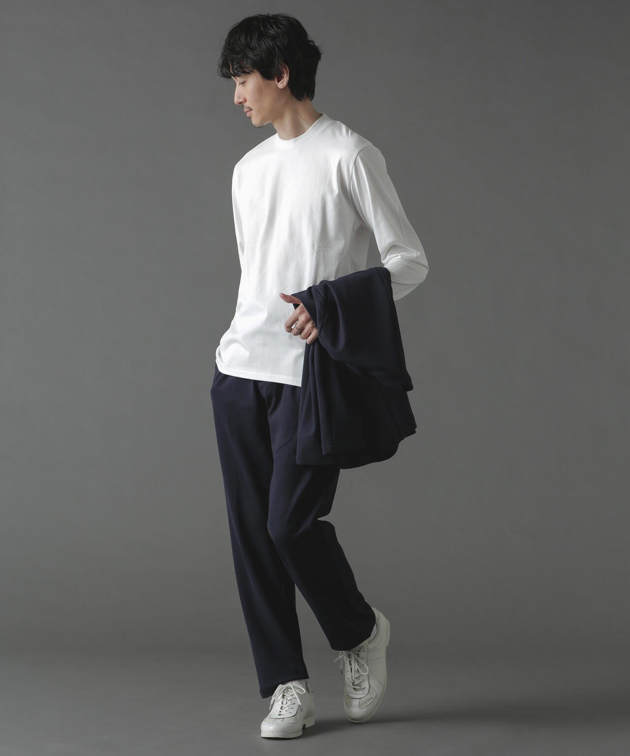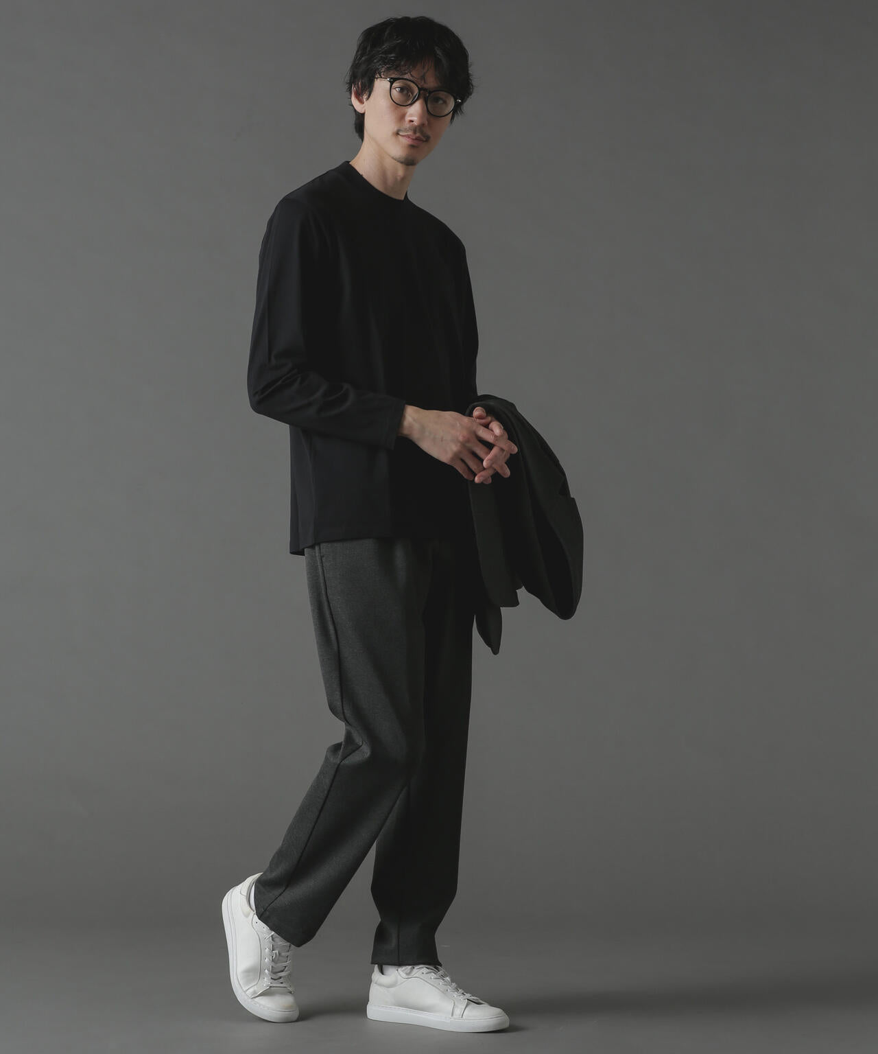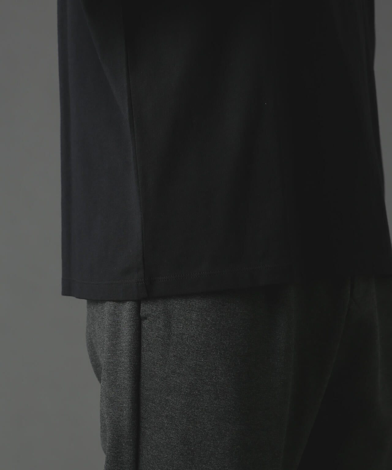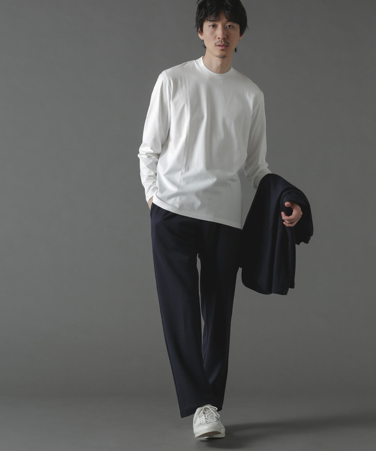ジャケット着用の為に計算されて作られた毎シーズン大好評のTシャツの長袖タイプ。ジャケットのインナーとして計算されたネックデザインやシルエットは、ビジネスシーンにおいて抜群のパフォーマンスを発揮。インナーとして最適な仕様の1着です。綿100%ながらもシルクのような上品な光沢感を表現しているため、フォーマルな着こなしに映えるロンTに仕上げています。