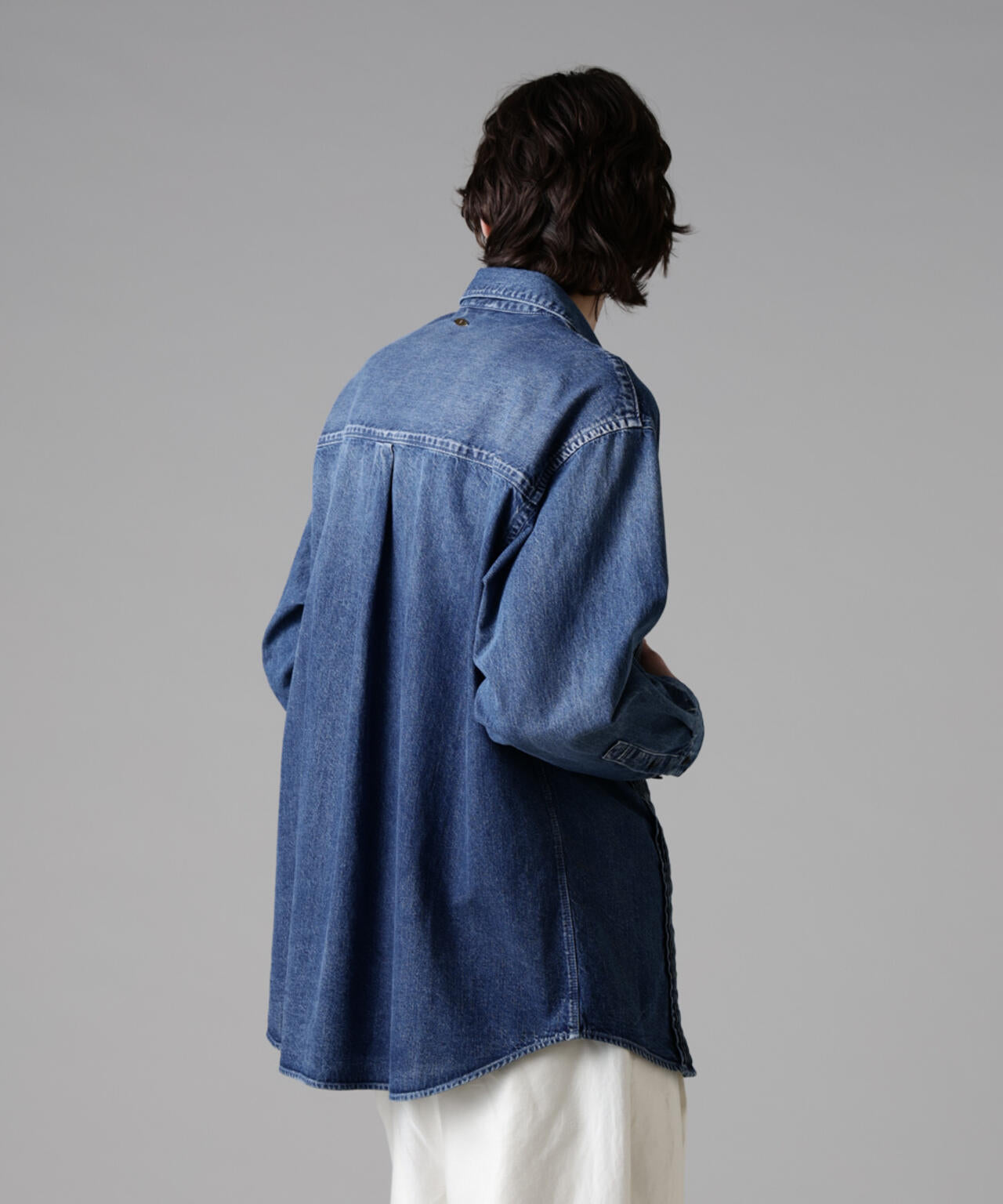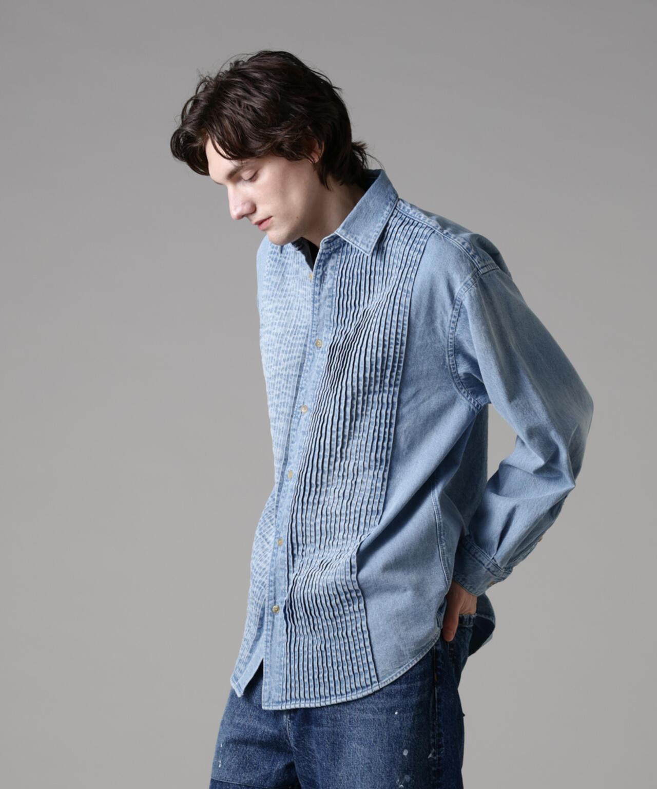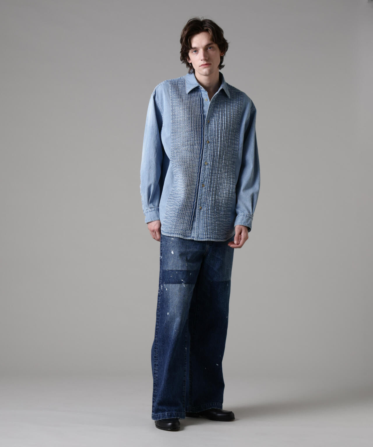 存在感のあるピンタックのデザインが目を惹くデニムシャツ。シャツに使われるシャンブレーではなく、敢えて少し薄めのデニムを使用することで迫力のある立体感と奥行きのあるヴィンテージ加工を可能にしました。インナーとしてだけではなく、シャツアウターとしても使用可能な3シーズン活躍する1着です。