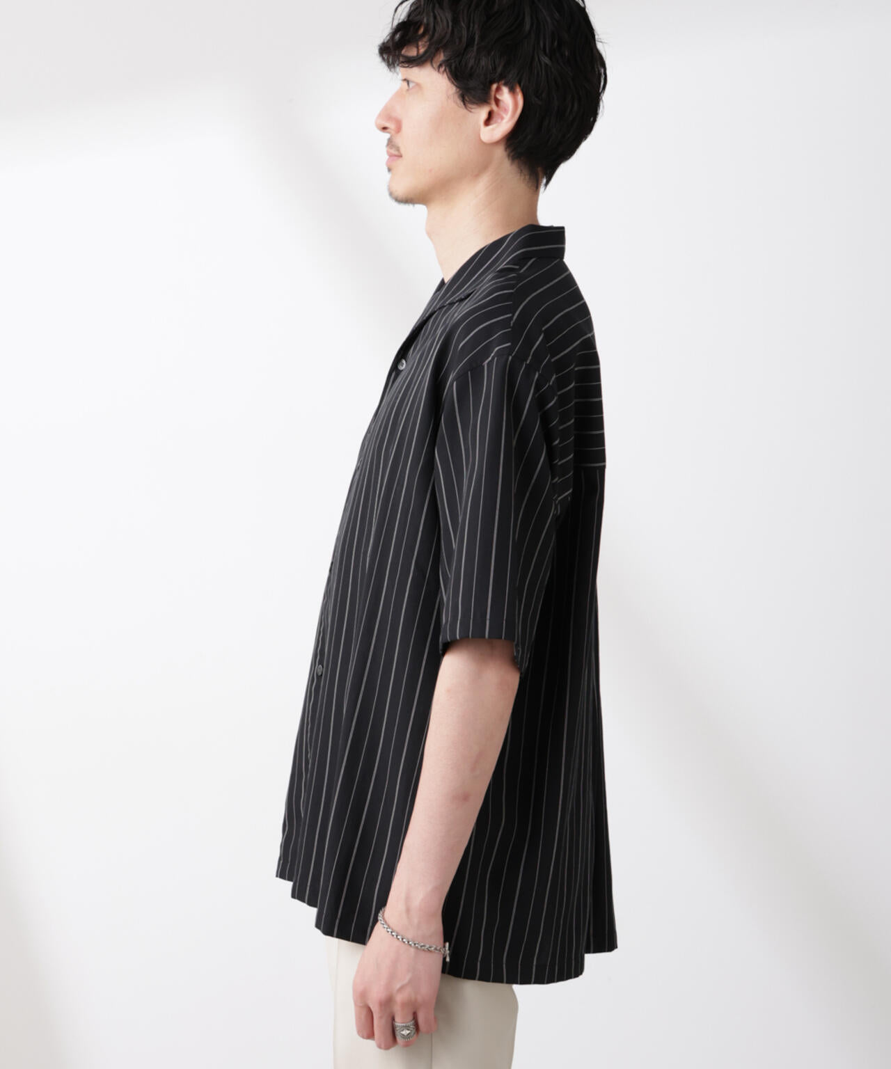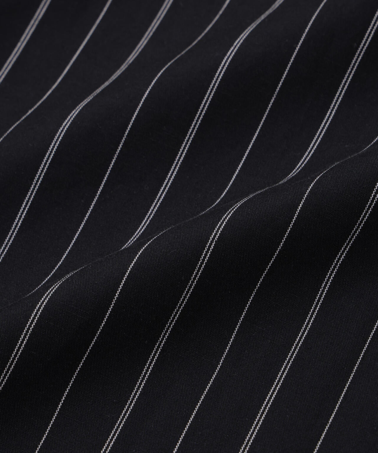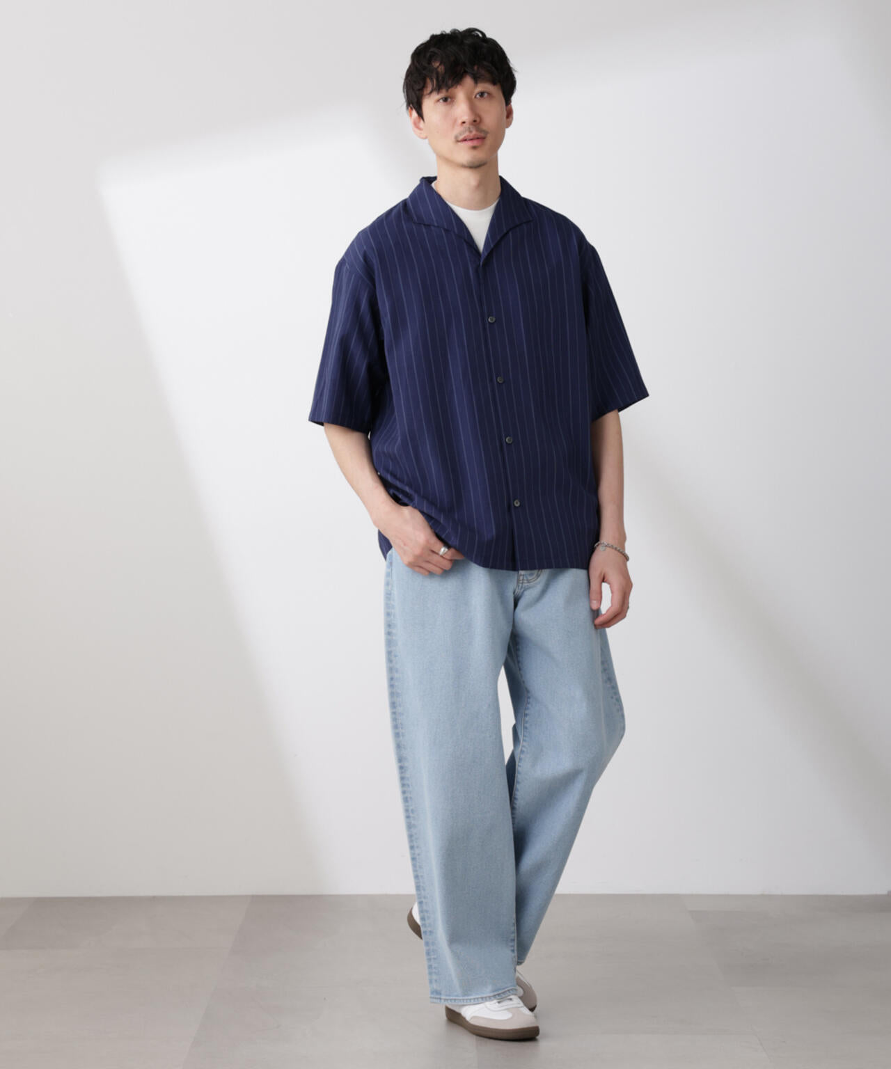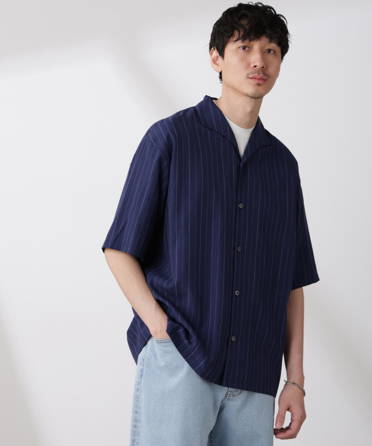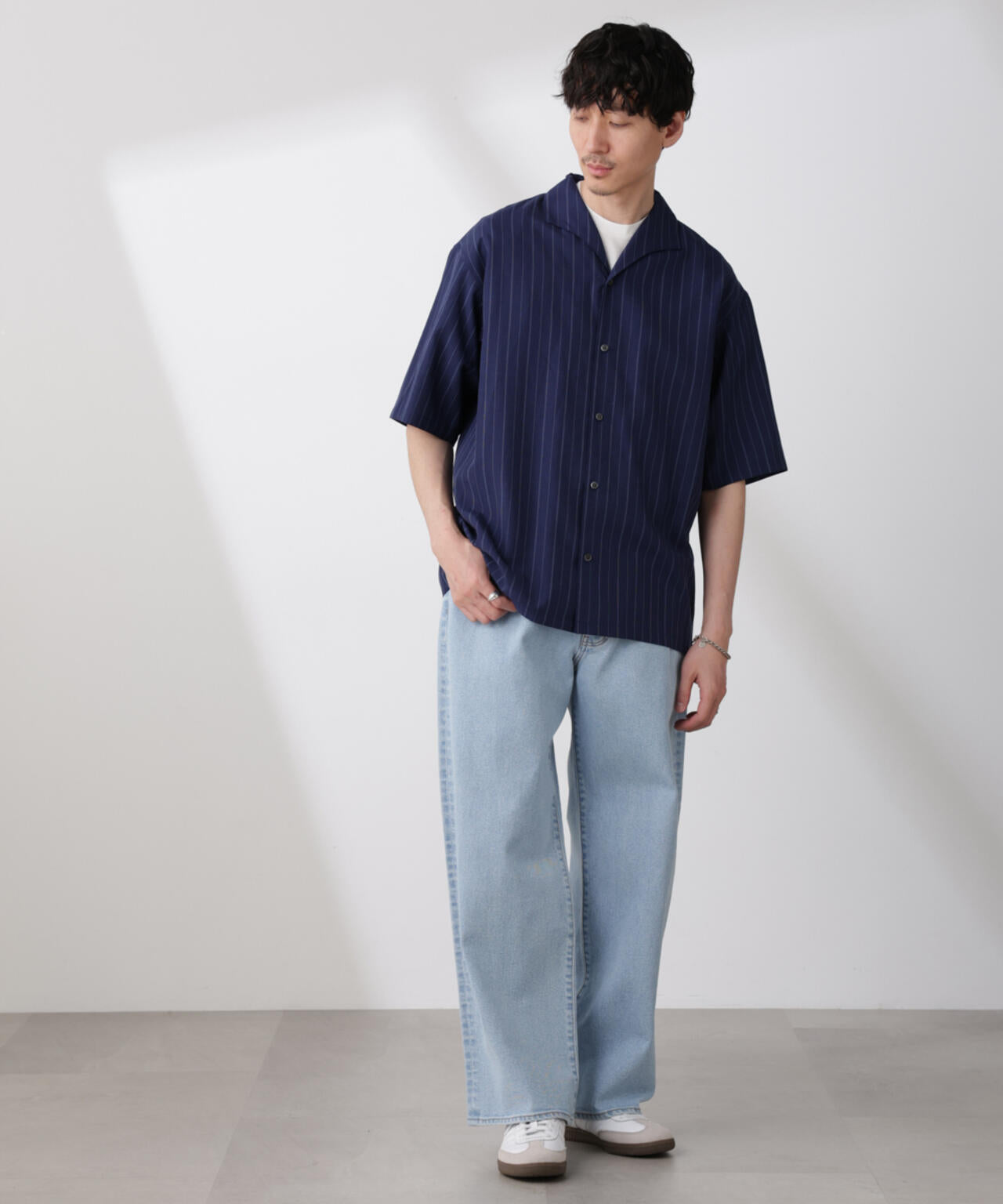 ワイドカラーがポイントでプレーンなシャツと一味違う雰囲気を出すシャツ。広めのピッチでストライプを配置しているので、ソリッドながら色気を感じる1枚です。