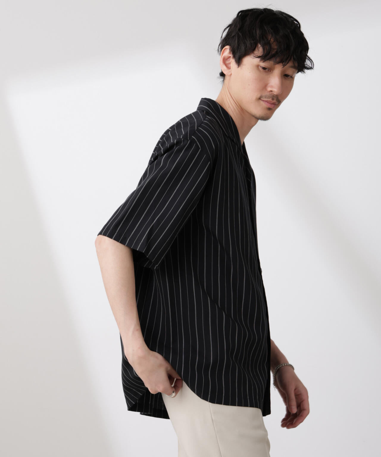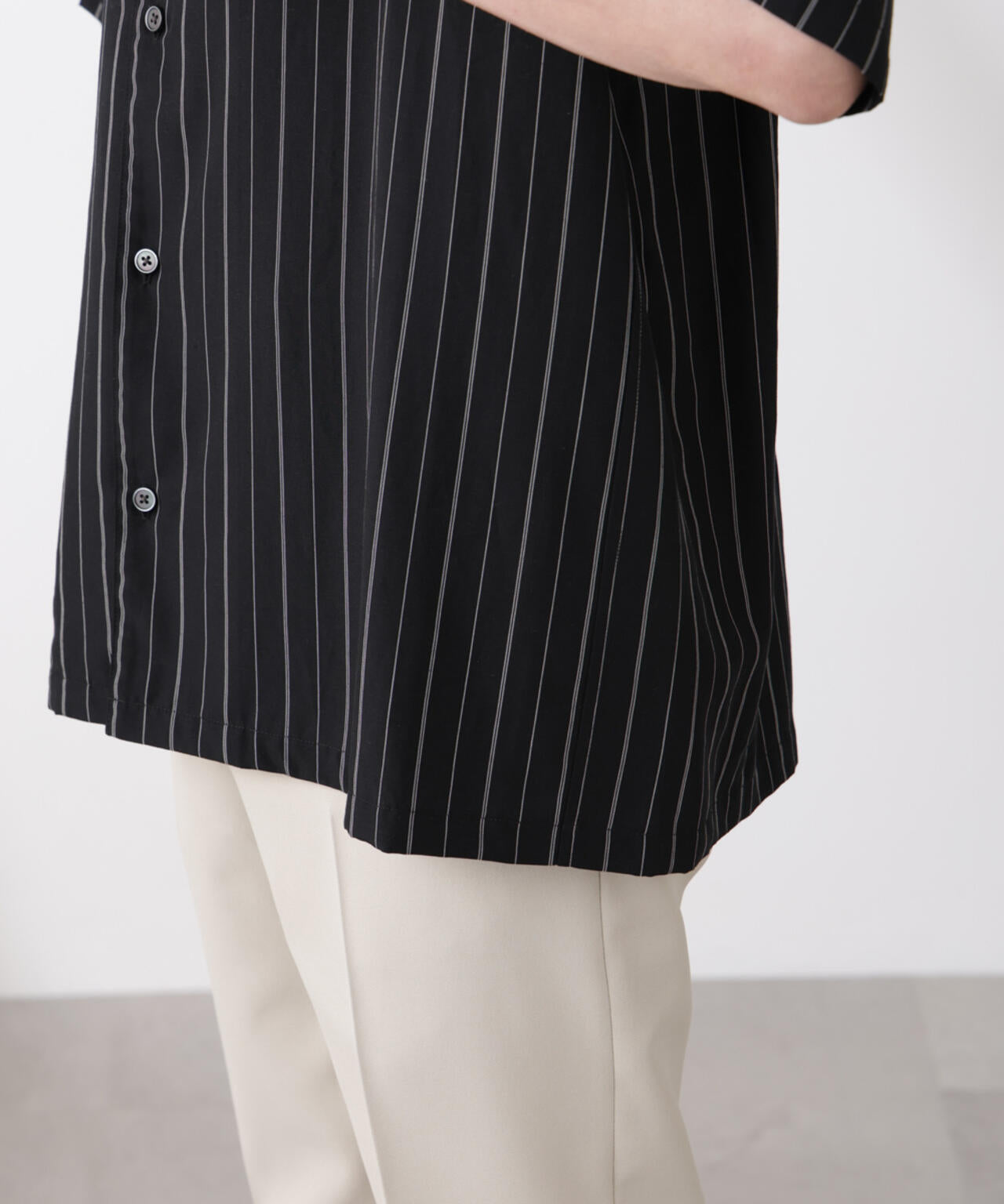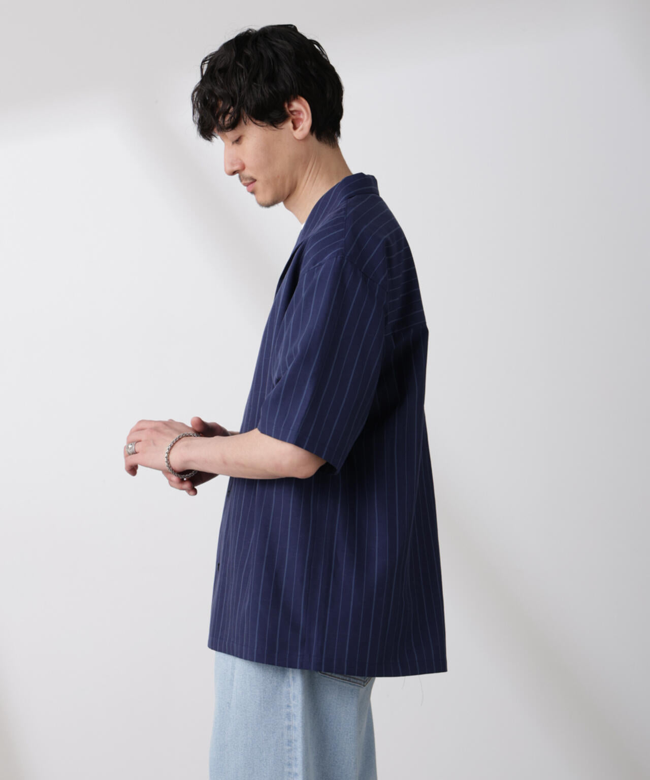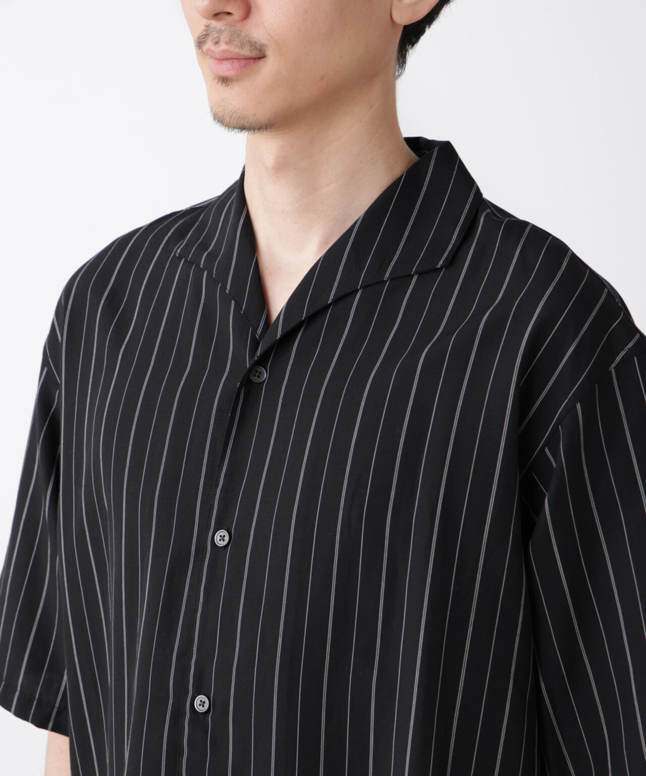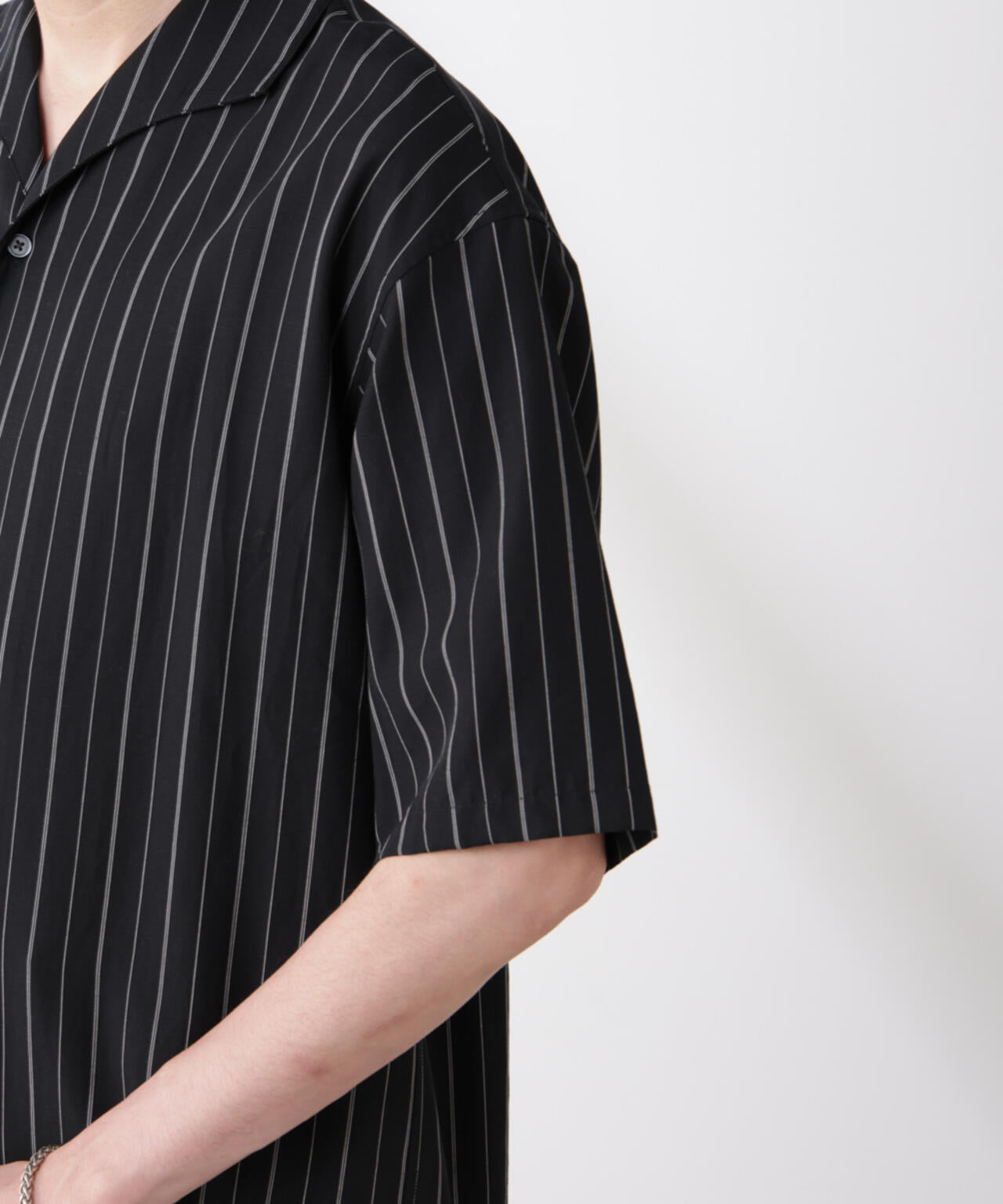 ワイドカラーがポイントでプレーンなシャツと一味違う雰囲気を出すシャツ。広めのピッチでストライプを配置しているので、ソリッドながら色気を感じる1枚です。