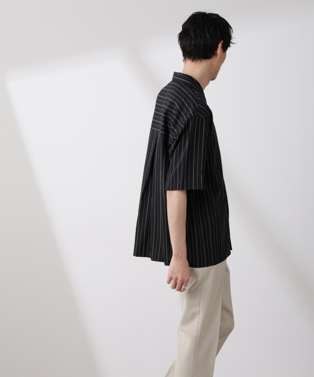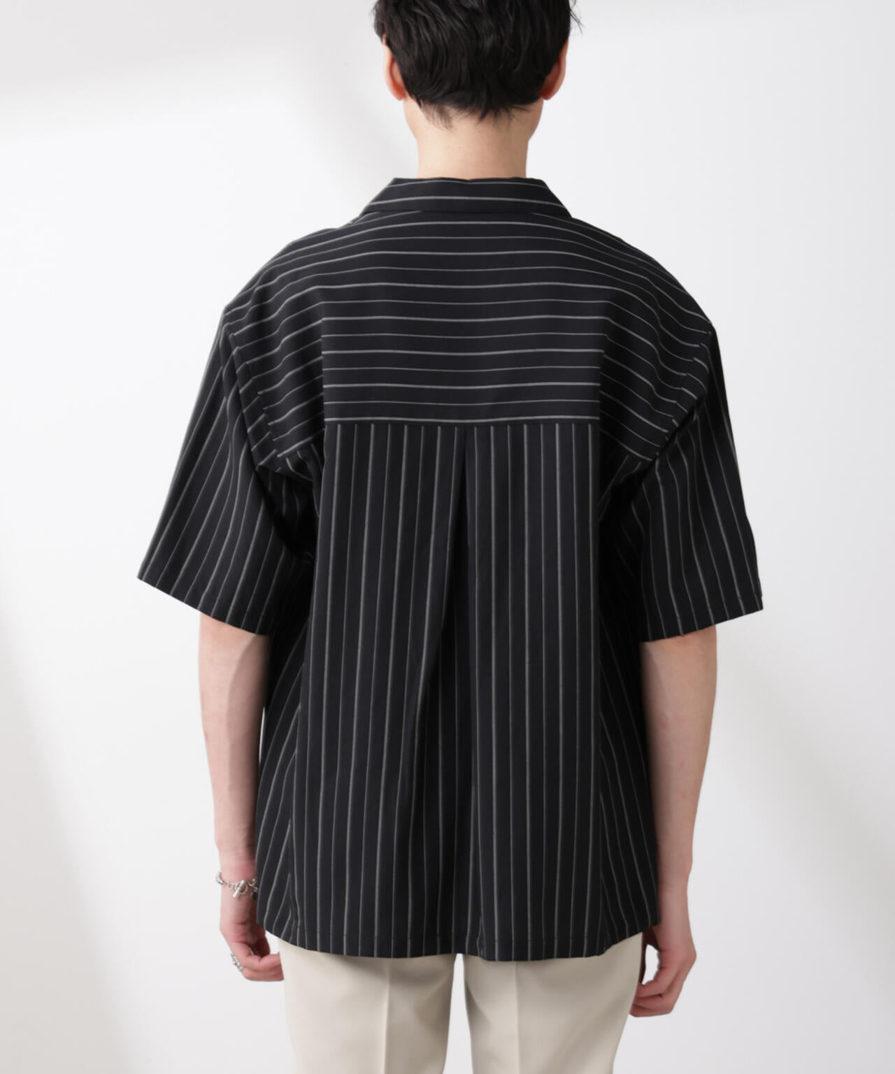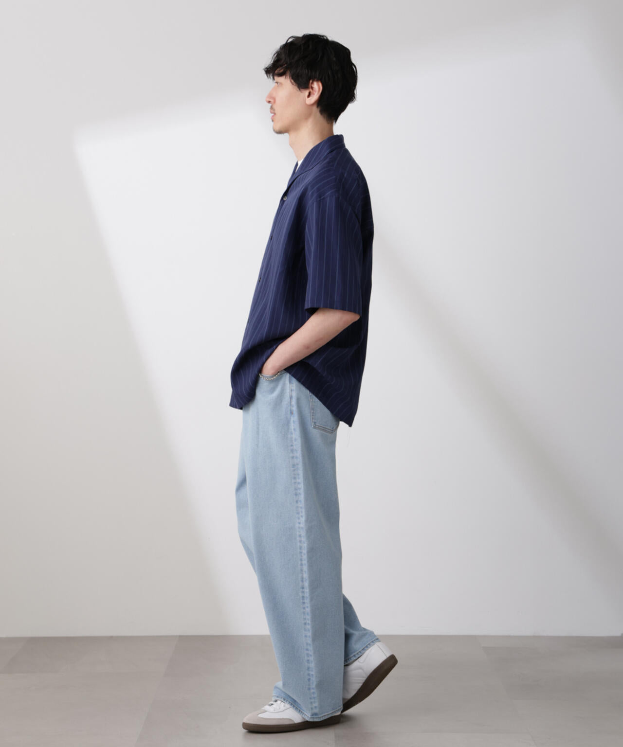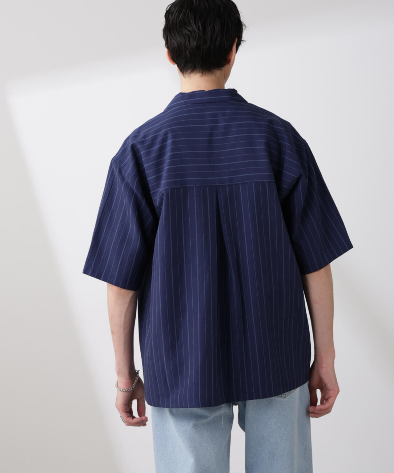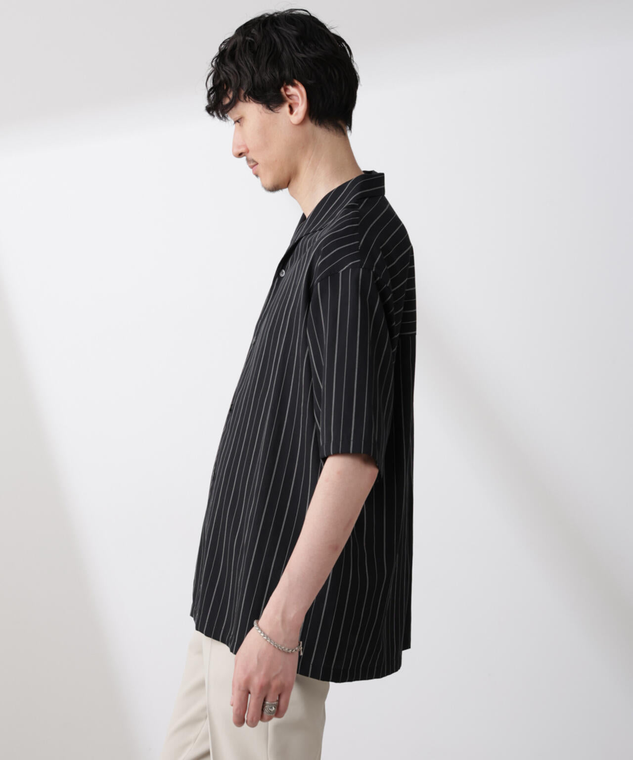 ワイドカラーがポイントでプレーンなシャツと一味違う雰囲気を出すシャツ。広めのピッチでストライプを配置しているので、ソリッドながら色気を感じる1枚です。