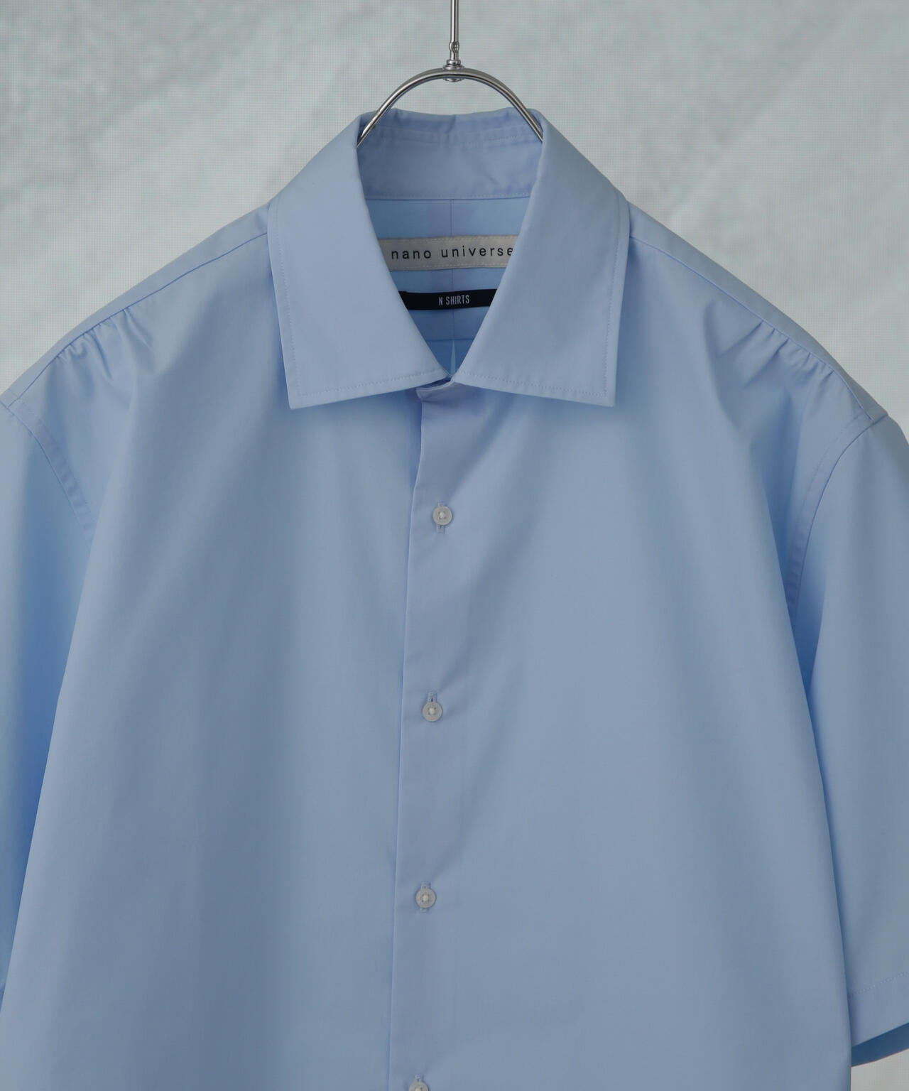 様々なスタイルに合わせやすいセミワイドカラーの半袖シャツ。前肩部分にギャザーを入れ腕周りの運動量を確保することで、動きやすく快適な着心地を提供。汗ばむ春夏のキレイめスタイルにおすすめの1着です。