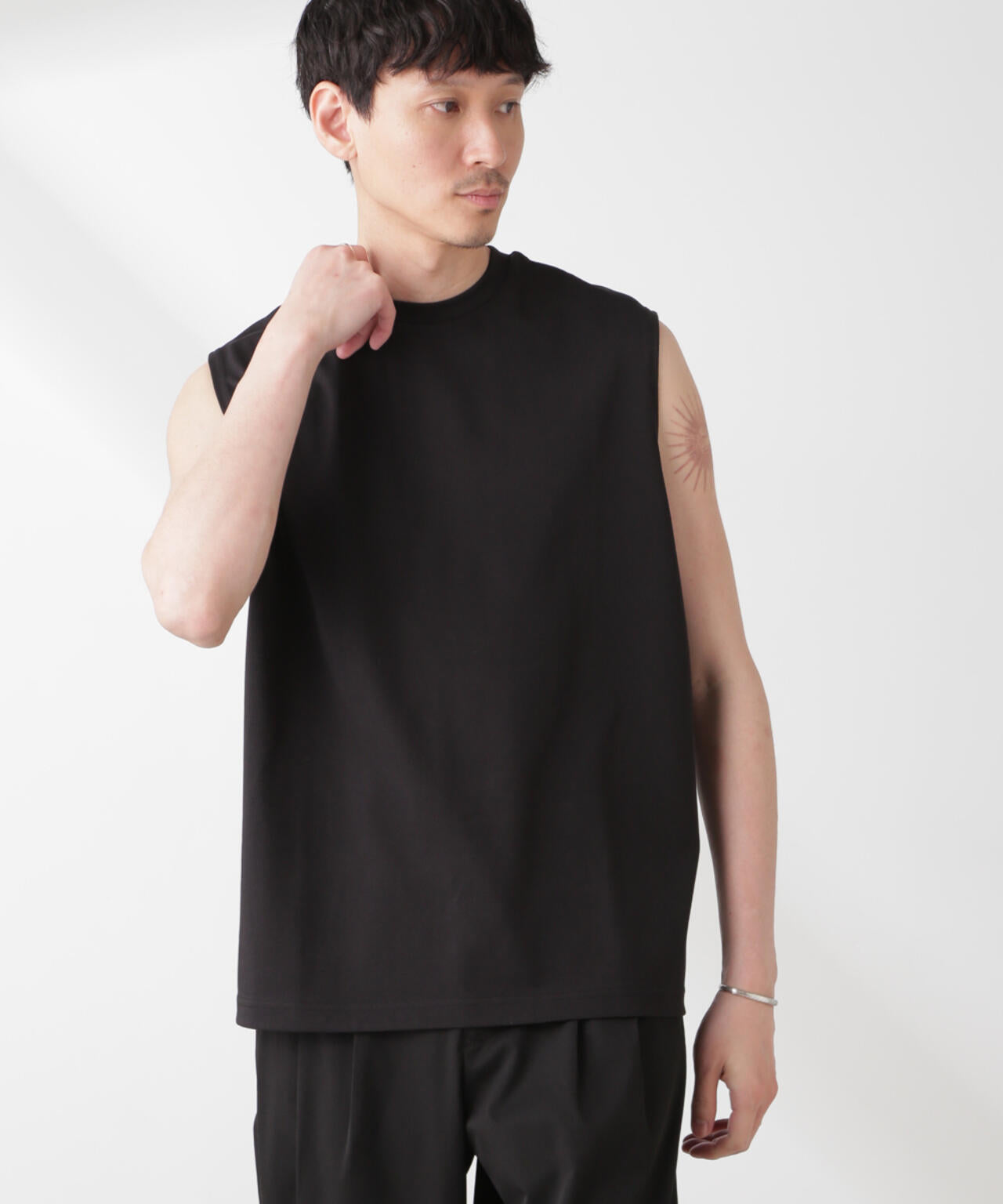 程よいゆとりを演出した清潔感のある仕上がりのノースリーブ。インナーとしてはもちろん、1枚着としてスラックスと合わせるなどモードな雰囲気を演出するのもおすすめ。