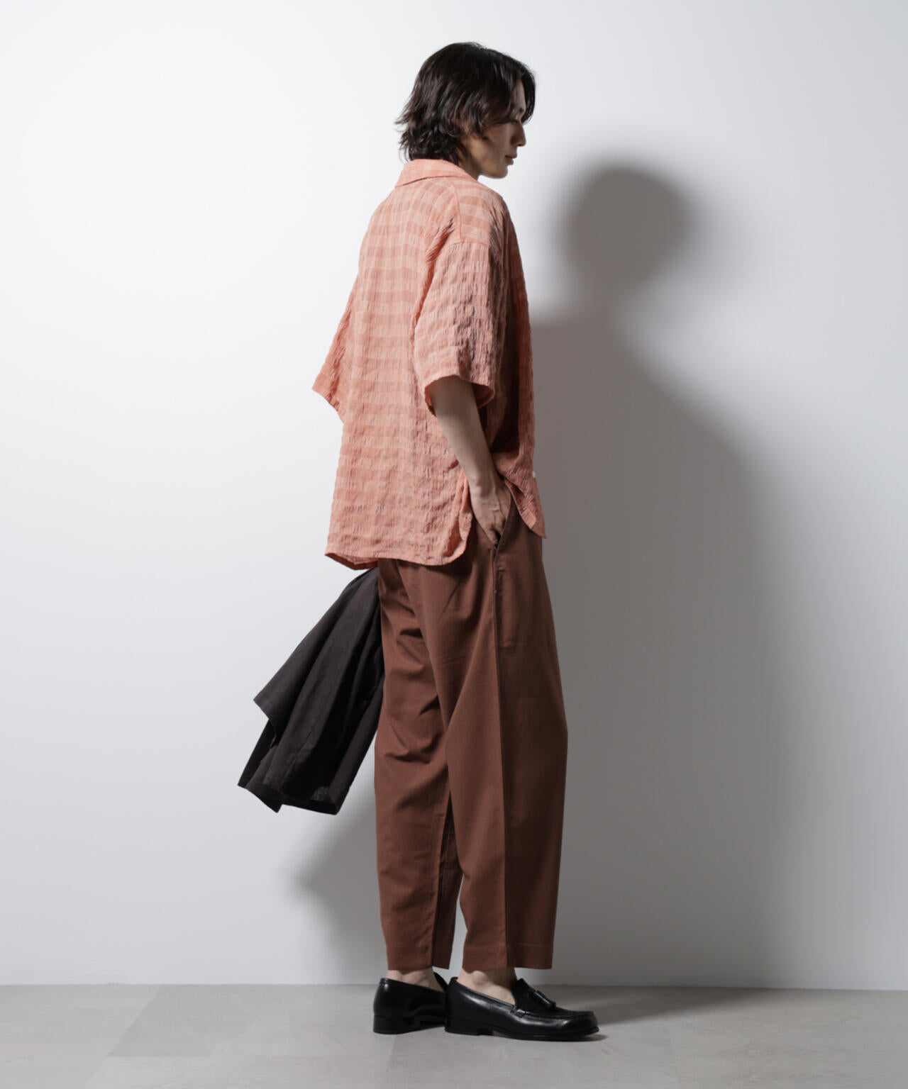 リネンミックスの平織の生地を使用したイージーパンツ。ウエストはゴムシャーリング&綿のきなりのスピンドルで、カジュアル感を出した仕様が特徴的な1本です。