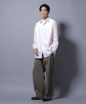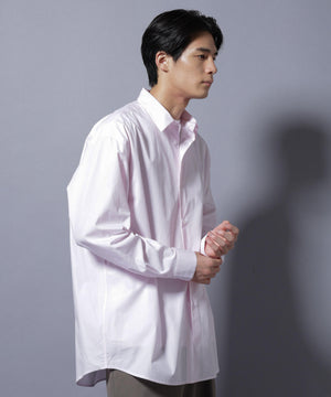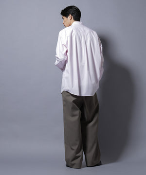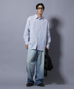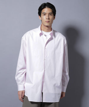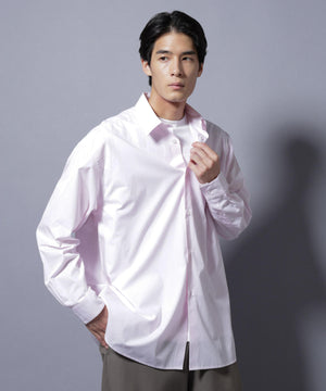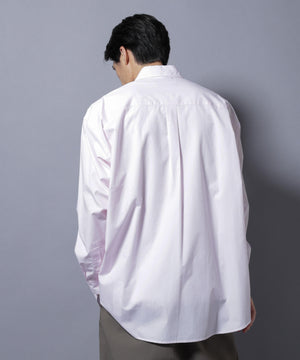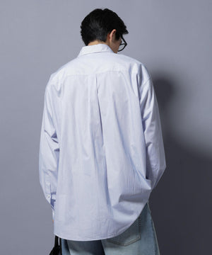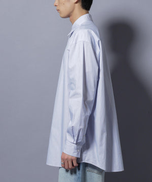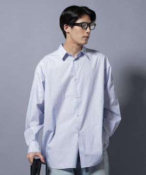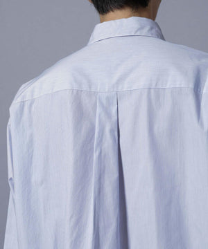 ドロップショルダーでボリューム感のあるボックスシルエットのオーセンティックなシャツ。肩の傾斜や、アームホルダーの広さなど、細かなディティールを特異なバランスで仕上げたシルエット。年間を通して軽い羽織りとしても、一枚でも活躍するアイテムです。