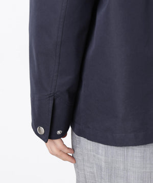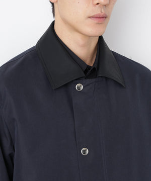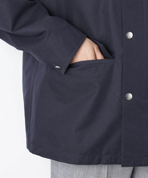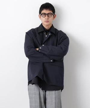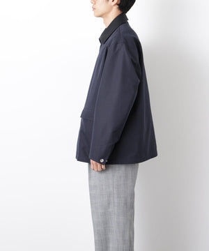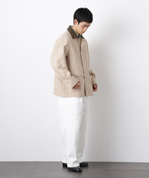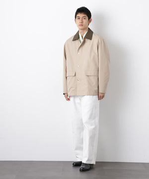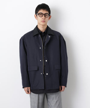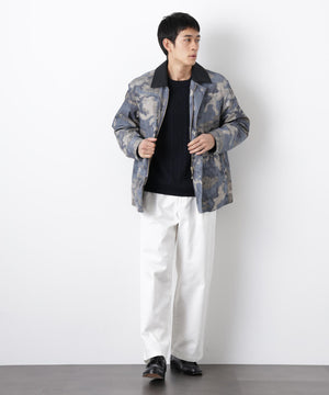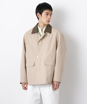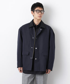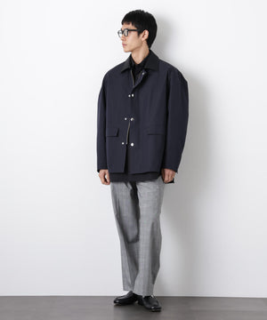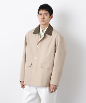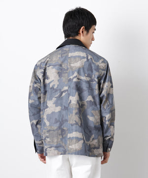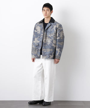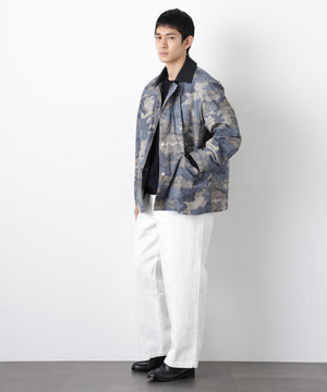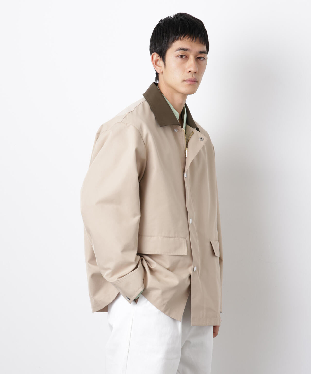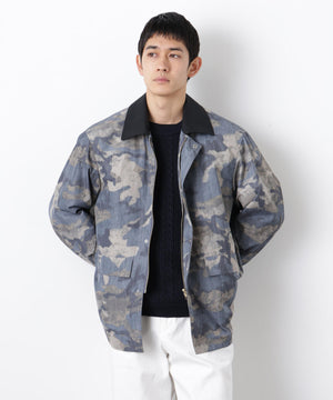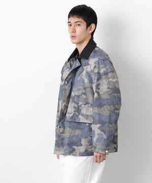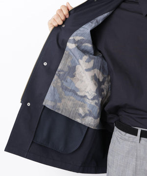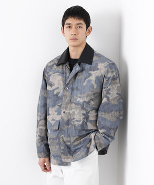 「WARP PRINT」という手法で、経糸のみにカモフラージュ柄をプリントした素材をライニングに採用したオーバーブルゾン。ブリティッシュな短丈カーコートをモチーフに、着丈が短めなオーバーブルゾンに仕上げました。