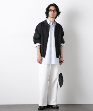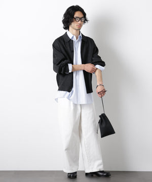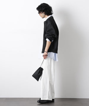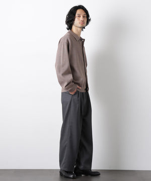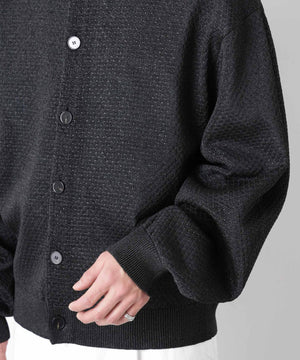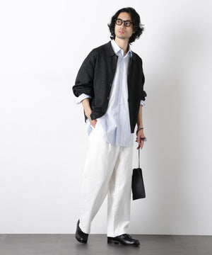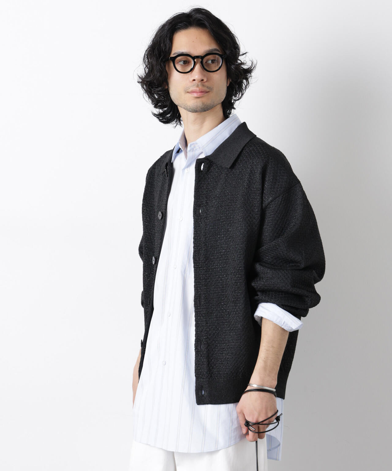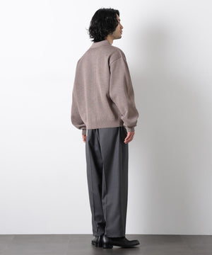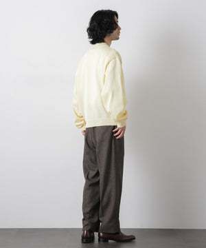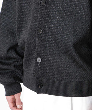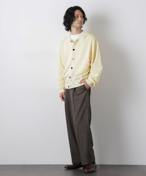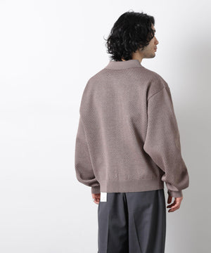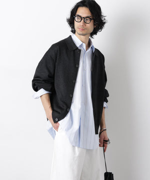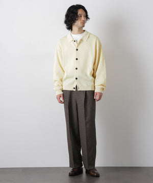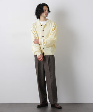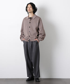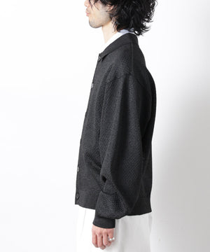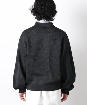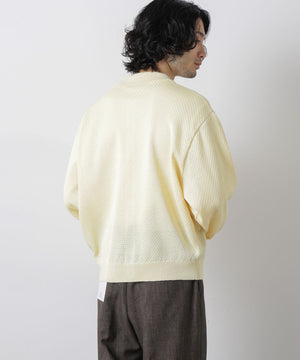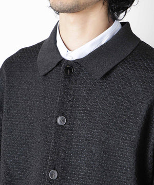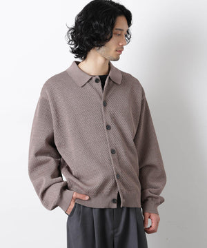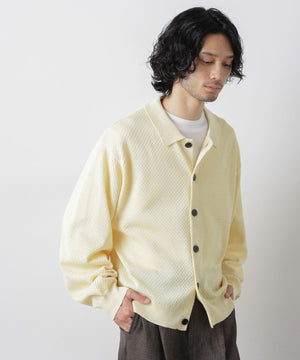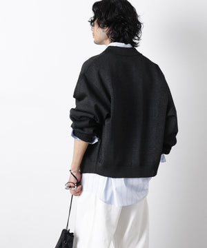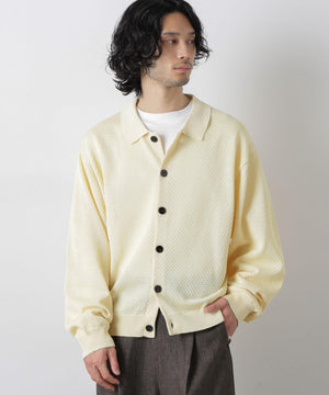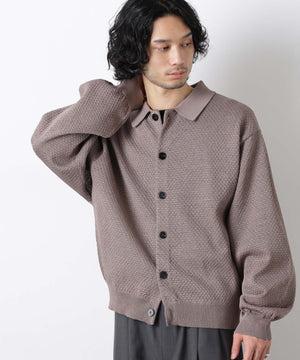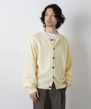 ポリエステル素材にギマ加工を施し、麻のようなシャリ感と光沢感を表現した、ありそうでなかったニット。若い世代に人気のポロカラーのカーディガンデザインを採用した春先におすすめに一枚です。