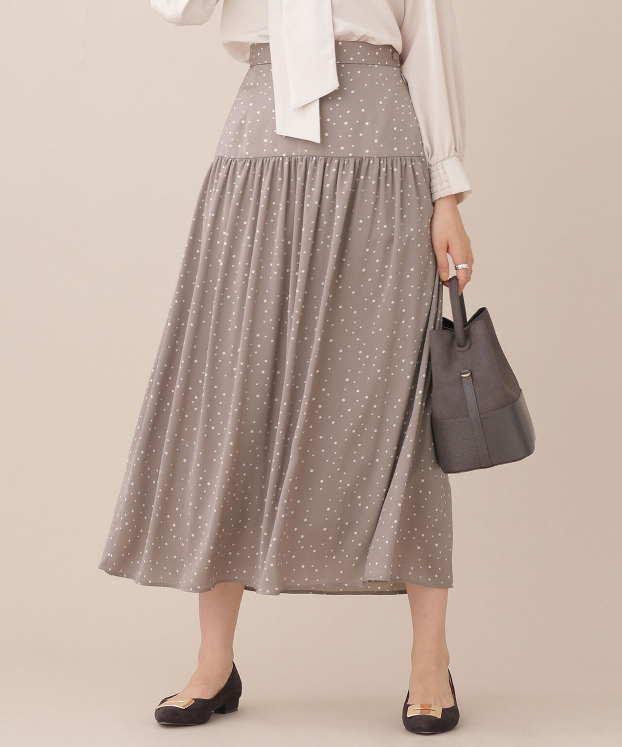 大人っぽく仕上がるランダムなドット柄が上品なロングスカート。脚長効果が狙えるヒップ上の切り替え位置にデザインしたティアードがフェミニン。落ち感のある素材がきれい見えするので、カジュアルなTシャツ合わせもサマになる女度高めなアイテムです。