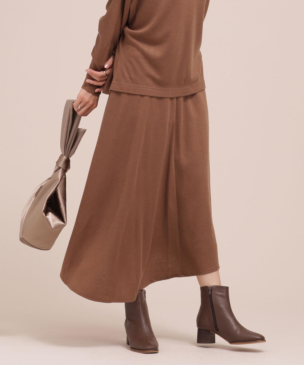美しいシルエットが魅力のイレギュラーヘムフレアスカート。伸縮性のあるジャージ素材で、リラクシーながらも落ち感があるエレガントな一枚。ブーツとも好相性な着丈で合わせやすく、同シリーズのトップスとセットアップコーデもおすすめです。