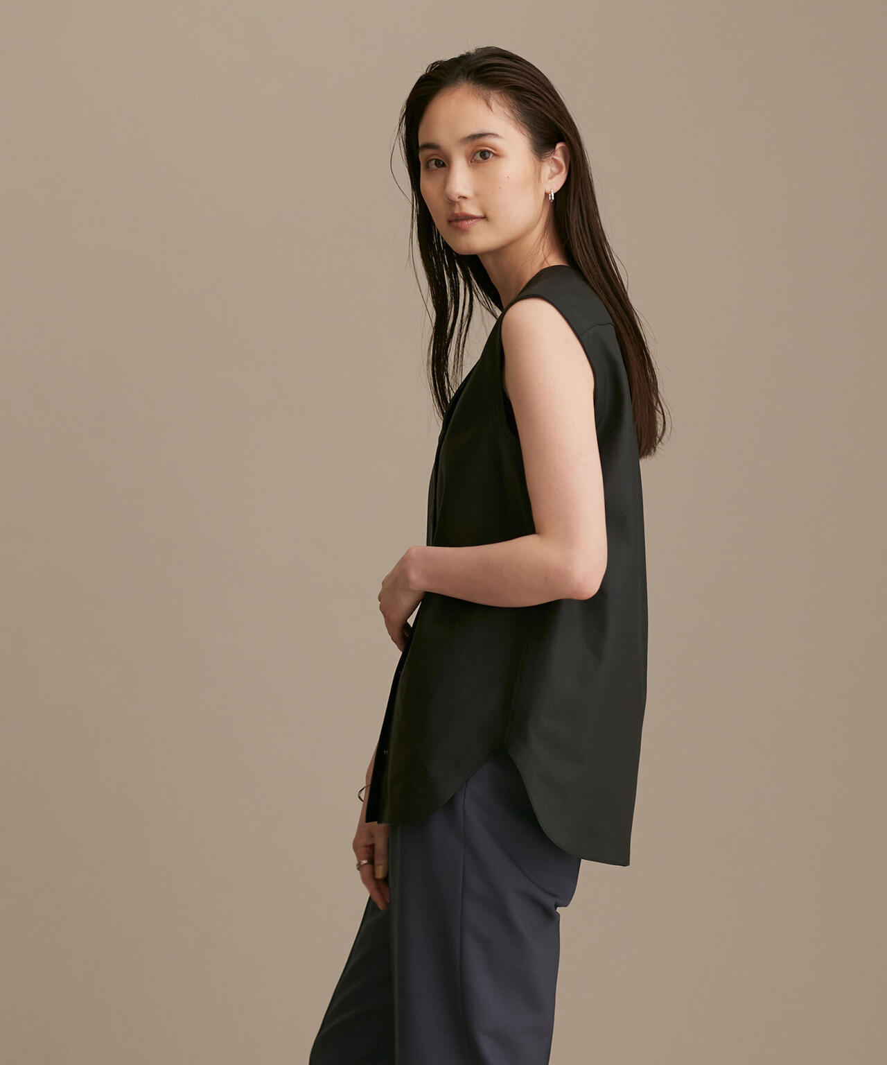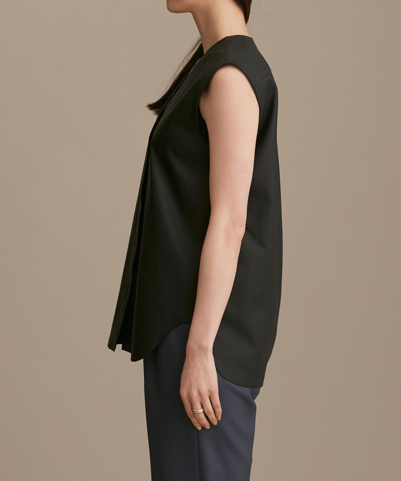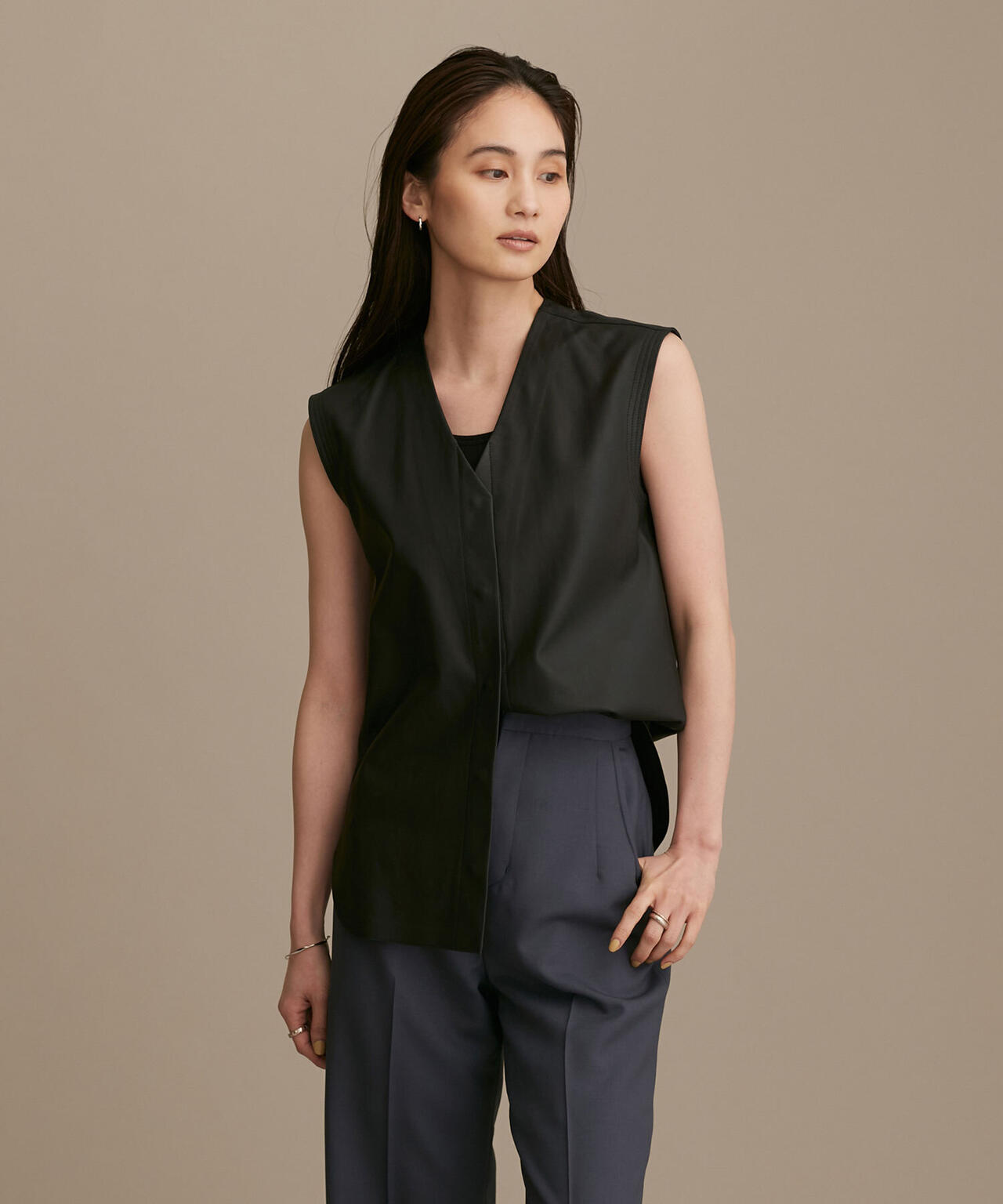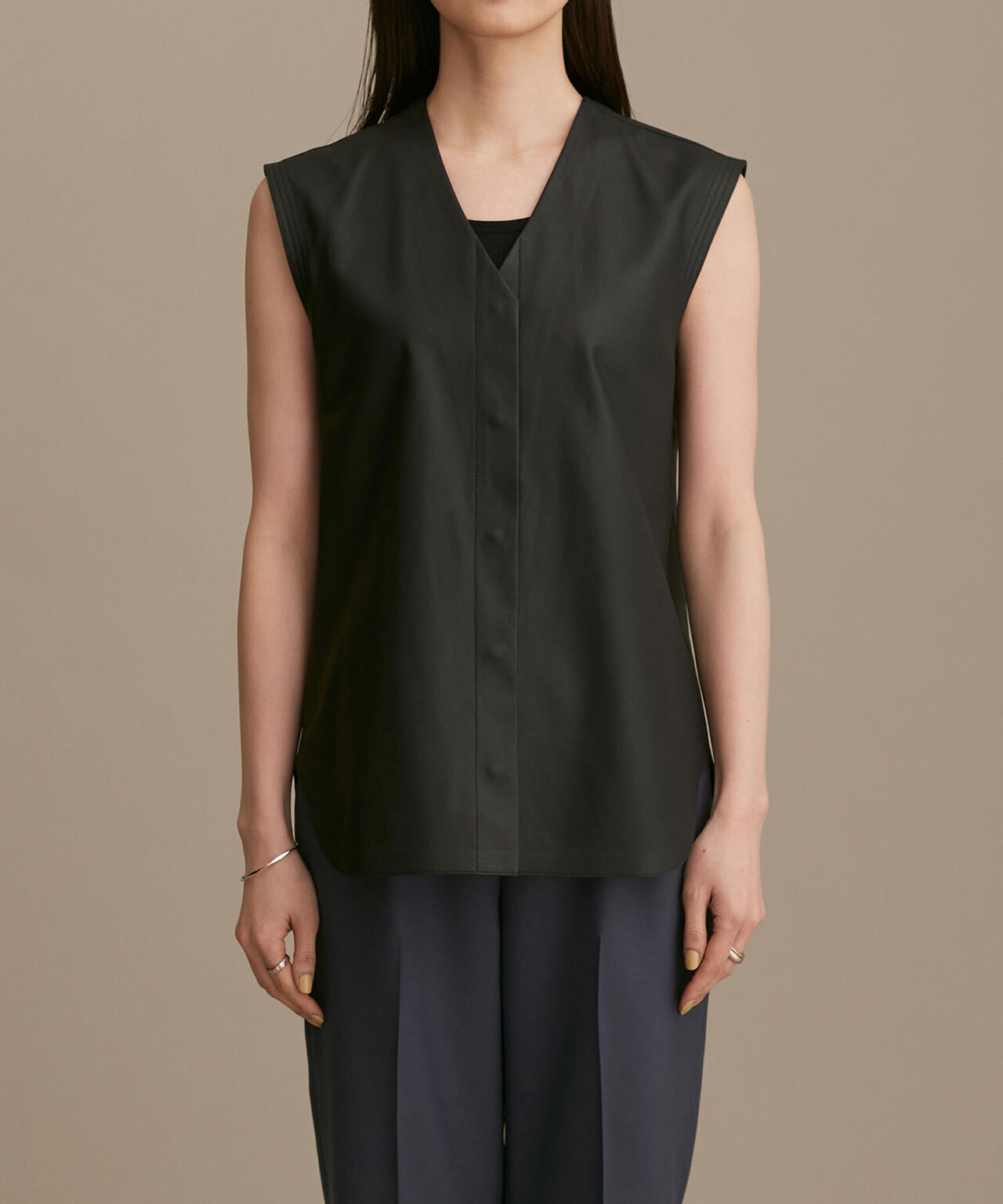 しなやかなラムレザーで仕立てた高級感漂うジレ。フロントの隠しドット釦はあたりをつけて凹凸感を出したり、アームのステッチを効かせるなどディテールにも拘りました。Tシャツやノースリーブ、ドレスなどに羽織って、旬な大人のレイヤードを楽しめる1着です。