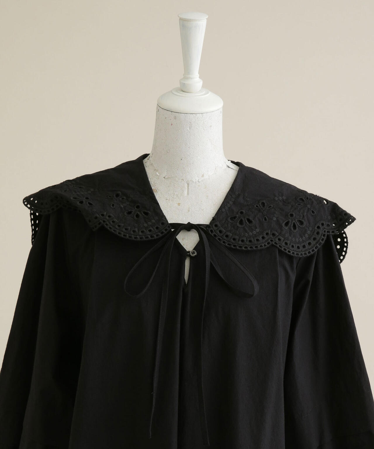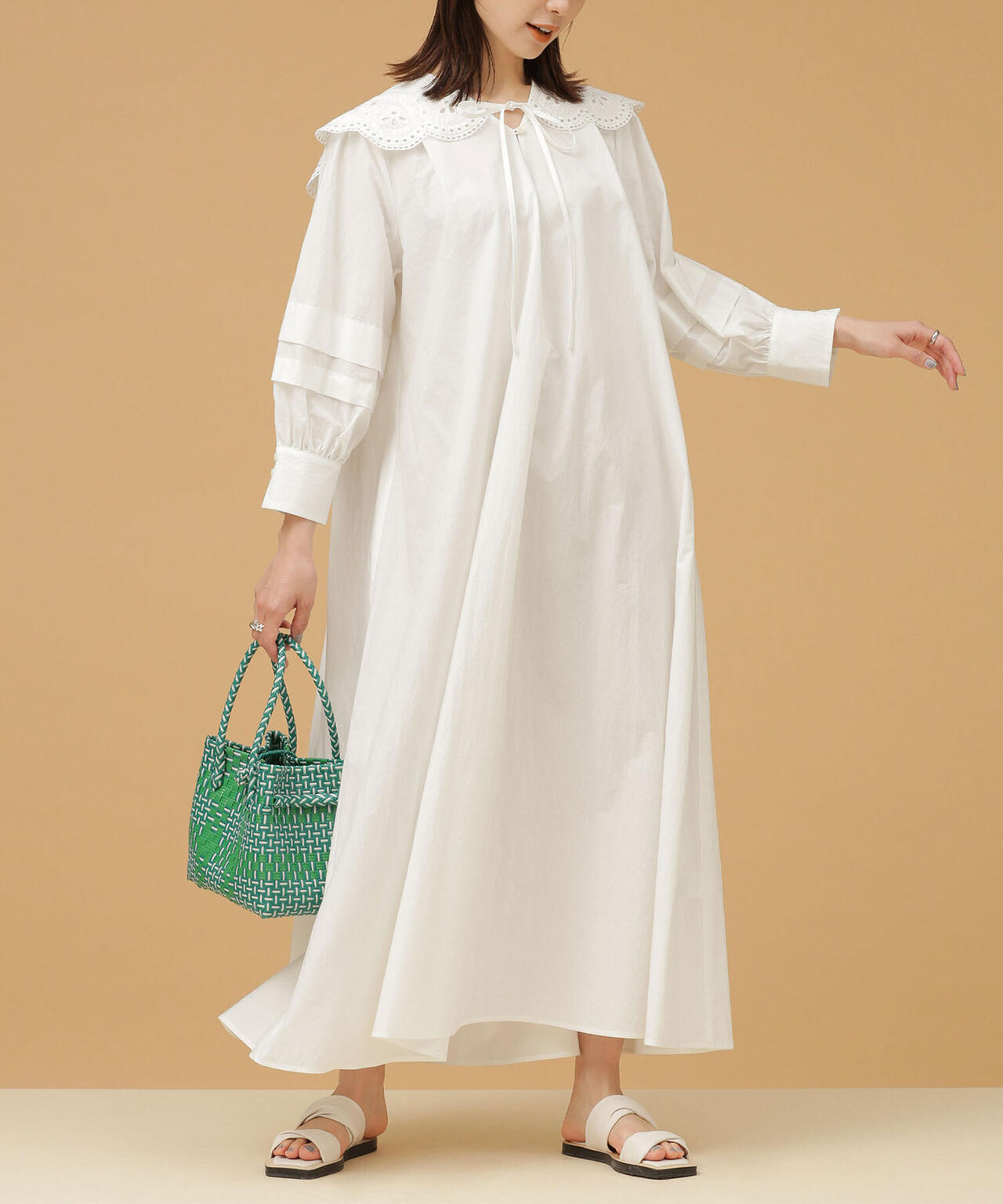 繊細なアイレット刺繍を大き目の衿にあしらった大人フェミニンなワンピース。裾にかけて広がるAラインシルエットや、ボリュームスリーブが女性らしさを加速。1枚でコーディネートが様になるから、忙しい朝も味方になってくれるひと品です。