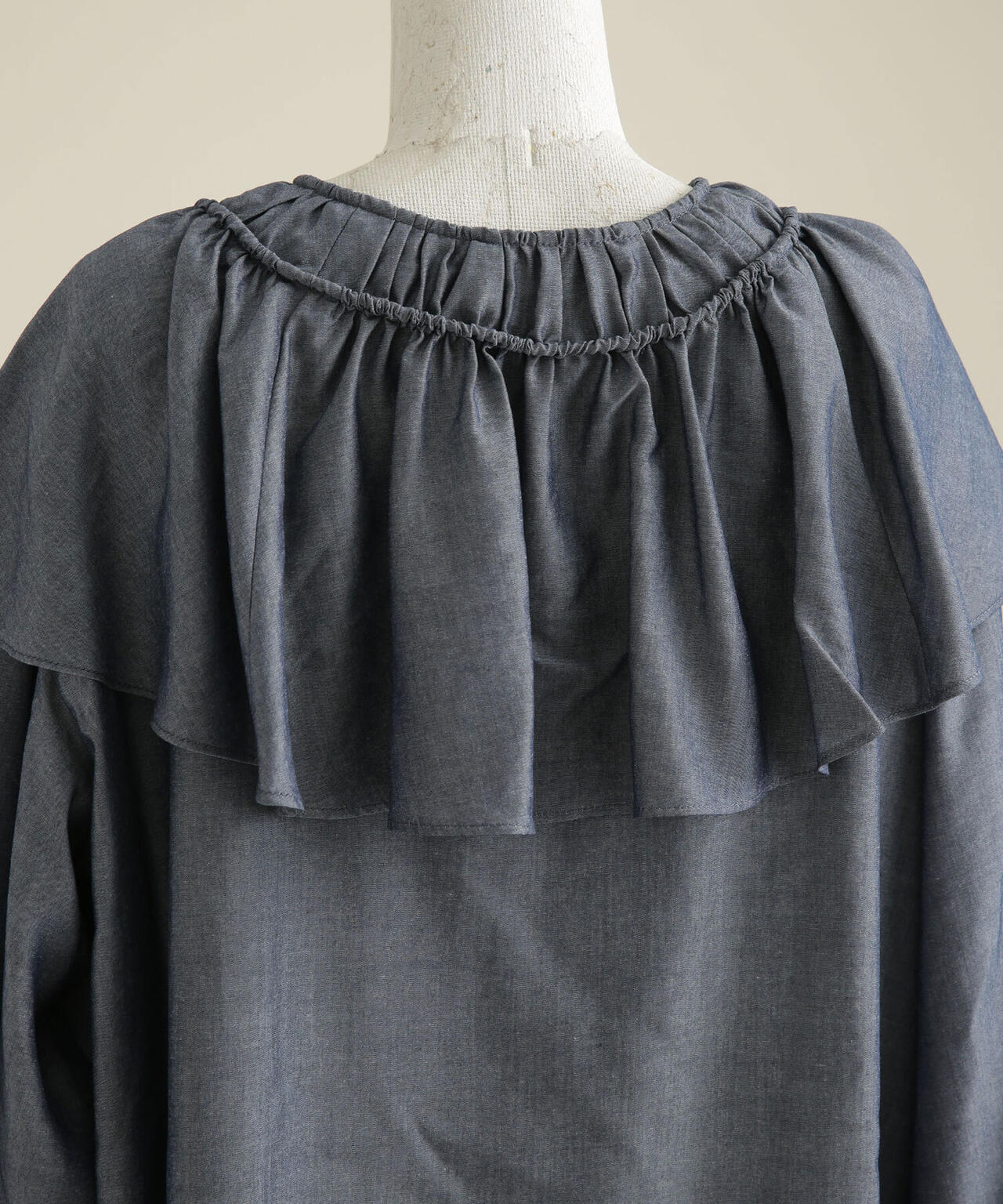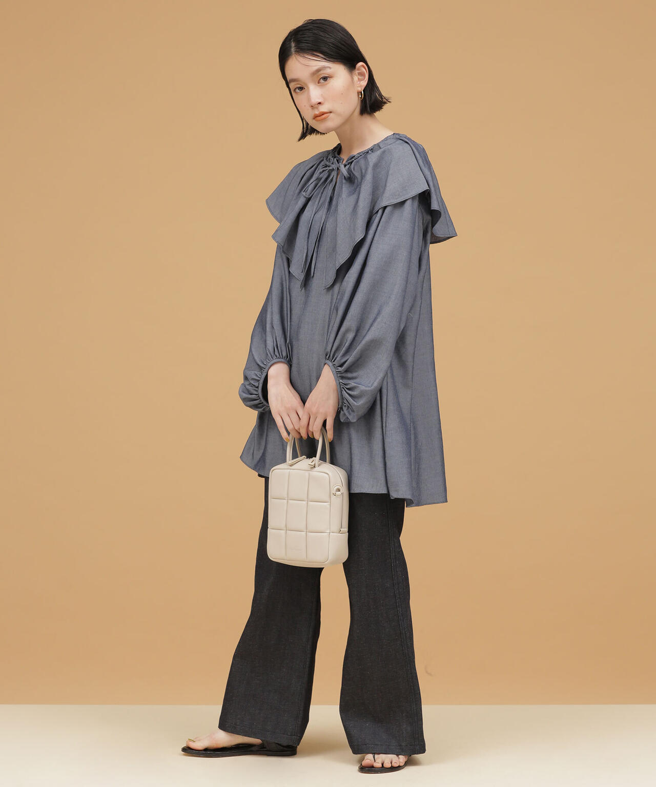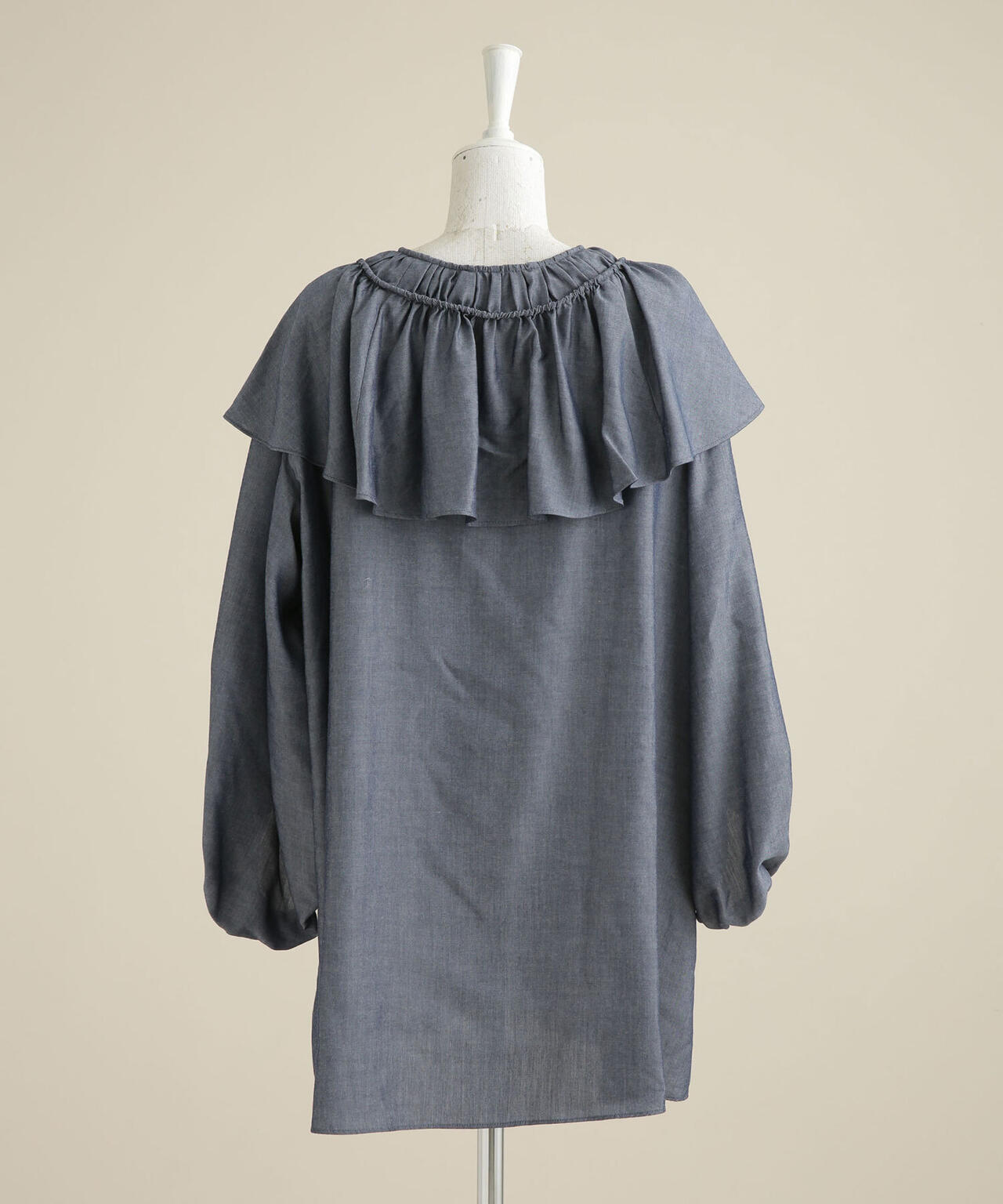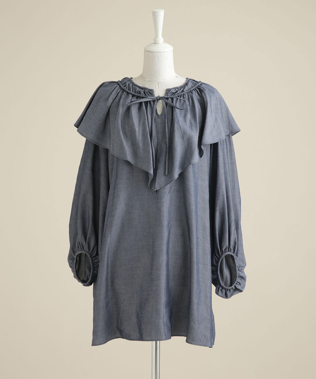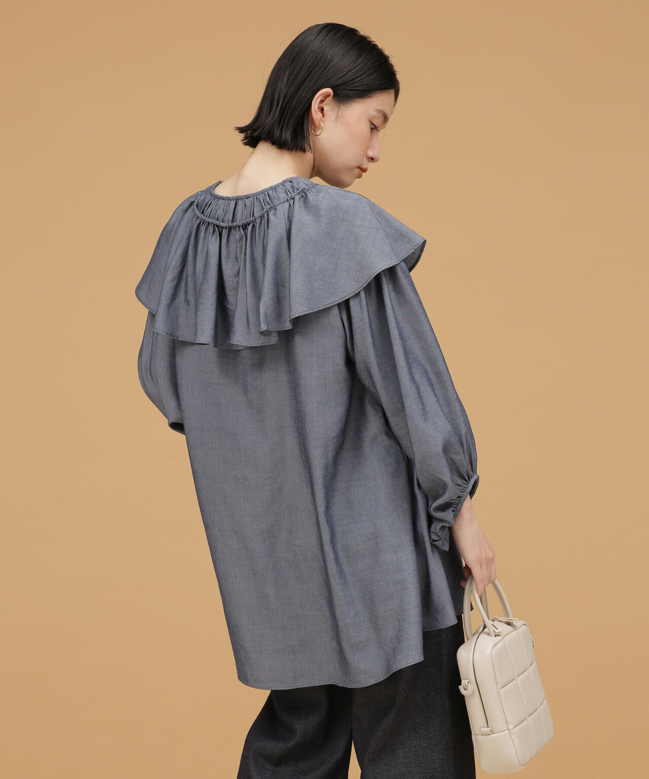 大きな襟のようなラッフルデザインが印象的なブラウス。ふんわりとしたパフスリーブや、エアリーなAラインシルエットが女性らしさを加速します。ニットカーディガンなどを羽織って、襟を出すレイヤードスタイルもおすすめです。