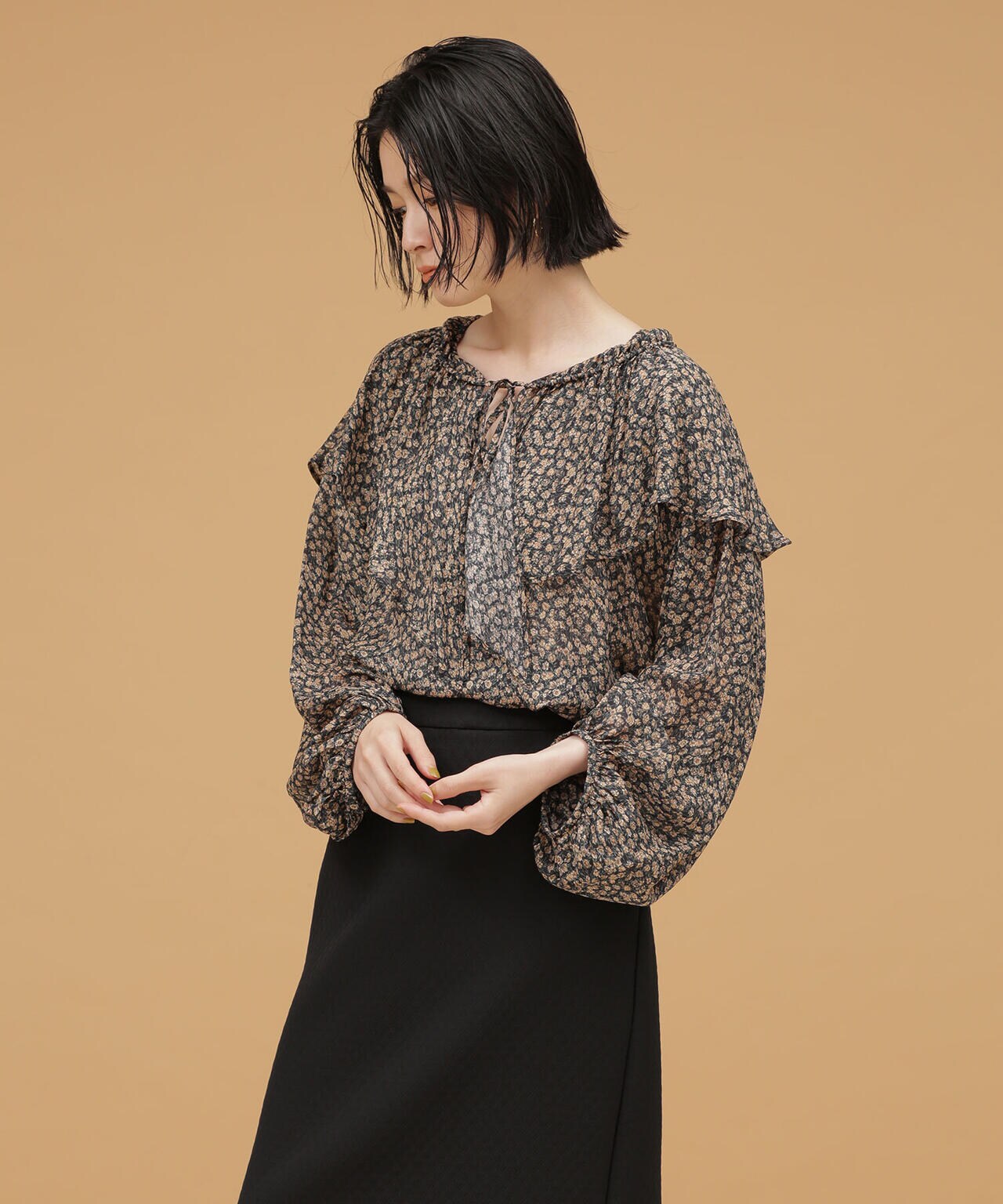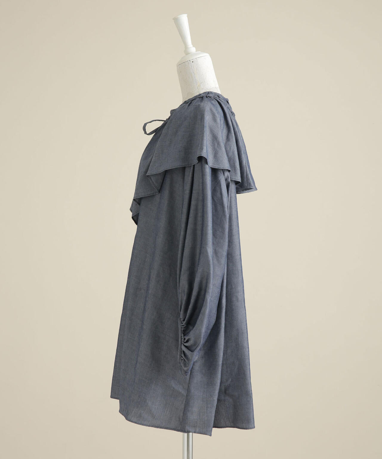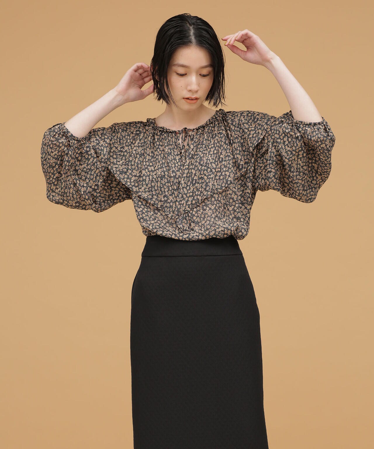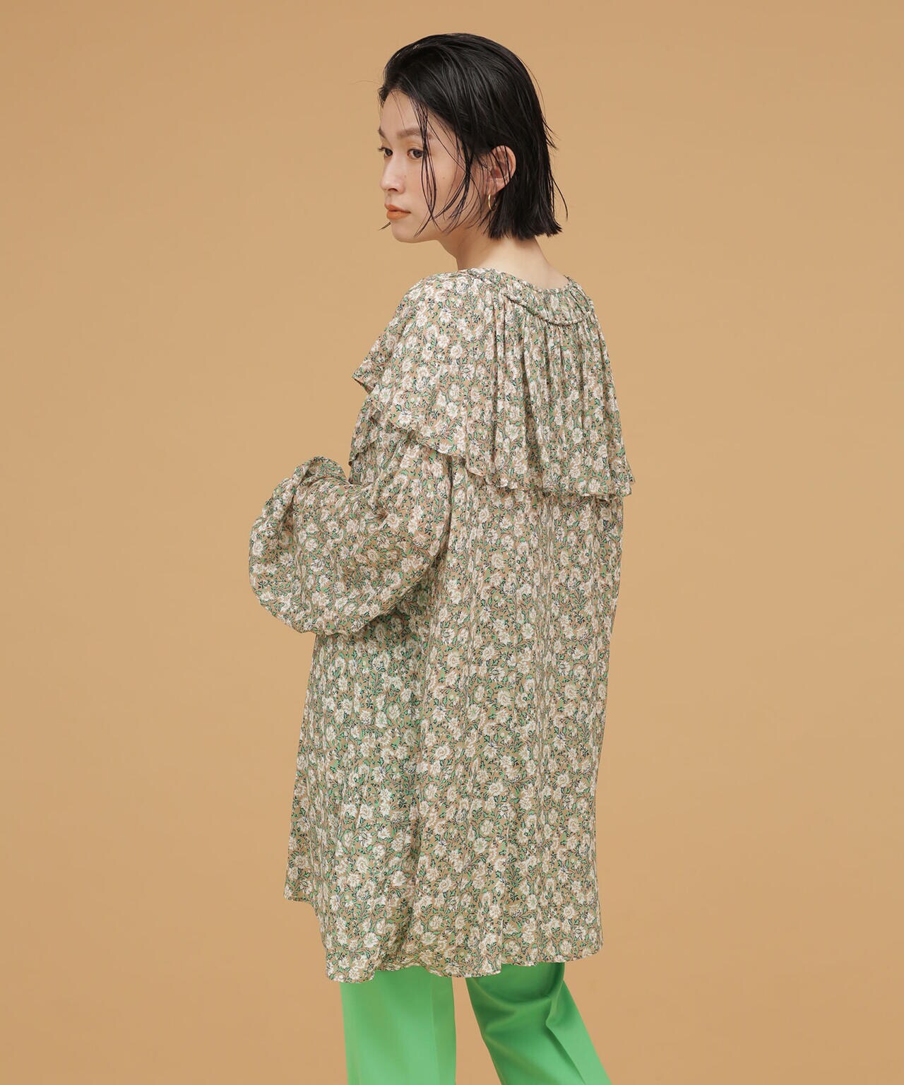 大きな襟のようなラッフルデザインが印象的なブラウス。ふんわりとしたパフスリーブや、エアリーなAラインシルエットが女性らしさを加速します。ニットカーディガンなどを羽織って、襟を出すレイヤードスタイルもおすすめです。