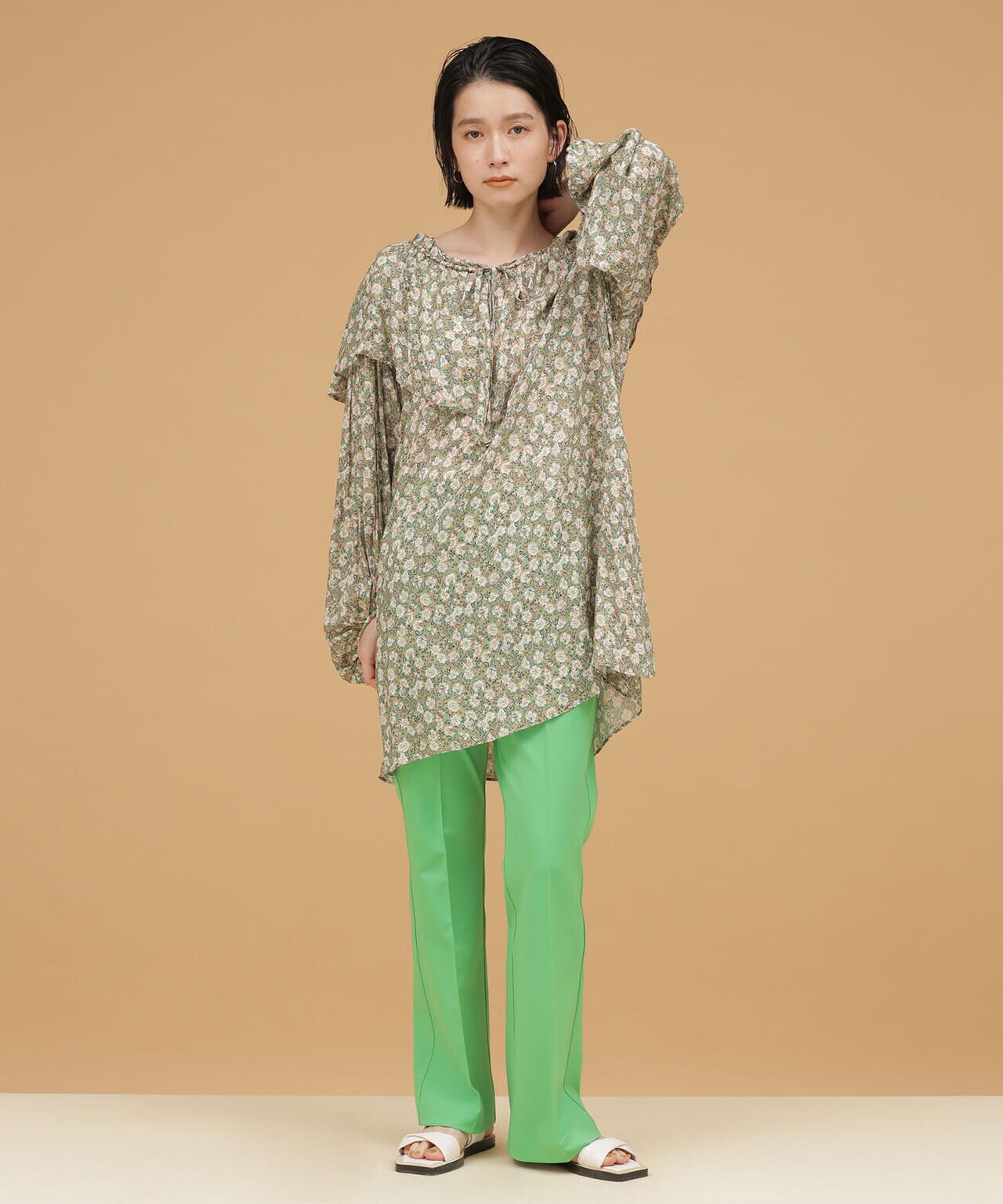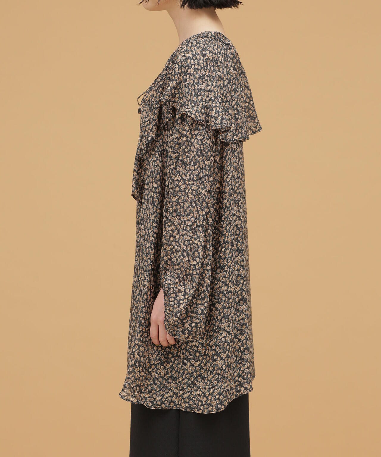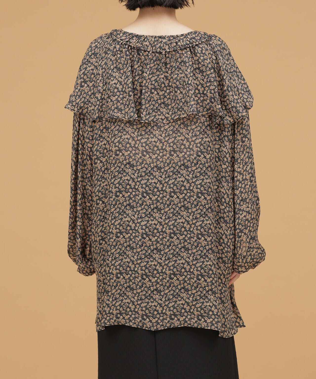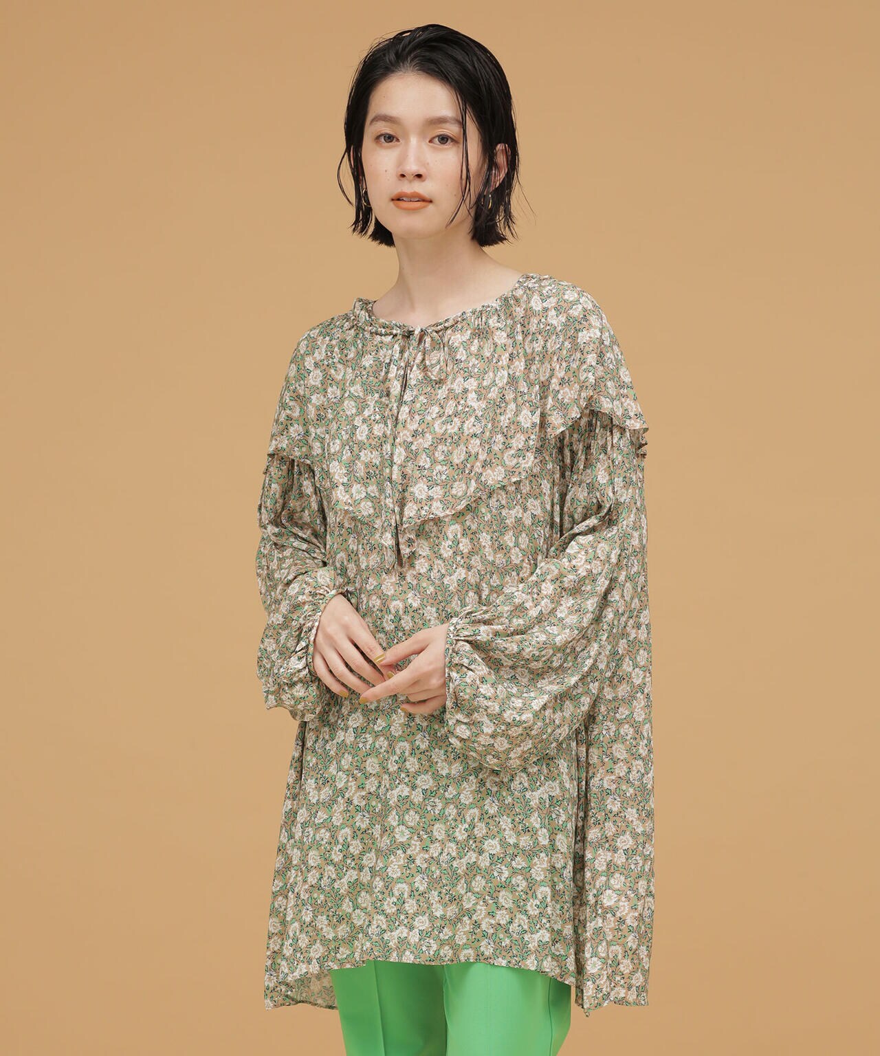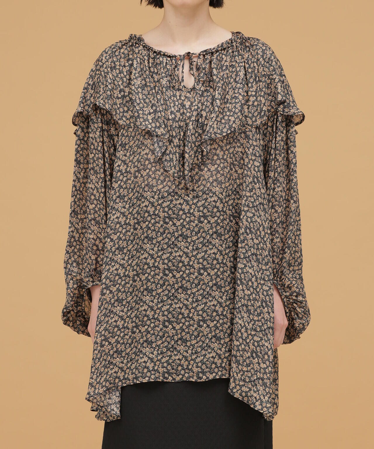 大きな襟のようなラッフルデザインが印象的なブラウス。ふんわりとしたパフスリーブや、エアリーなAラインシルエットが女性らしさを加速します。ニットカーディガンなどを羽織って、襟を出すレイヤードスタイルもおすすめです。