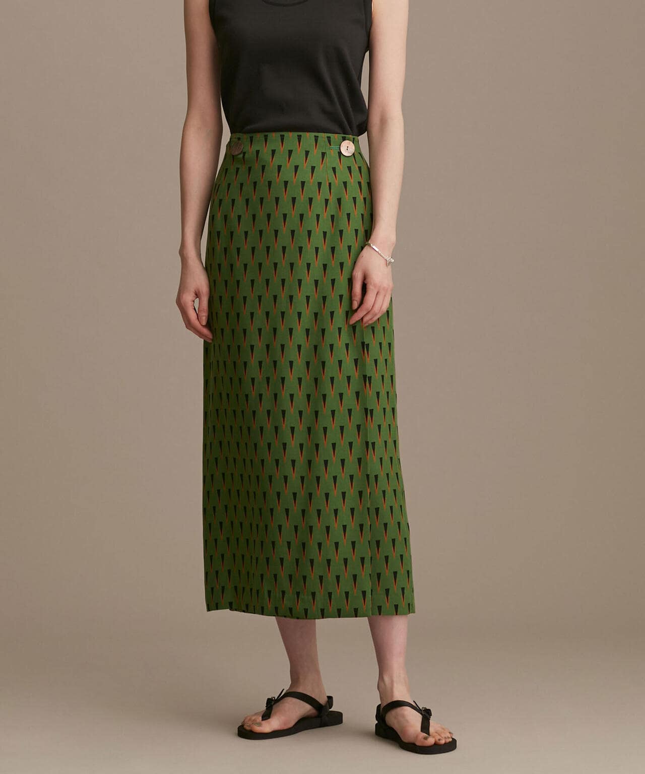 深みのある色合いのバティック柄が印象的な、Iラインの巻きスカート。上品に合わせられるロング丈で、フラットなサンダル合わせで真夏でも履きやすいデザイン。同素材のシャツとセットアップはもちろん、デイリーからリゾートシーンまで幅広く頼れる1枚です。
