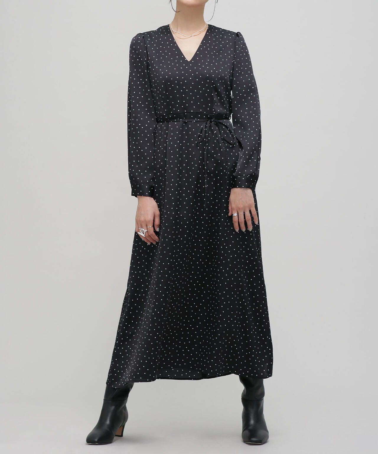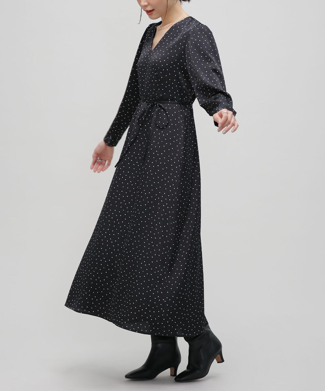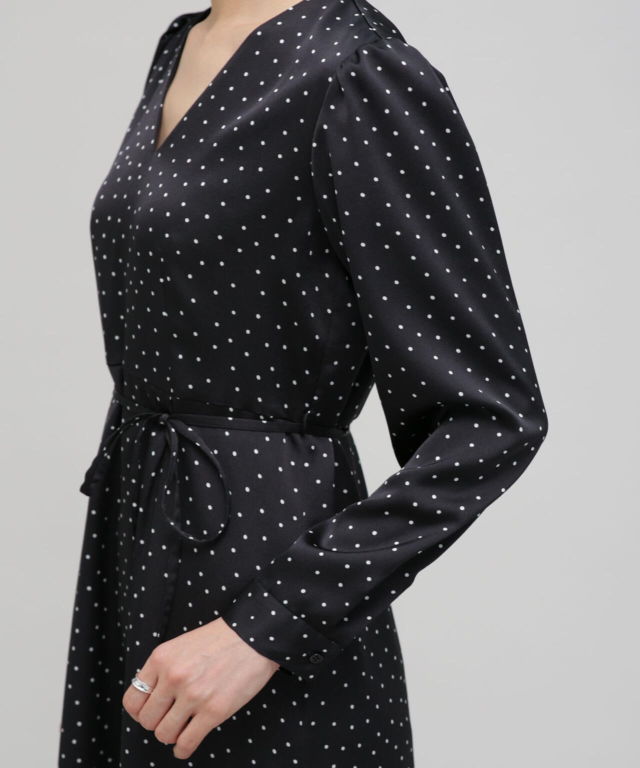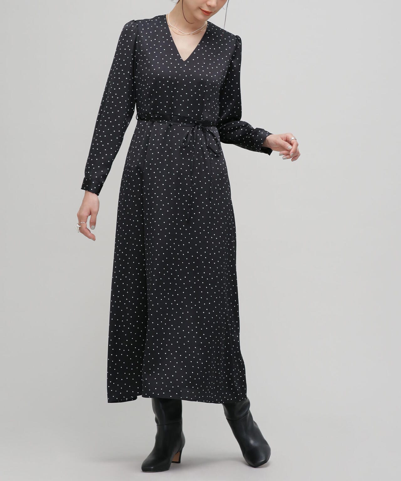 一枚でサマになるフェミニンなドットワンピース。ダーツや切替を入れて細見えするすっきりとしたシルエットを実現。更にウエストはリボンでマークするとよりスタイルアップ。縦長のVネックでアクセサリー映えも確実。デイリー使いはもちろん、クリスマスやシーズンイベントなど特別なシーンにもおススメの1着です。