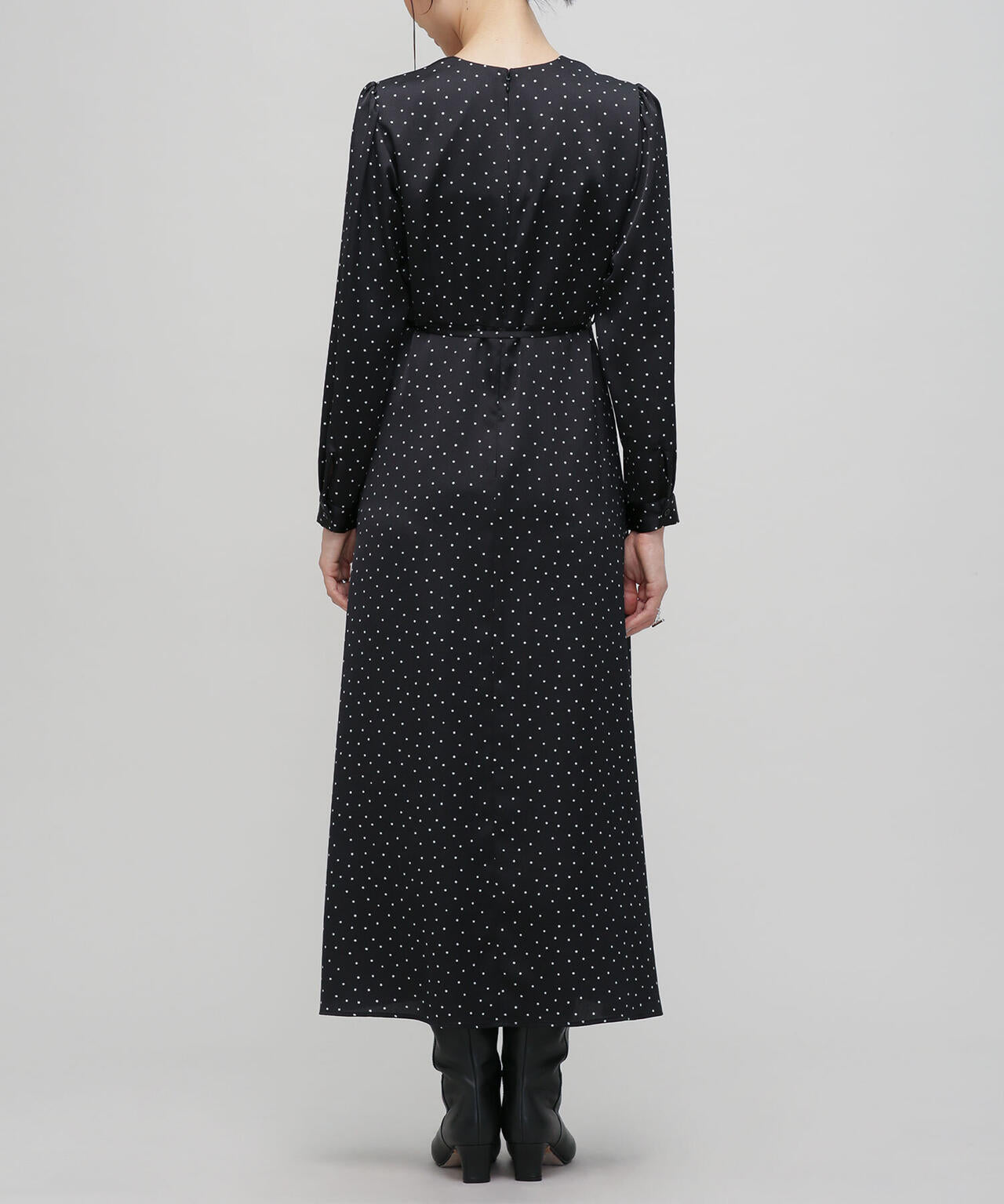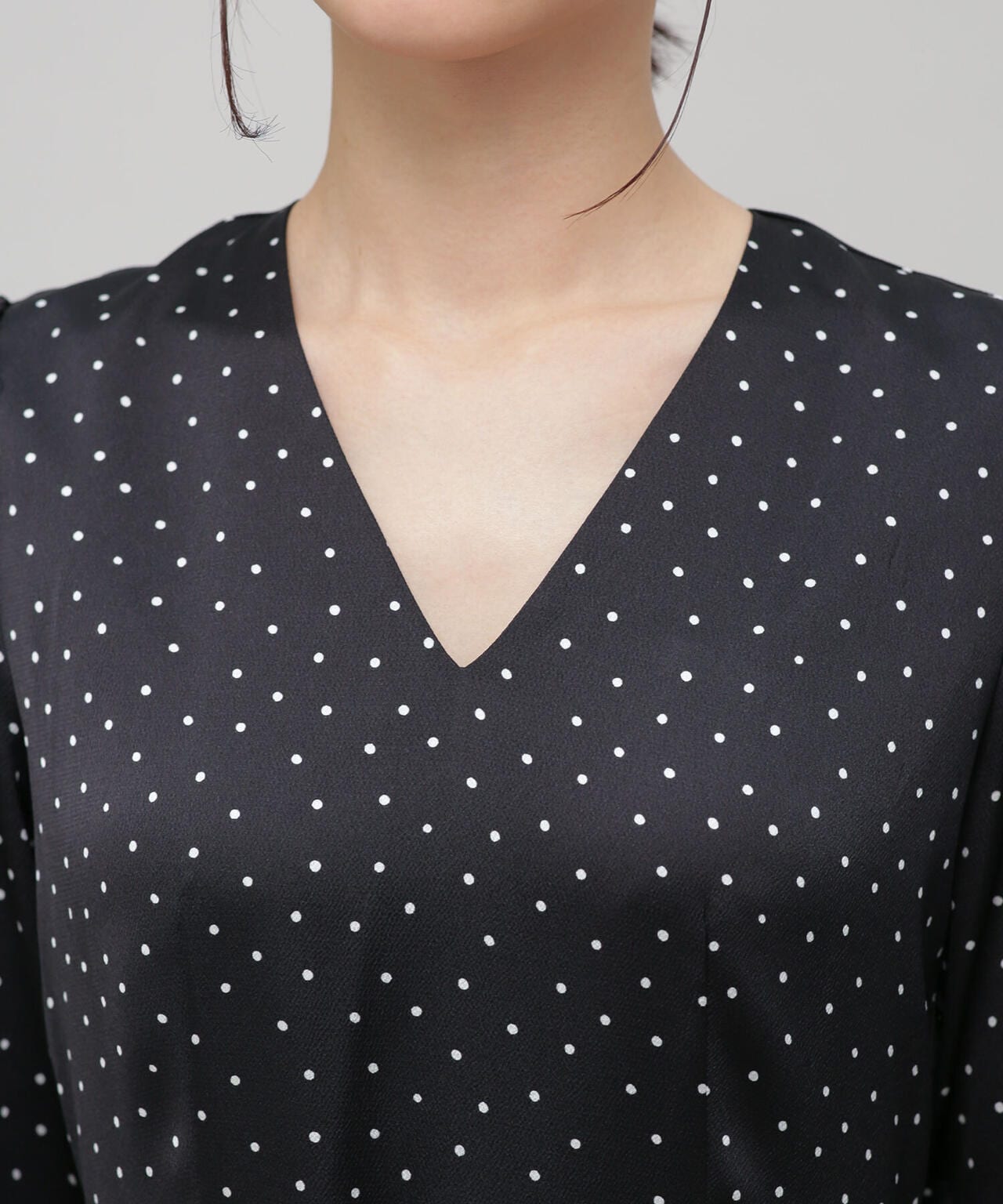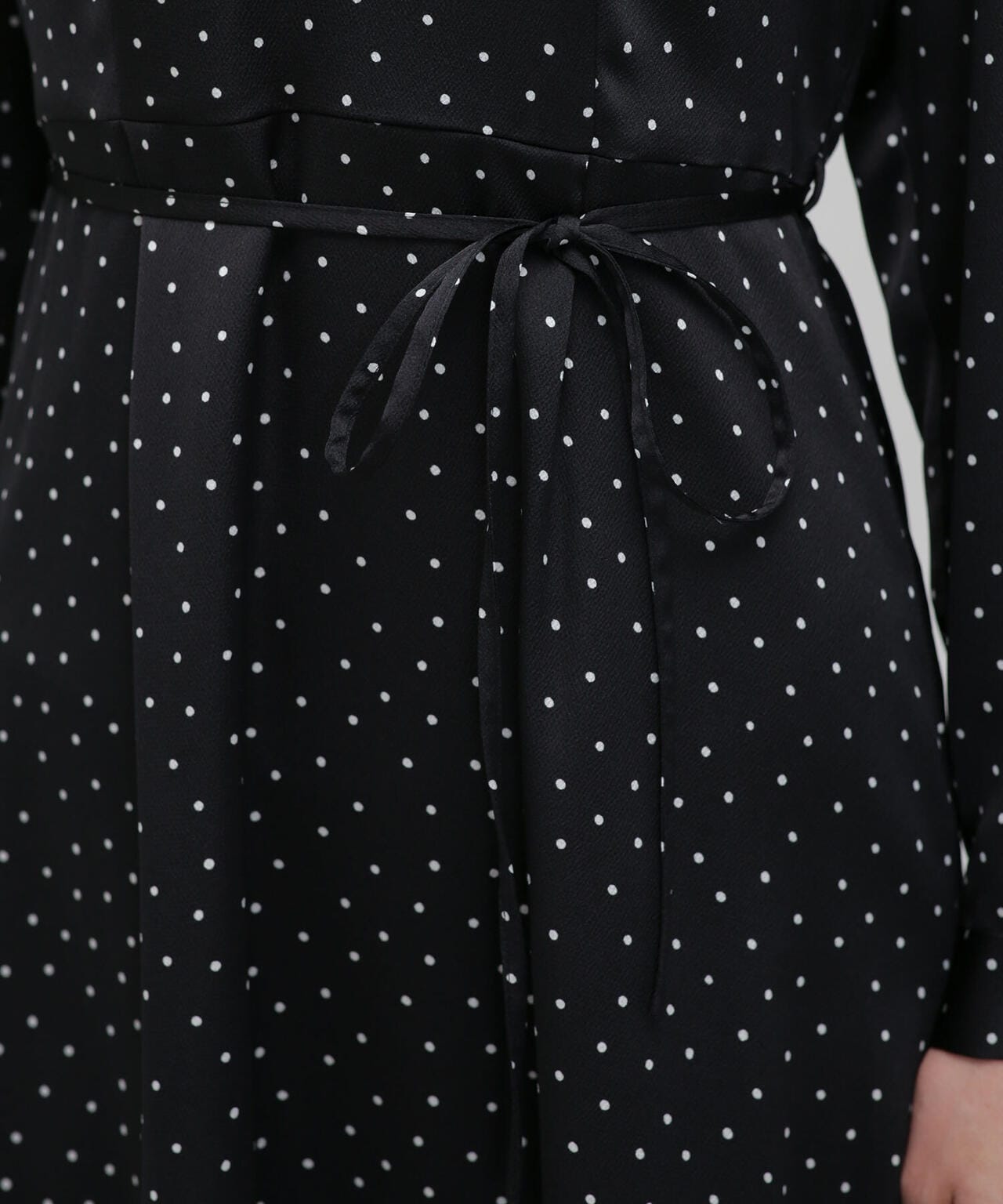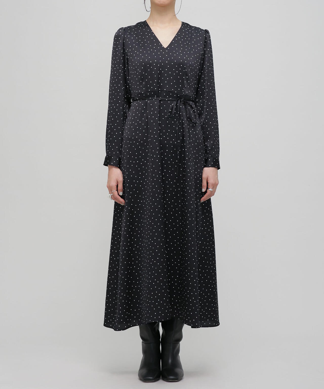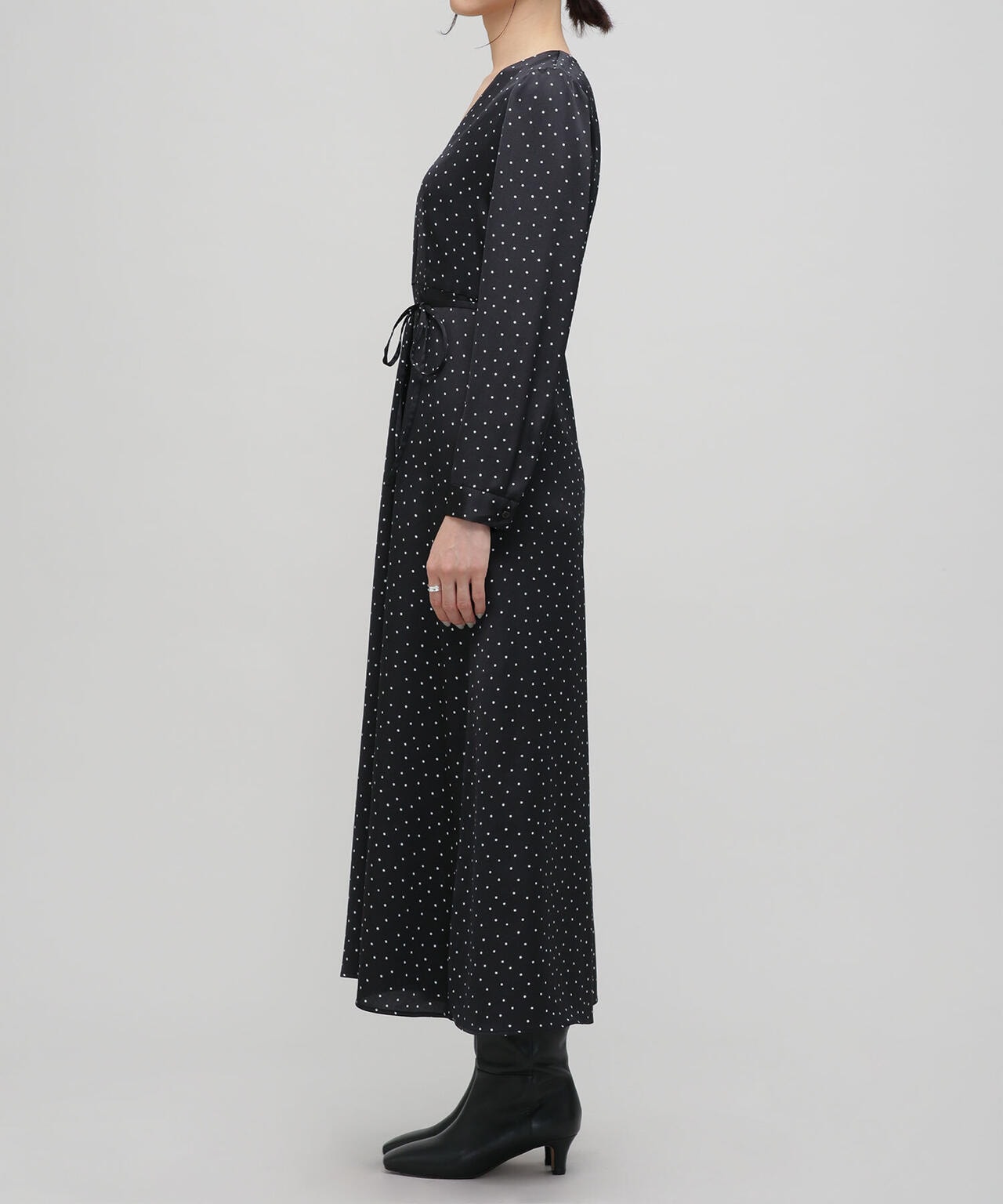 一枚でサマになるフェミニンなドットワンピース。ダーツや切替を入れて細見えするすっきりとしたシルエットを実現。更にウエストはリボンでマークするとよりスタイルアップ。縦長のVネックでアクセサリー映えも確実。デイリー使いはもちろん、クリスマスやシーズンイベントなど特別なシーンにもおススメの1着です。
