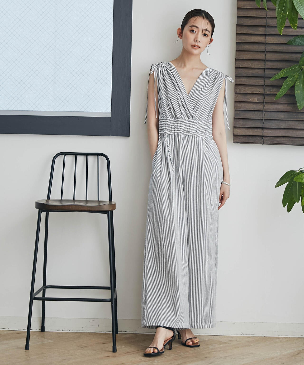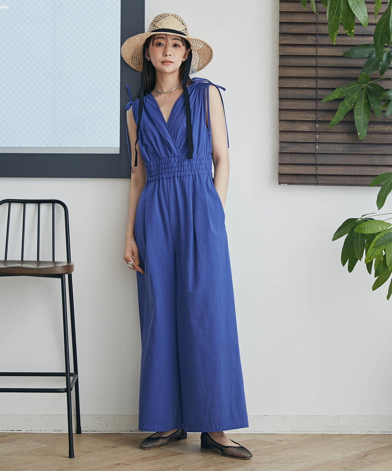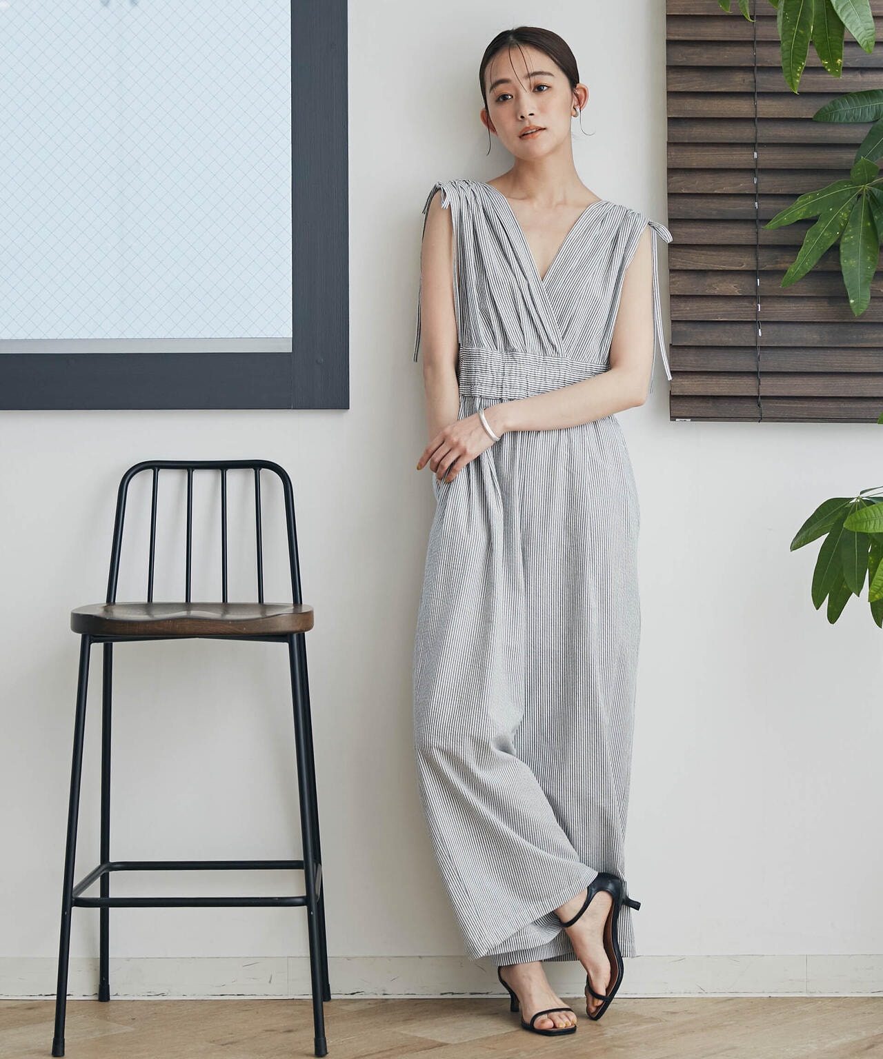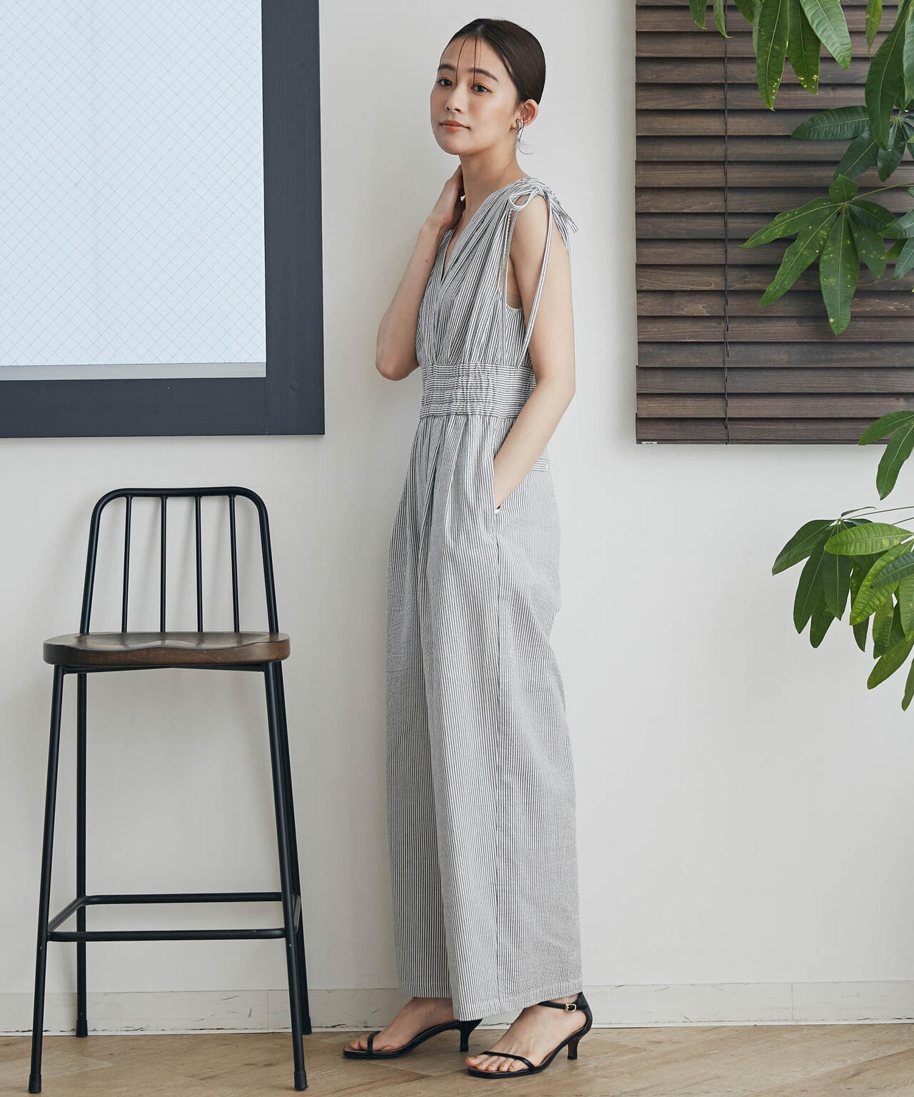 シーズンライクなサッカー生地で仕上げたサロペット。肩のギャザーディテールや紐リボンが女性らしさたっぷりな一枚。ウエストのゴムはぴったりとは止まらずに体のラインに添うシルエットになっています。ウエスト位置が高めで足長効果も期待◎。カップ付きキャミソールに合わせてヘルシーに着ていただくのがおすすめです。