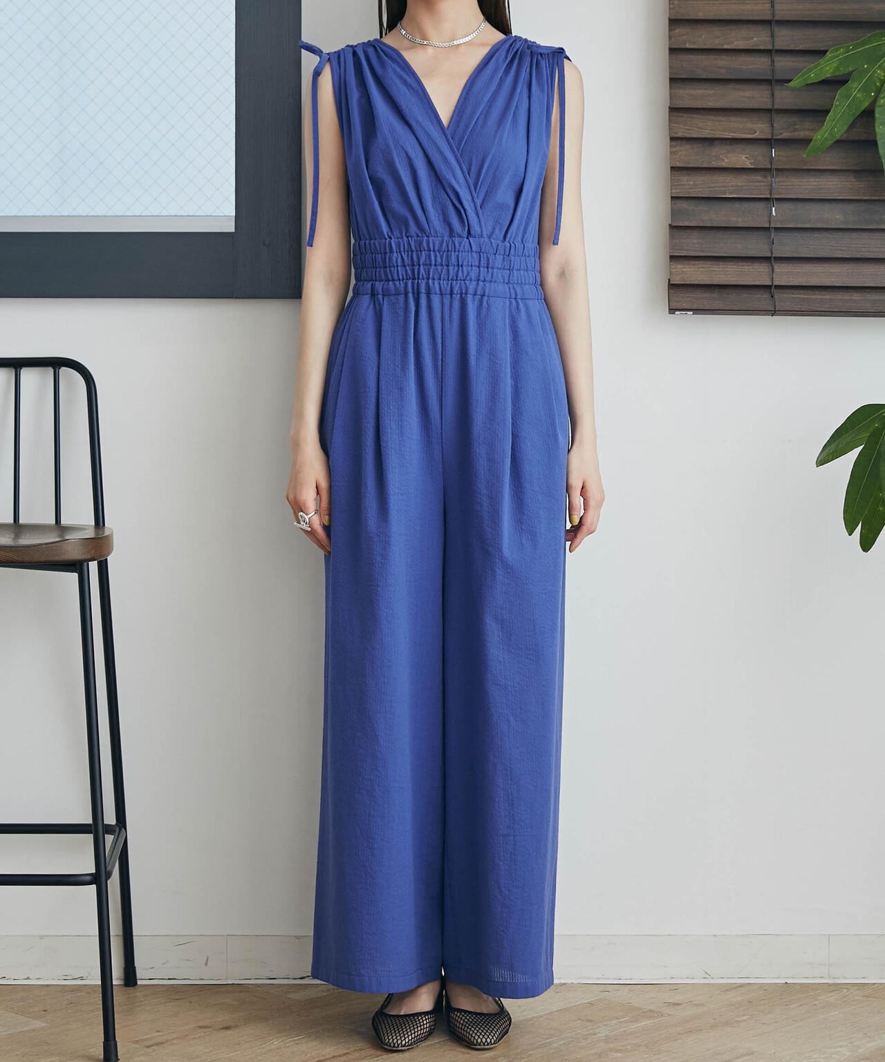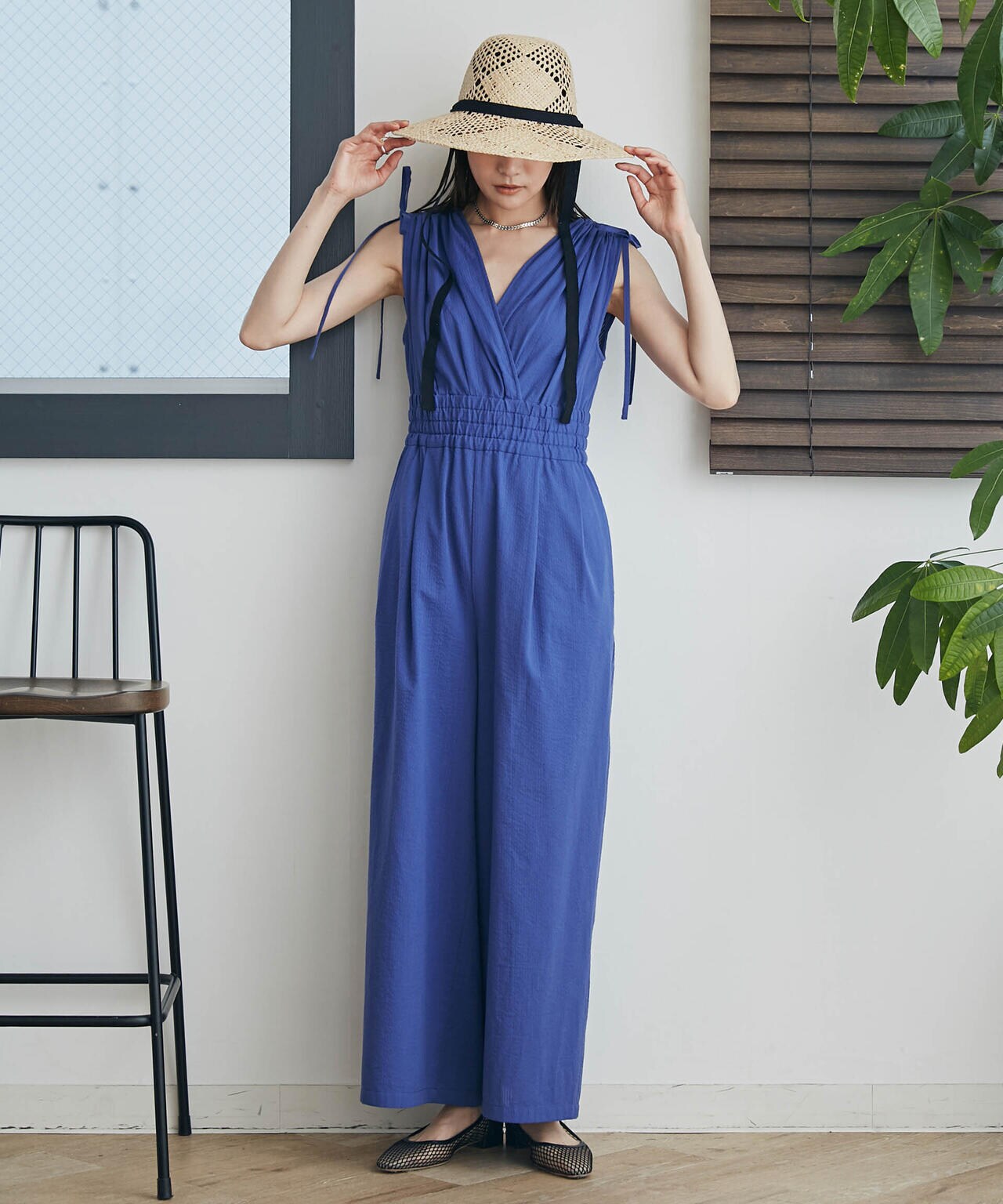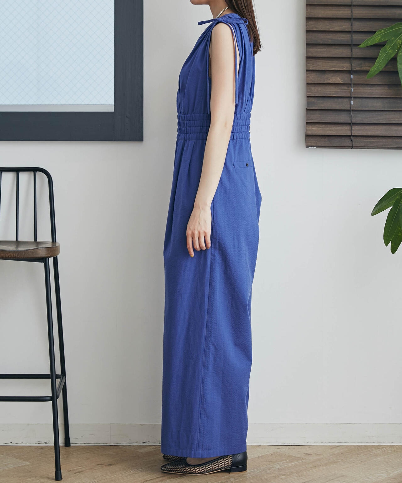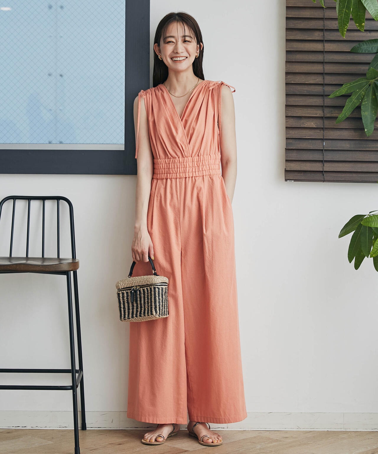 シーズンライクなサッカー生地で仕上げたサロペット。肩のギャザーディテールや紐リボンが女性らしさたっぷりな一枚。ウエストのゴムはぴったりとは止まらずに体のラインに添うシルエットになっています。ウエスト位置が高めで足長効果も期待◎。カップ付きキャミソールに合わせてヘルシーに着ていただくのがおすすめです。