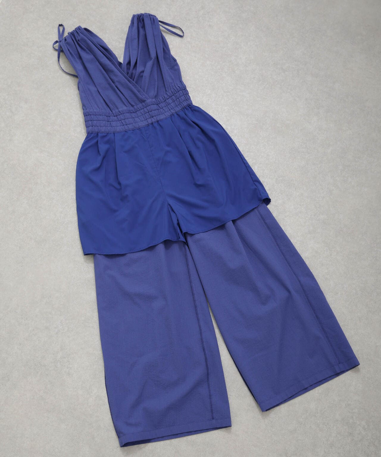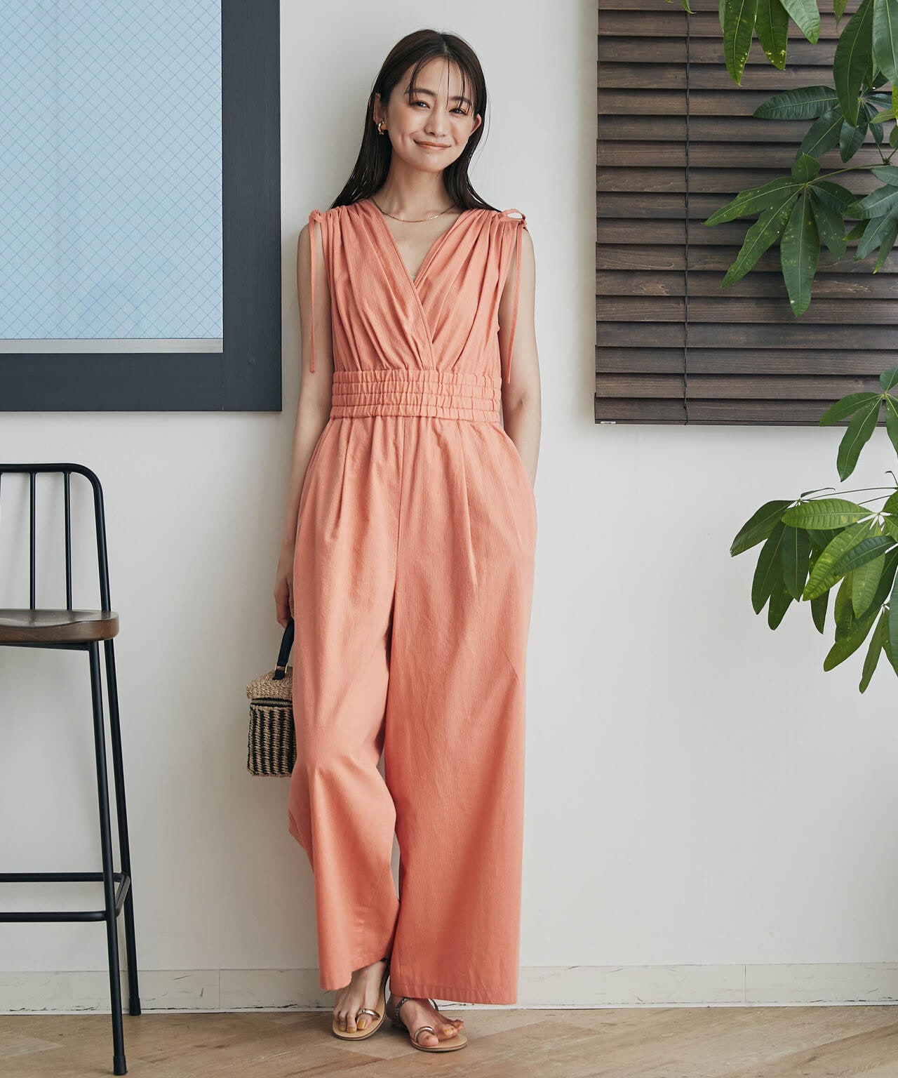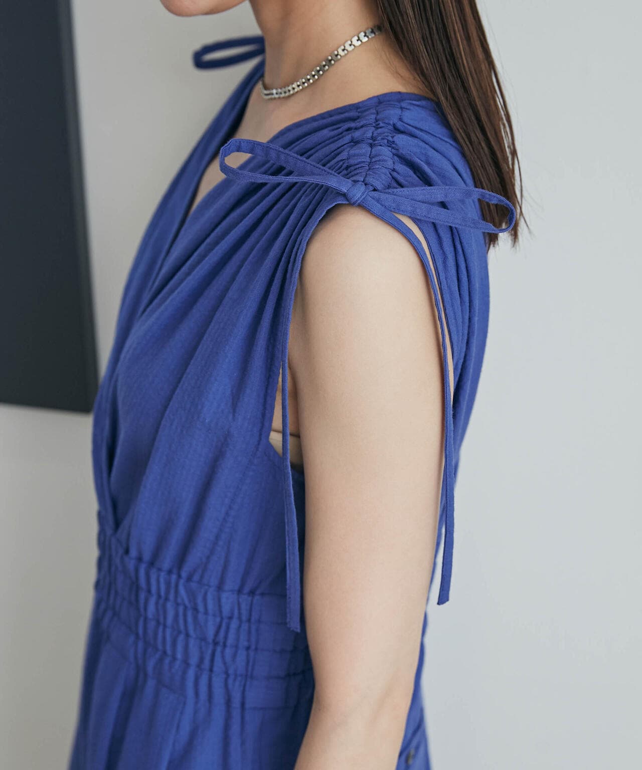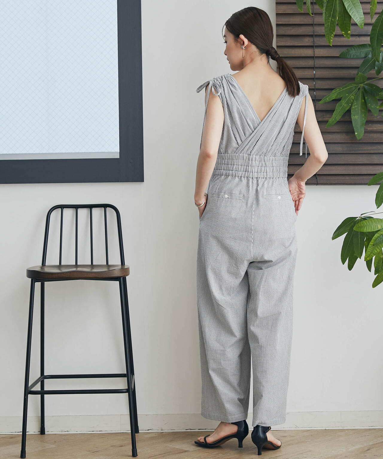 シーズンライクなサッカー生地で仕上げたサロペット。肩のギャザーディテールや紐リボンが女性らしさたっぷりな一枚。ウエストのゴムはぴったりとは止まらずに体のラインに添うシルエットになっています。ウエスト位置が高めで足長効果も期待◎。カップ付きキャミソールに合わせてヘルシーに着ていただくのがおすすめです。