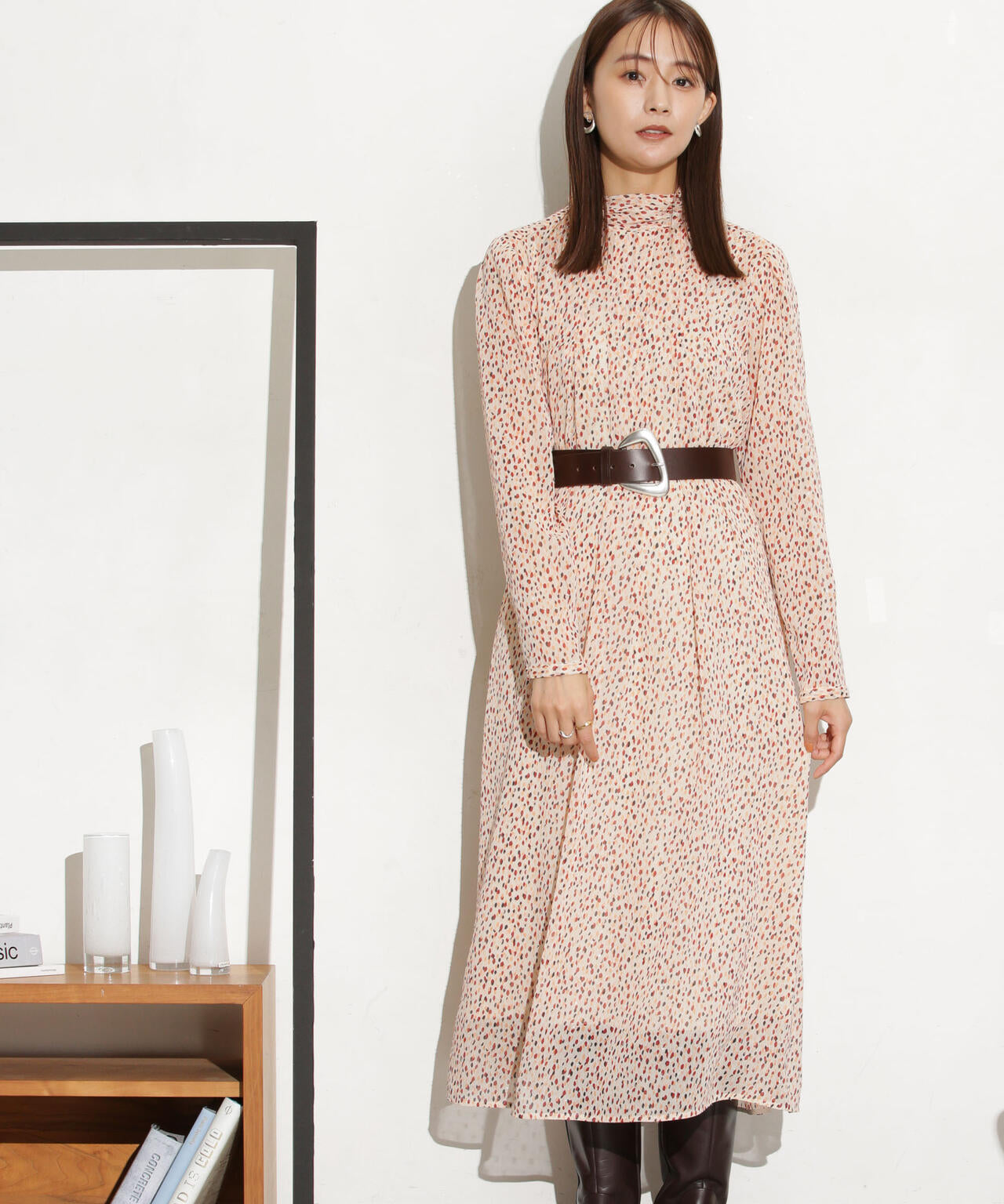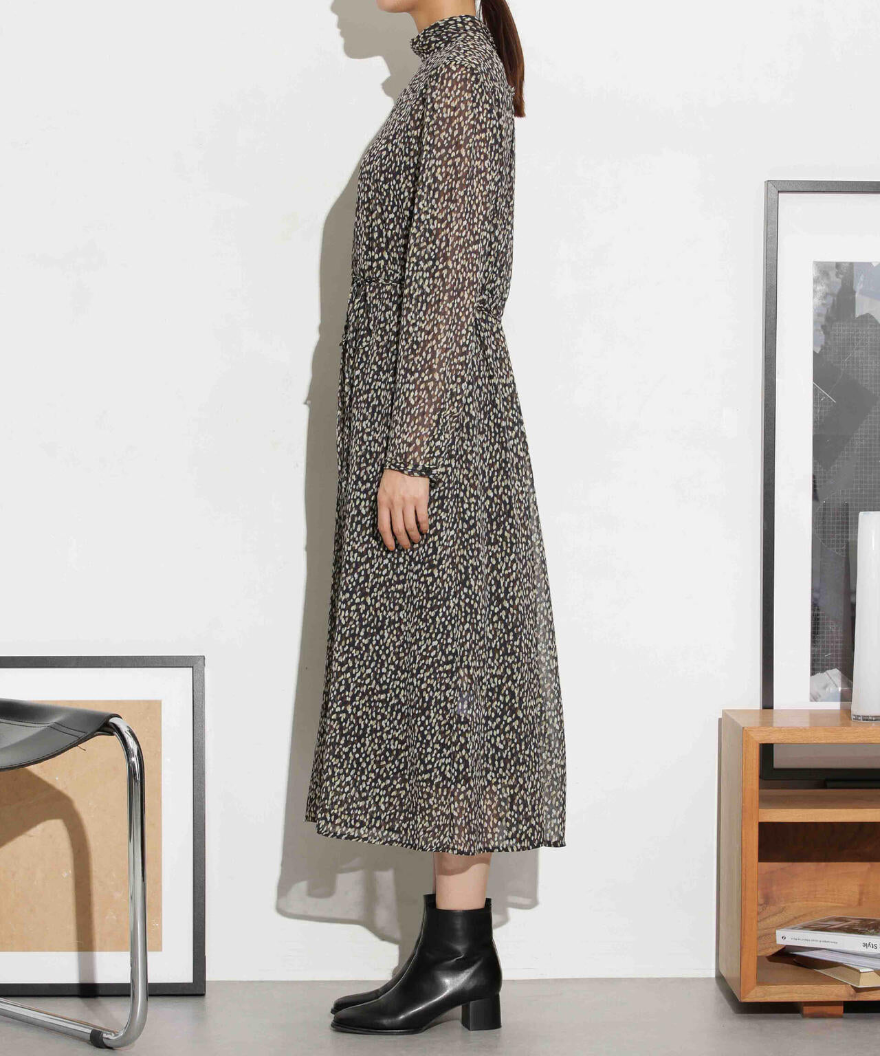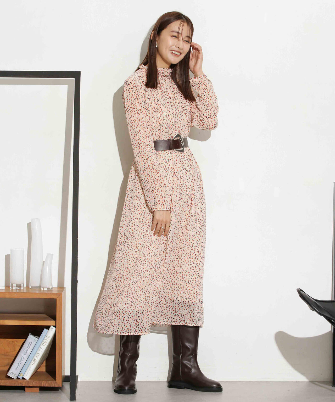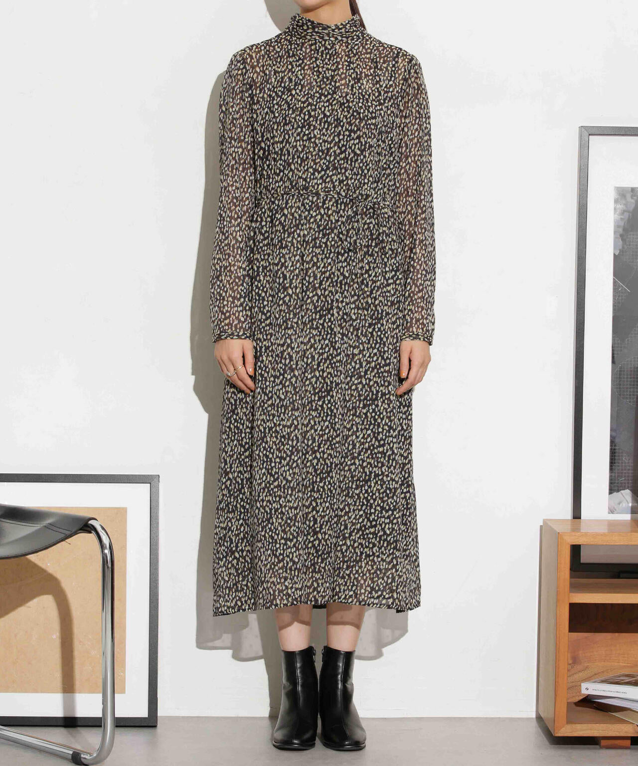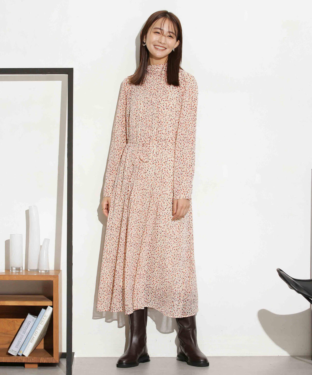 クラシック要素のある女性らしい柔らかな印象のプリントワンピース。身頃は襟元からタックできれいに広がるシルエットでハイネックがくたっと落ちたような衿がポイント。ウエストリボンで結ぶキレイめな着方やリボンを外してデニムなどのカジュアルなボトムとレイヤードコーデも◎。一枚着はもちろん、シアー感のあるワンピースにジャケットやニットカーデなどの冬らしい素材と合わせるスタイリングが今年のオススメです。