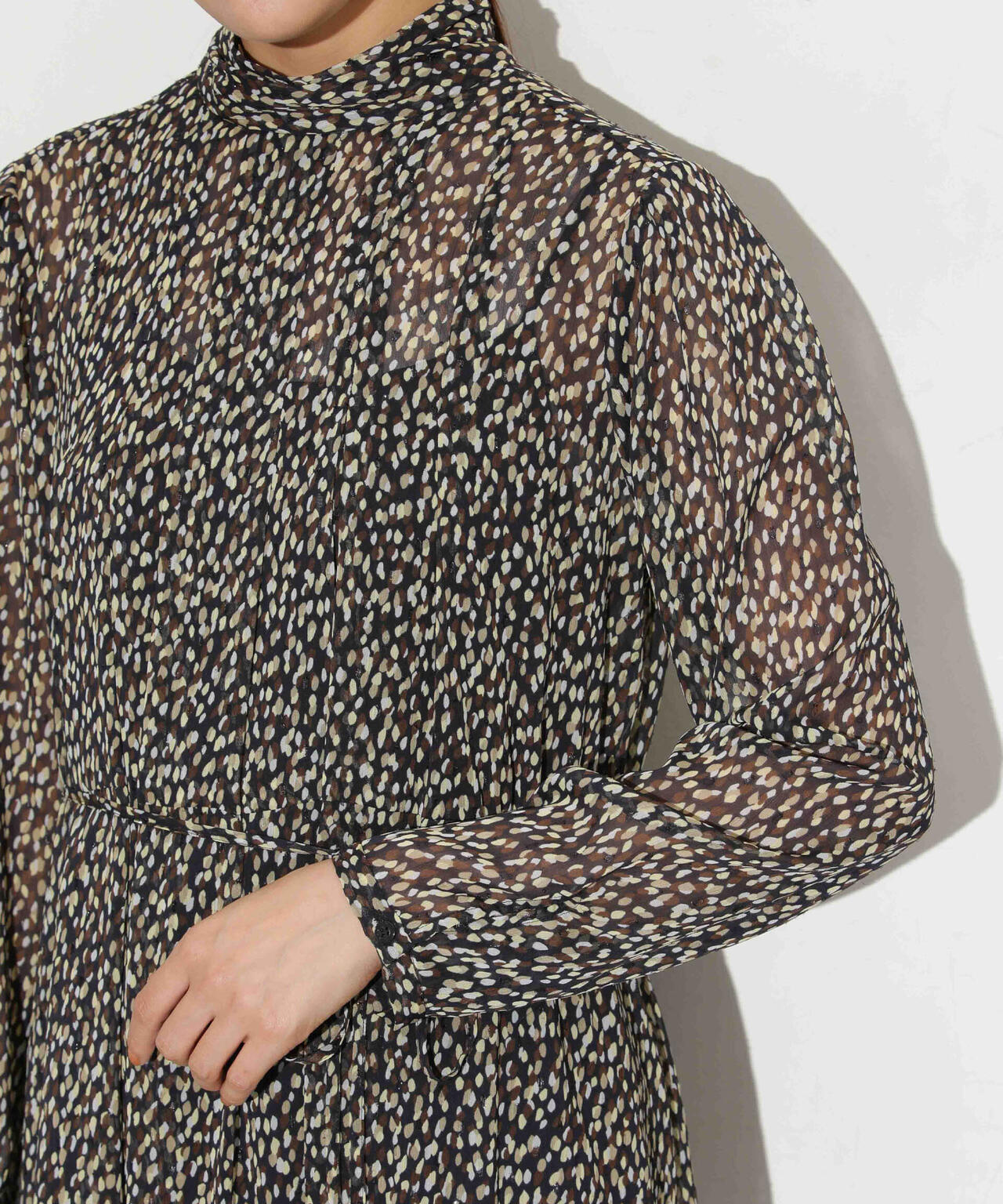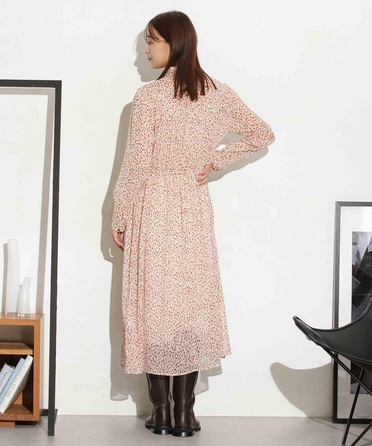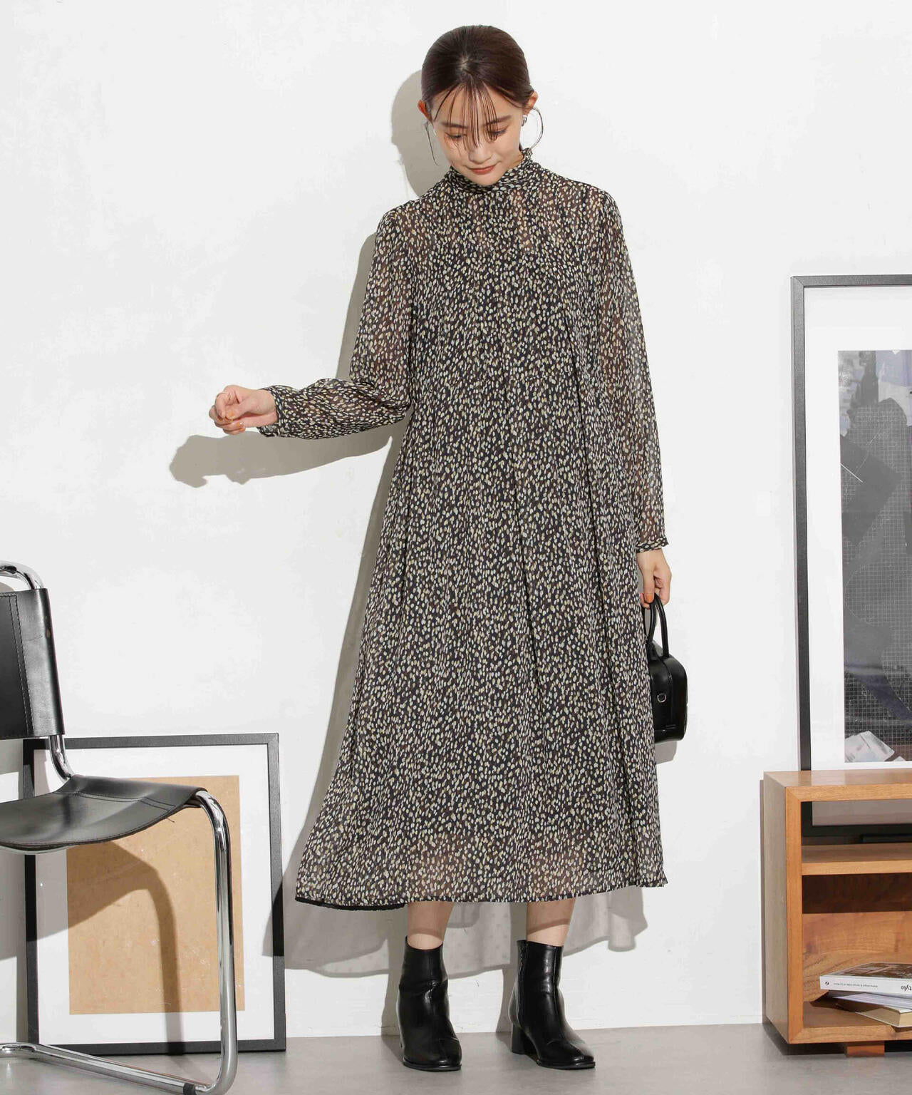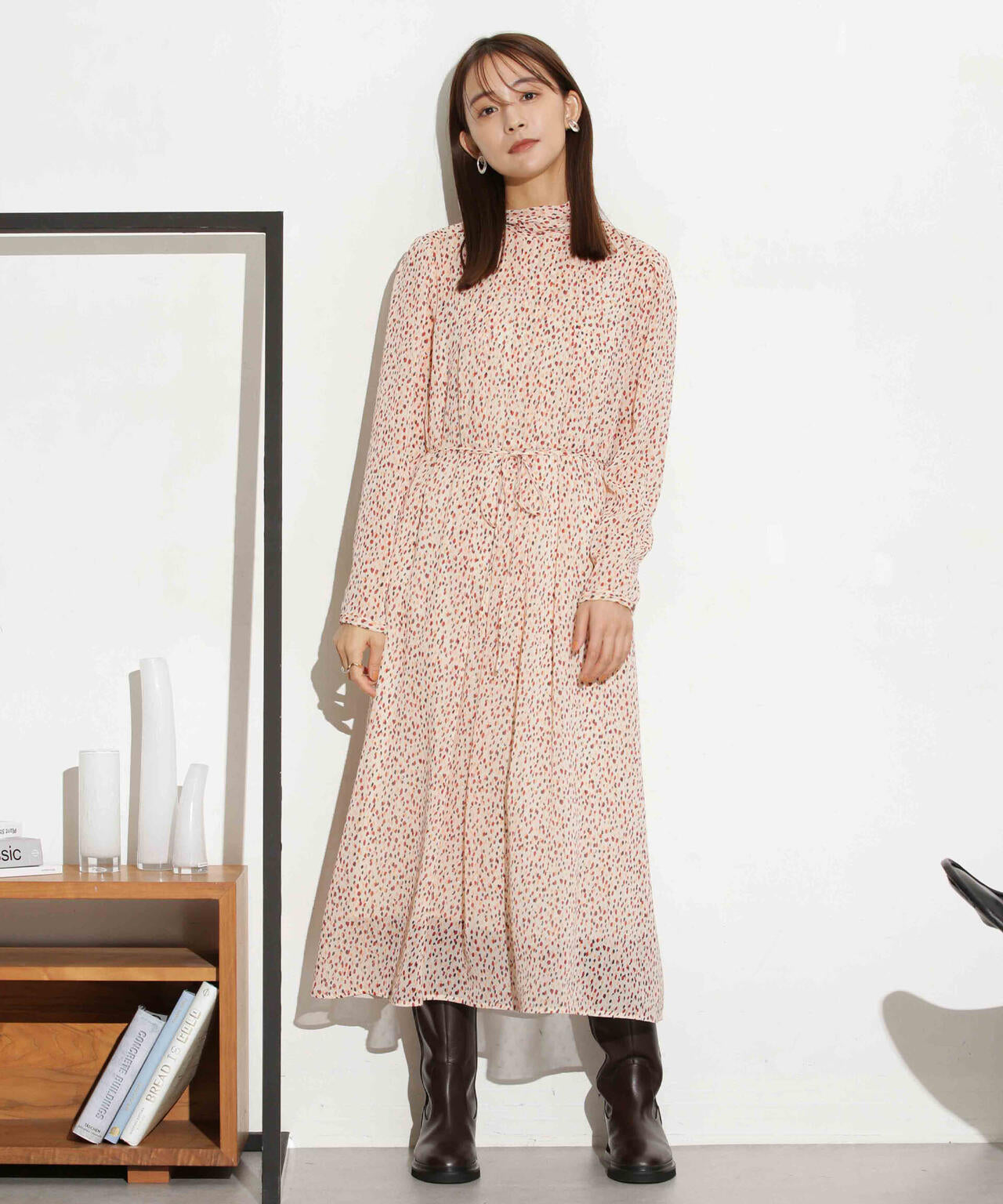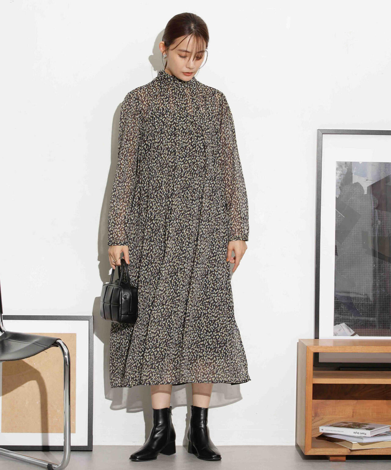 クラシック要素のある女性らしい柔らかな印象のプリントワンピース。身頃は襟元からタックできれいに広がるシルエットでハイネックがくたっと落ちたような衿がポイント。ウエストリボンで結ぶキレイめな着方やリボンを外してデニムなどのカジュアルなボトムとレイヤードコーデも◎。一枚着はもちろん、シアー感のあるワンピースにジャケットやニットカーデなどの冬らしい素材と合わせるスタイリングが今年のオススメです。
