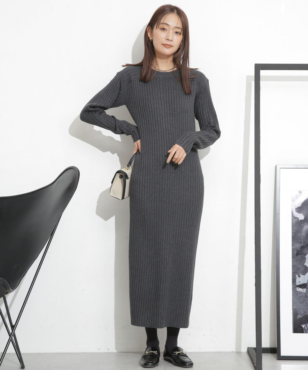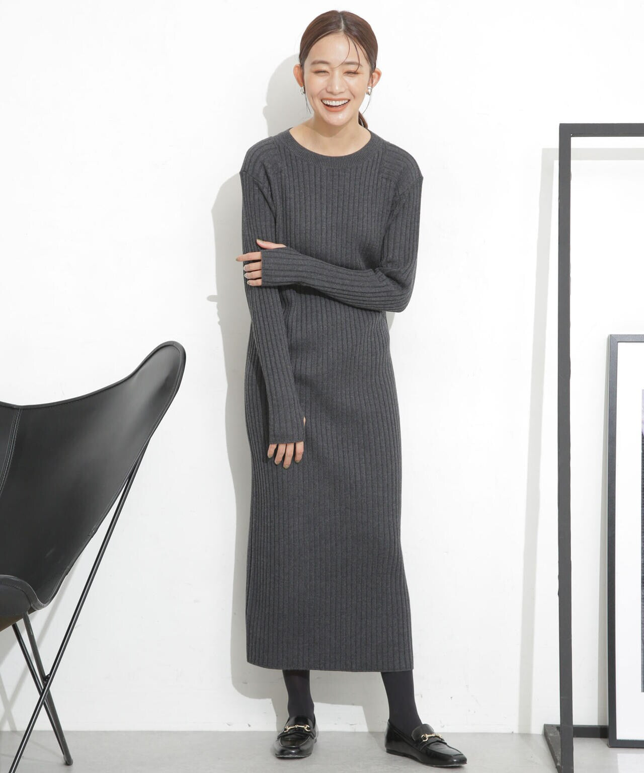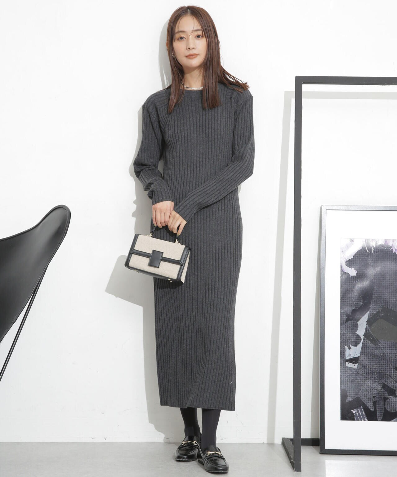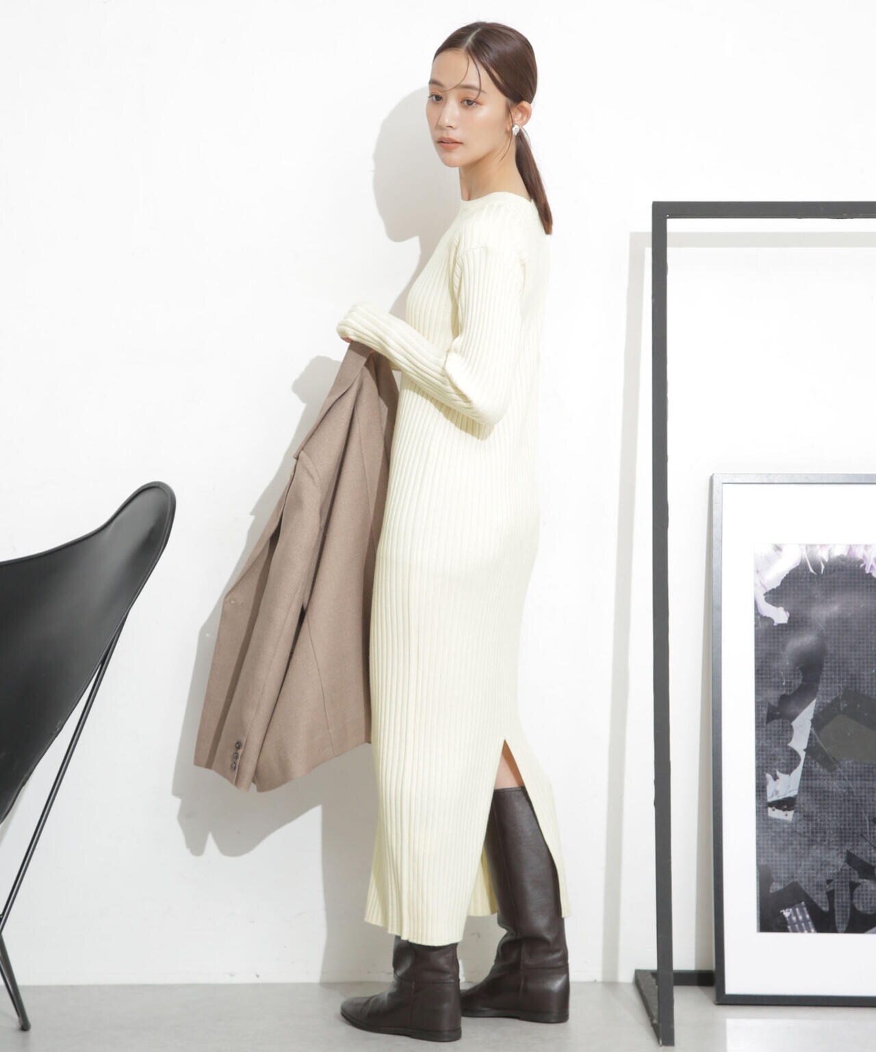 ・すっきりとしたIラインシルエットが大人っぽくトレンド見えするリブワンピース