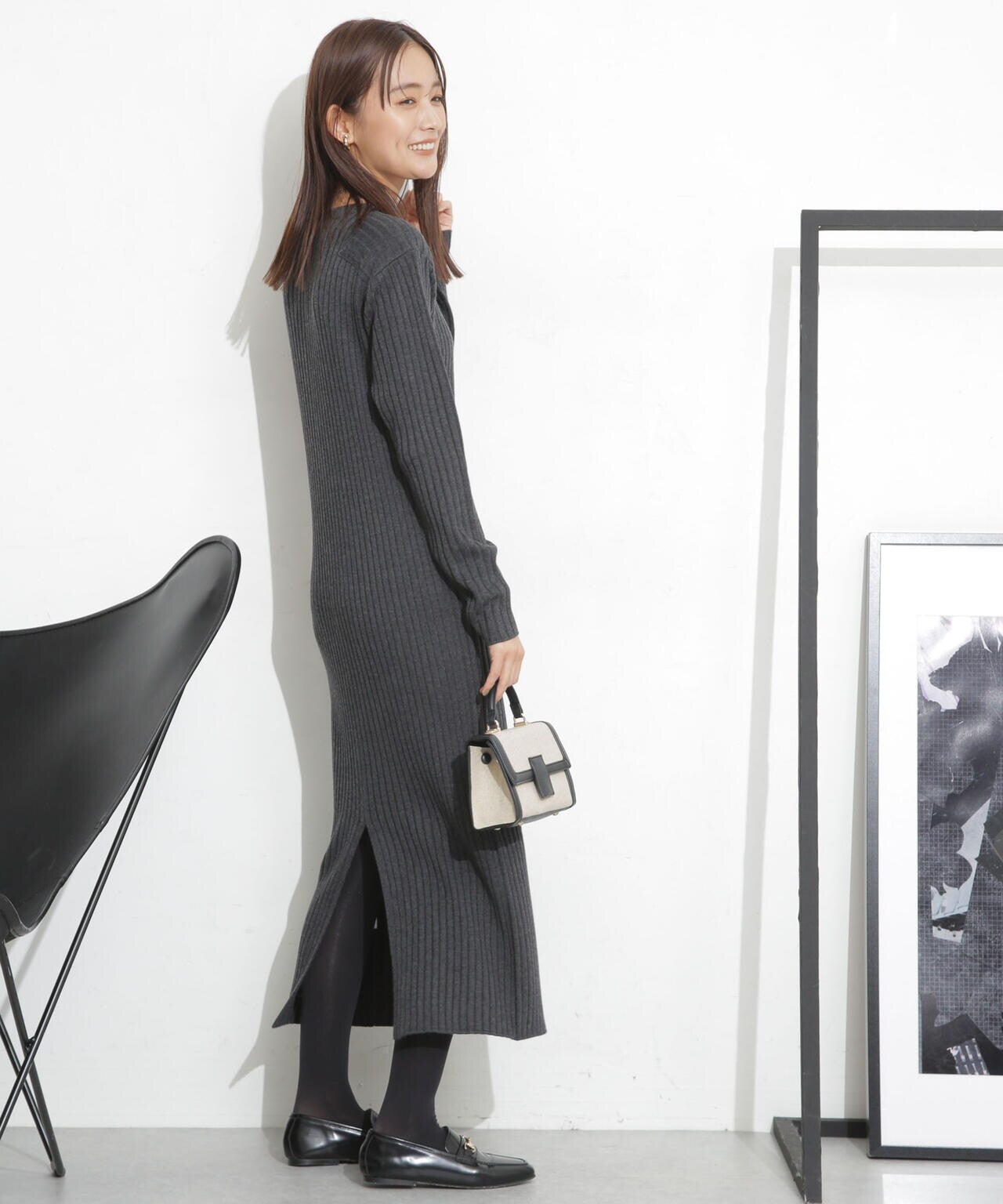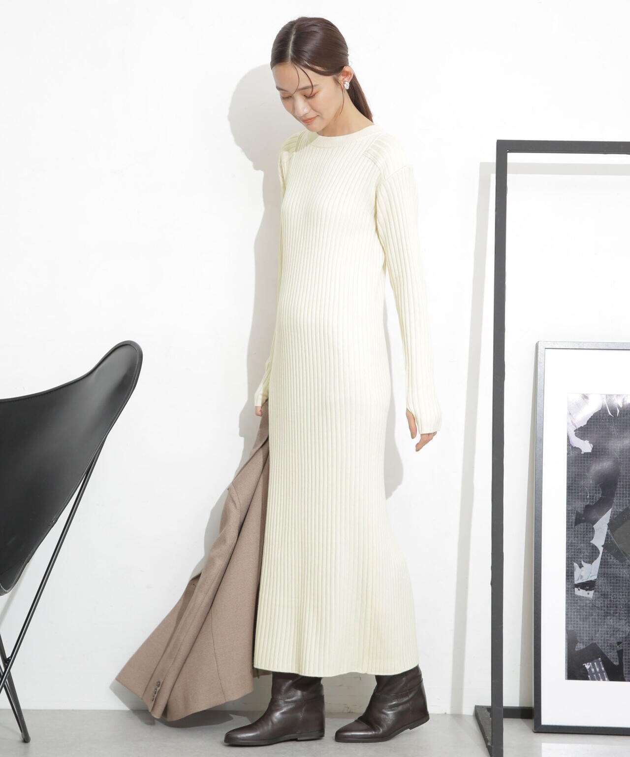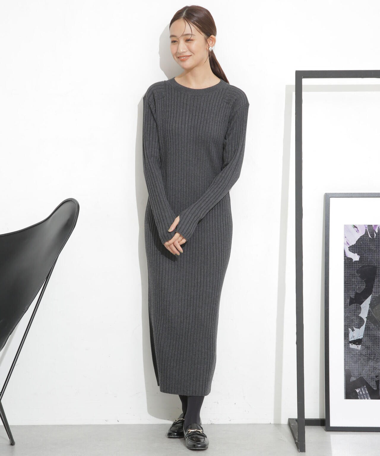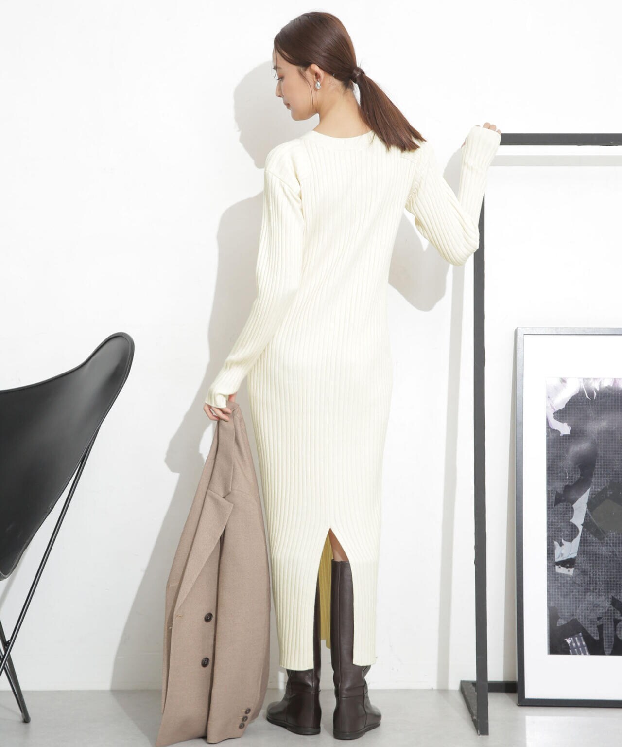 ・すっきりとしたIラインシルエットが大人っぽくトレンド見えするリブワンピース