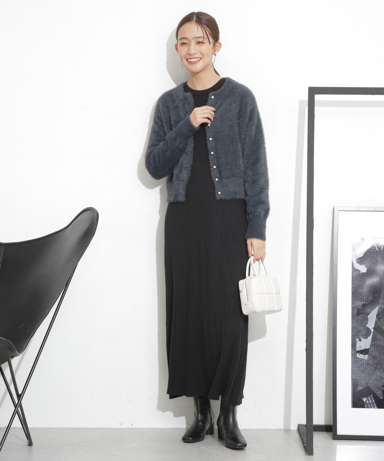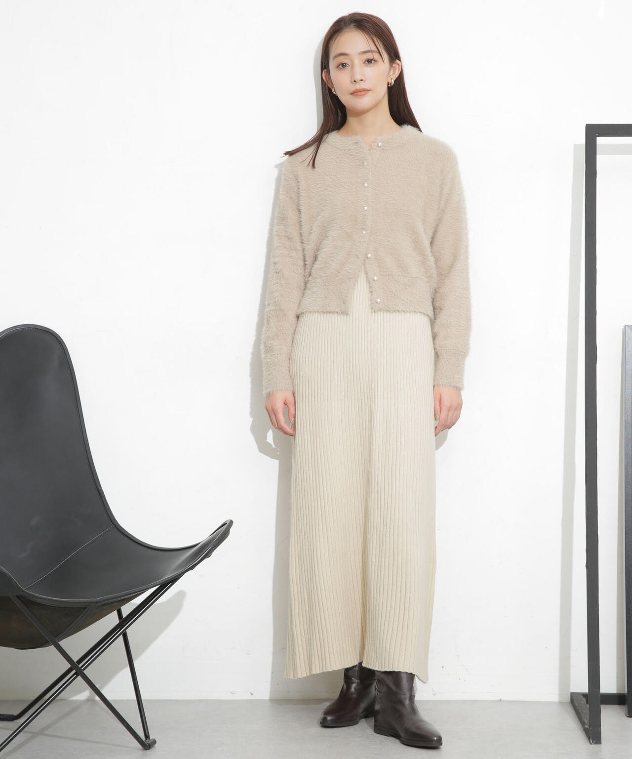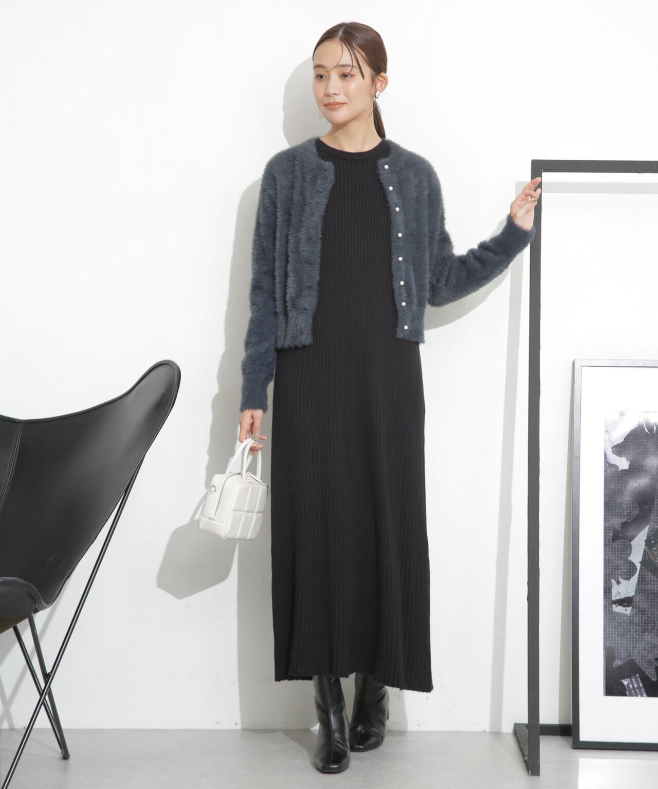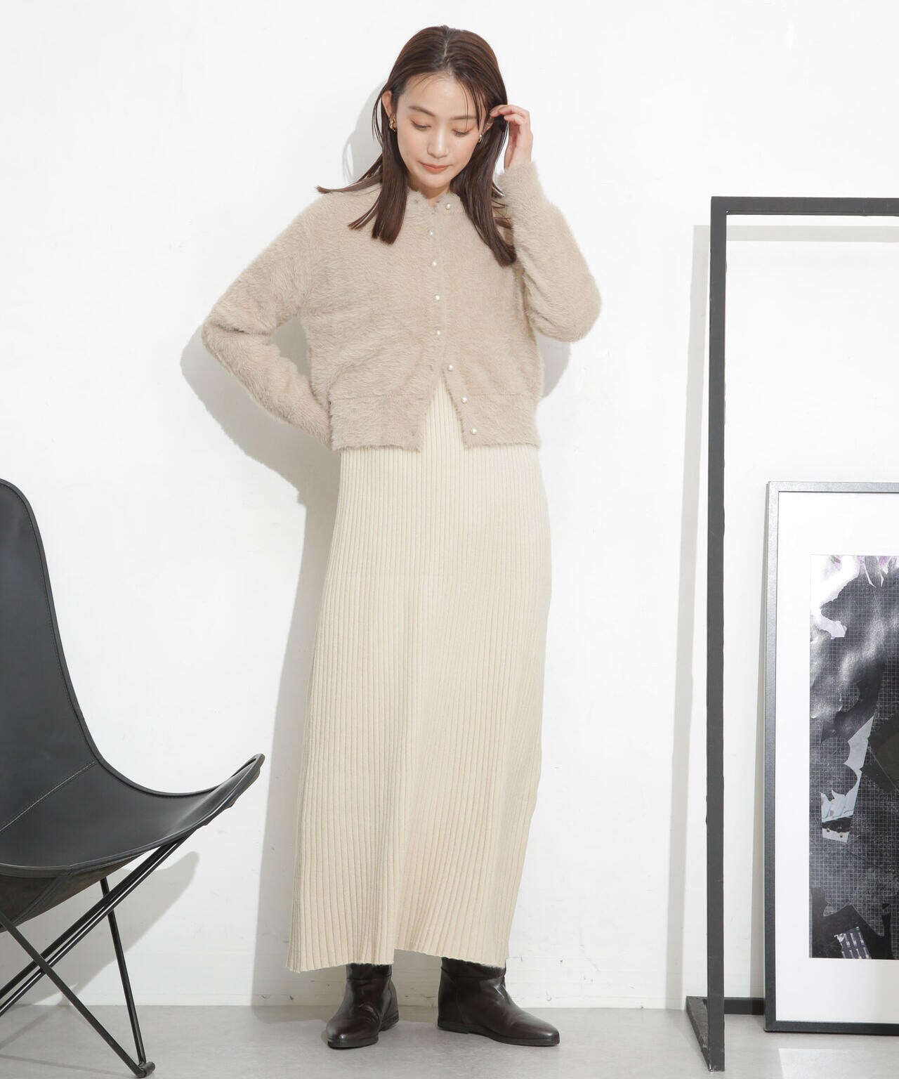 ・毛足の長いフェザーニットカーデとリブワンピのセットアイテム