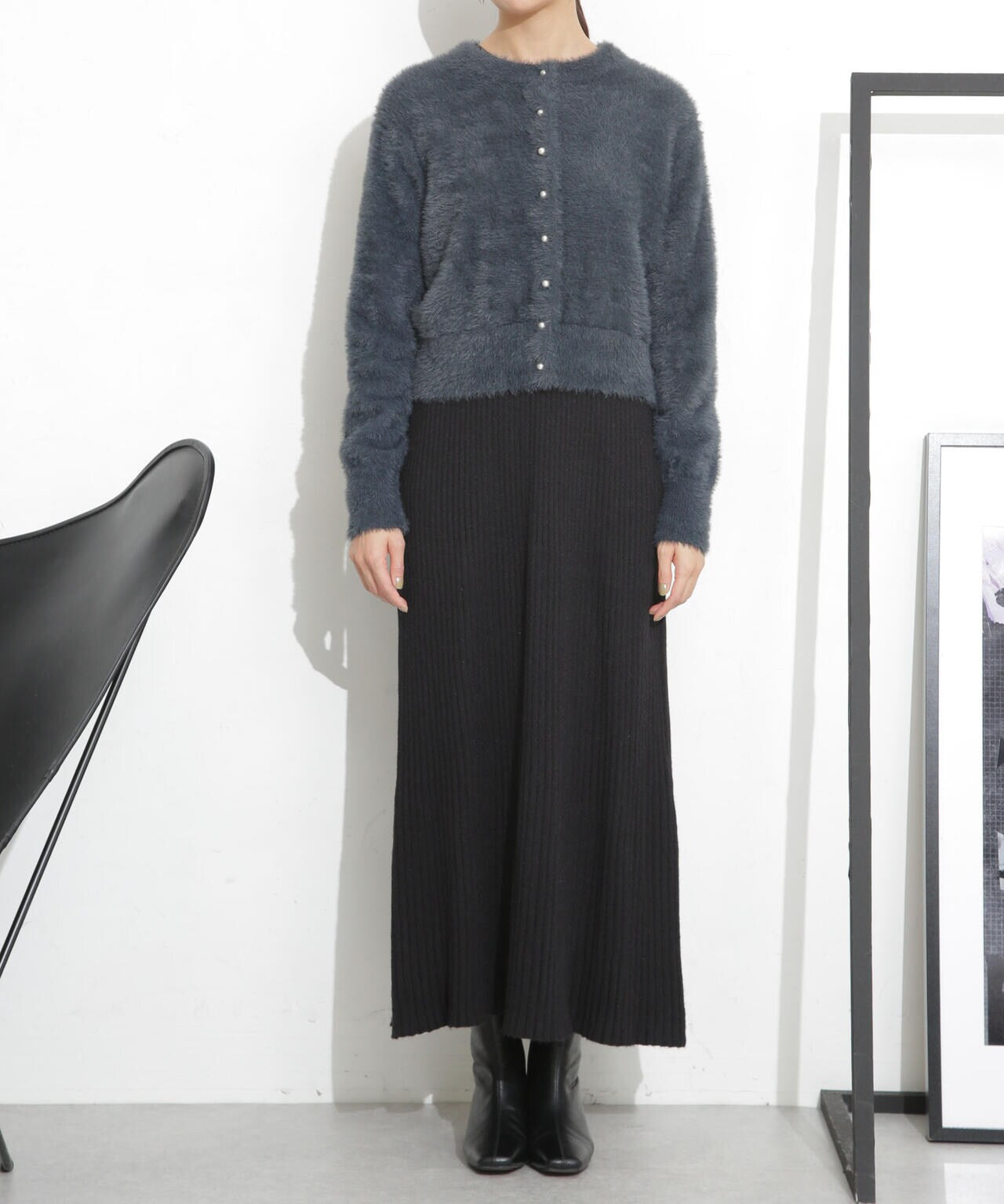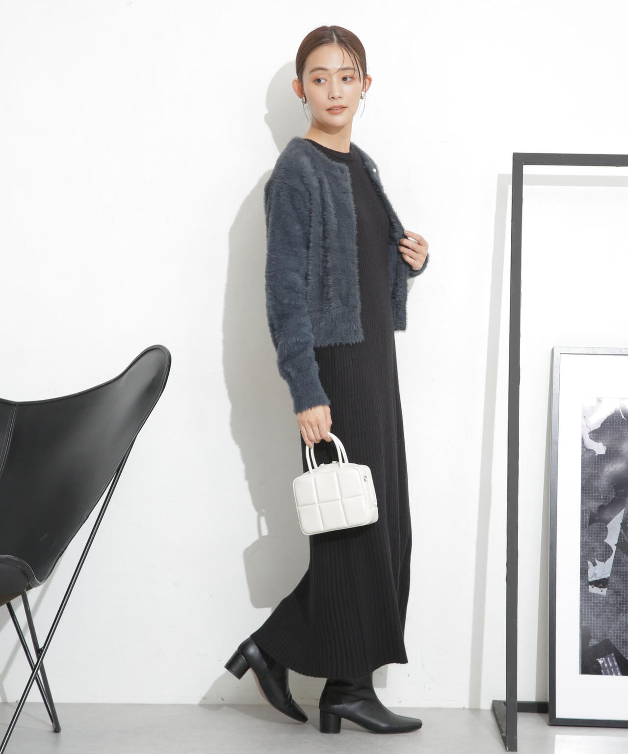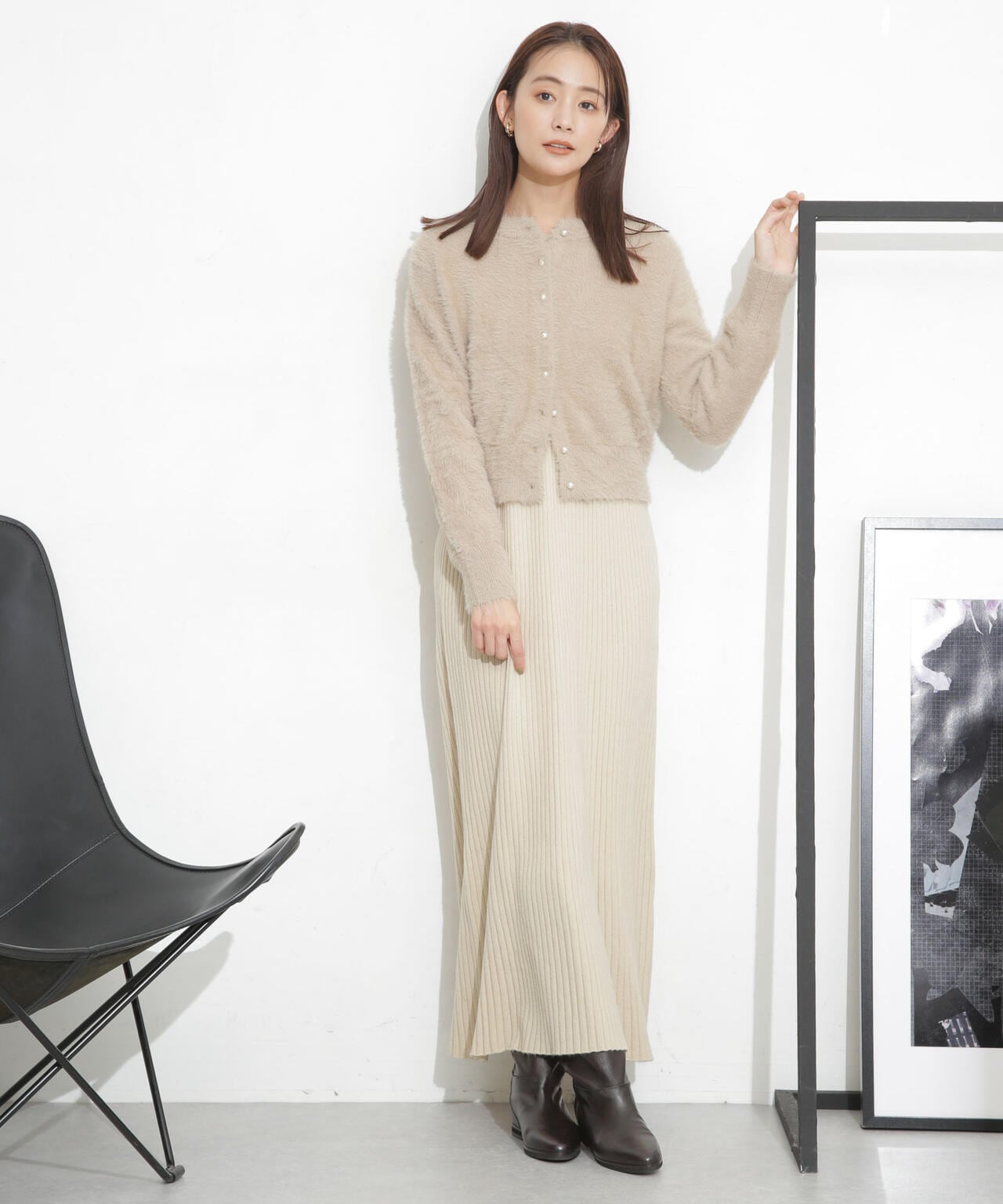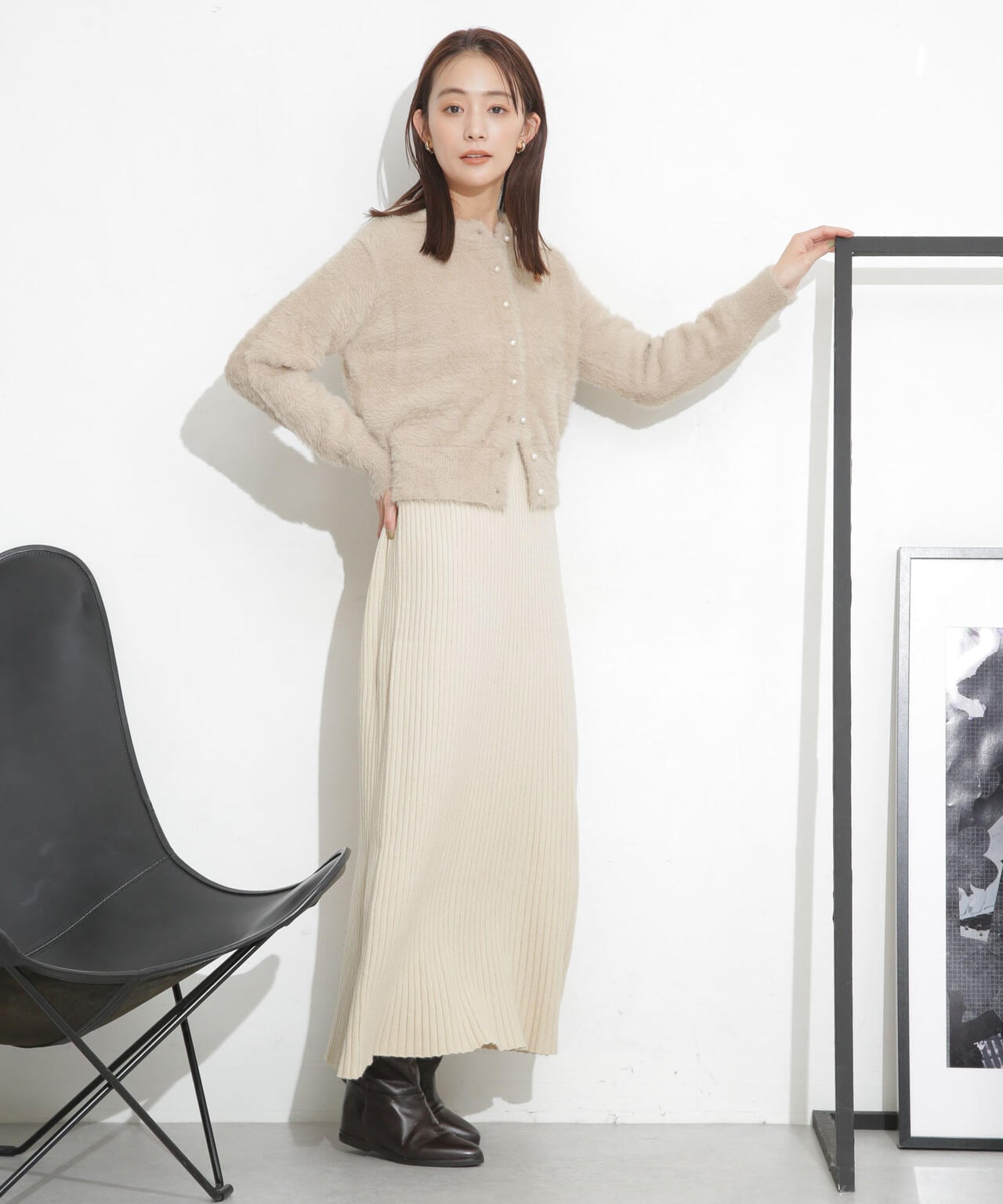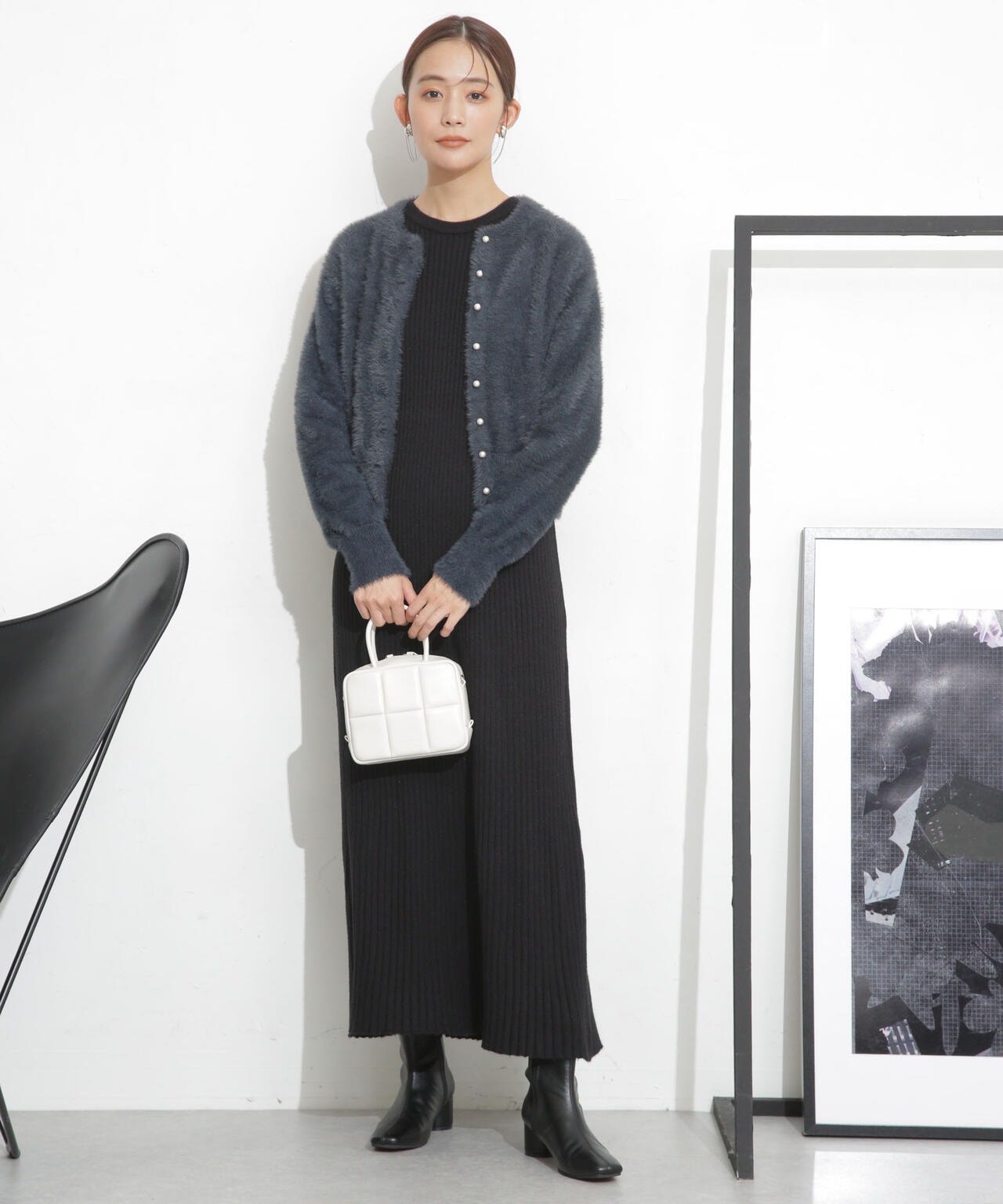 ・毛足の長いフェザーニットカーデとリブワンピのセットアイテム