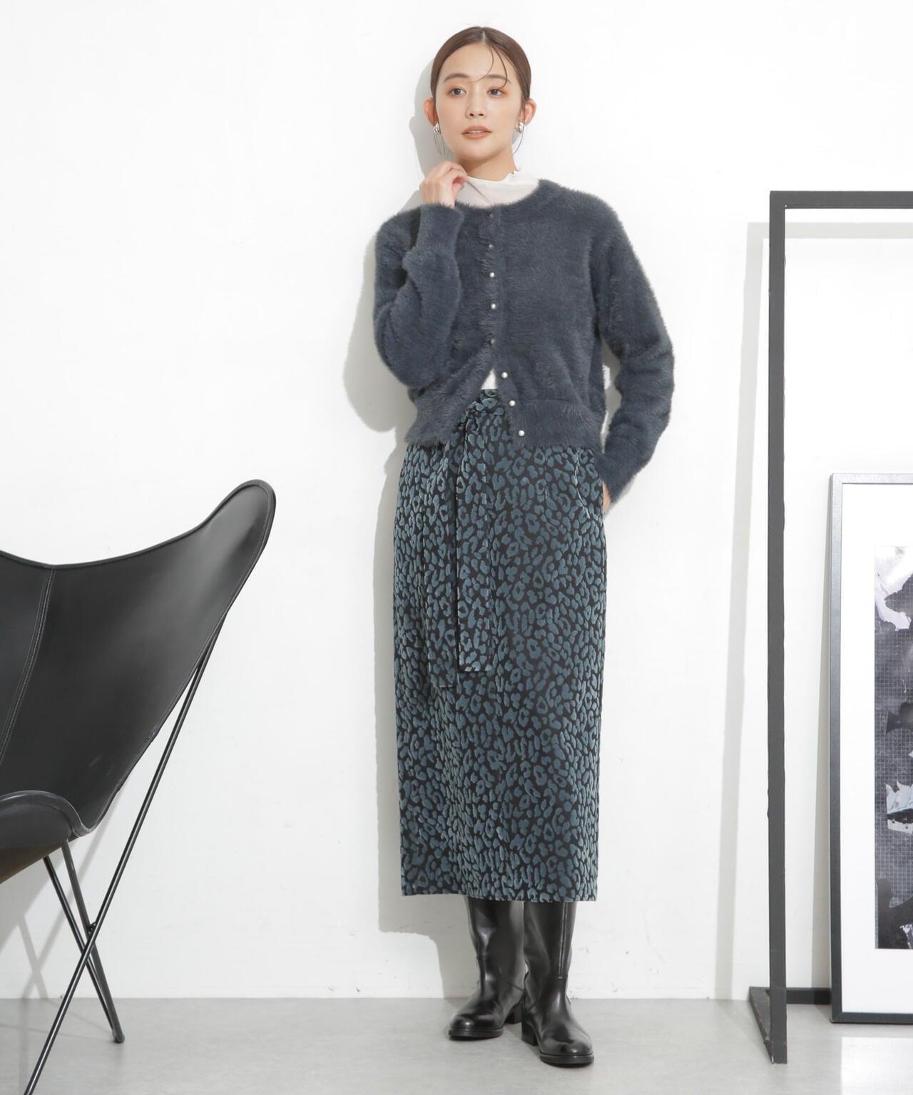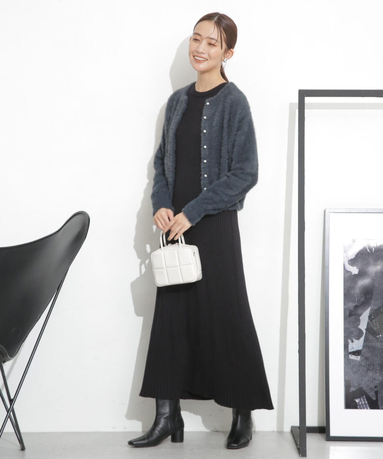 毛足の長いラグジュアリーなフェザーニットのカーディガンと、リブワンピースのセットアイテム。フェザーニットながらも着ぶくれしにくいコンパクトなカーディガンに、細見えするリブ編みのワンピースですっきりした着こなしが実現。リラクシーな着心地ながらも女性らしくきちんと感が備わるので、通勤や学校行事、ちょっとしたお呼ばれシーンまで幅広く活躍しそう。