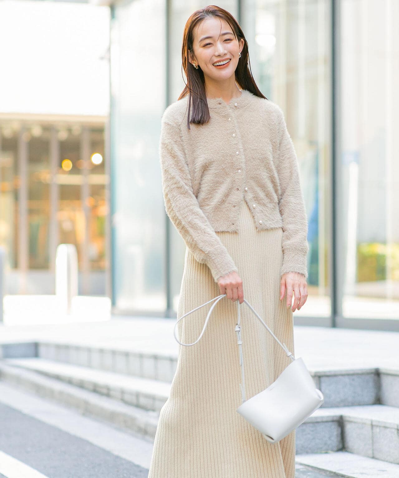 カーディガンは着ぶくれしにくいコンパクトなサイズ感でパールボタンがポイントになって可愛いです!ワンピースはほんのりと広がるシルエットでラインを拾いにくく、ニットワンピースが苦手な方でも着やすいです◎