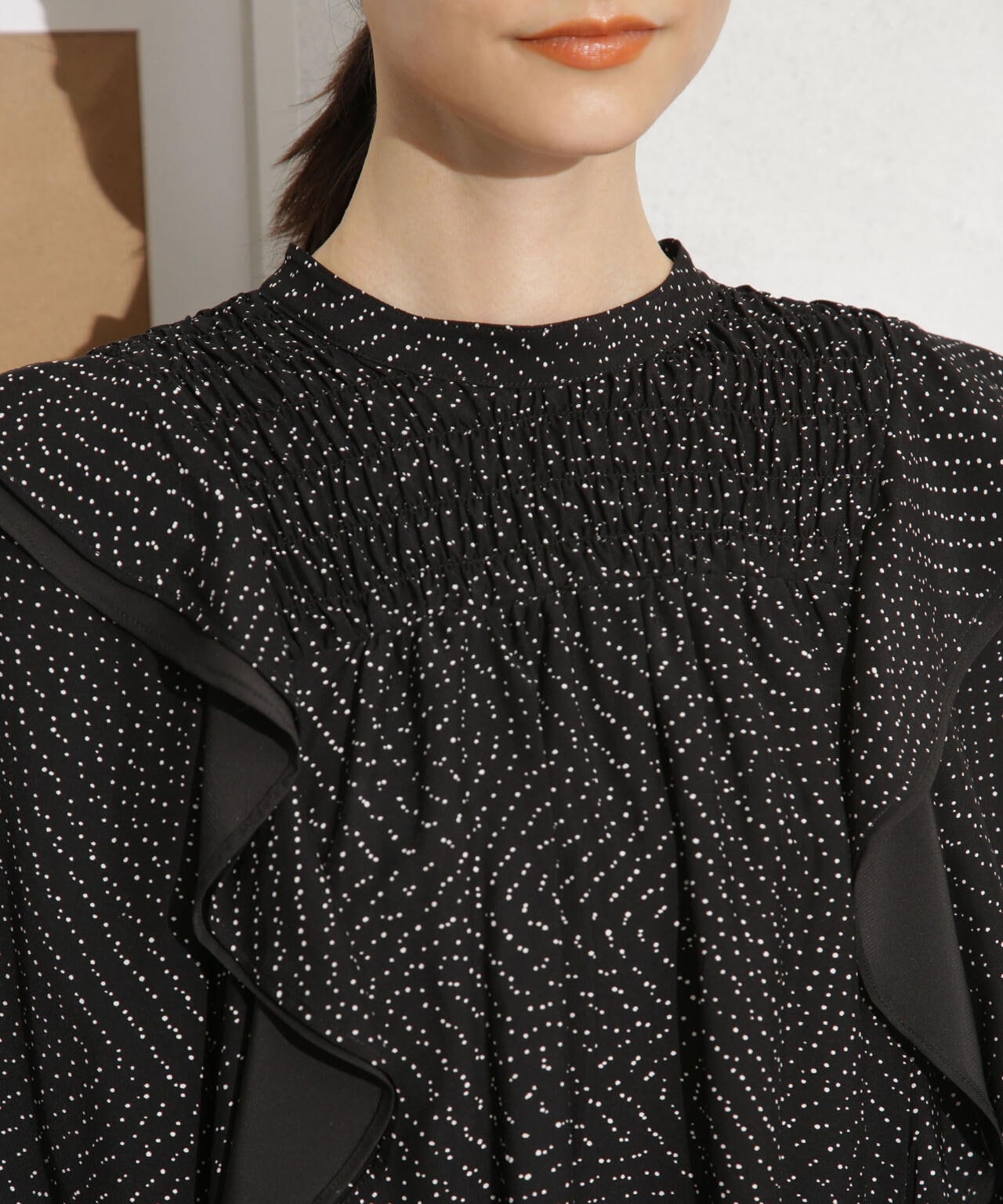 ・袖シルエットをアレンジできる袖口シャーリングフリルディテール