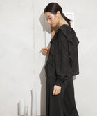 肩のフリルディテールが華やかなシャーリングブラウス。フリルの下段に繊細なシフォン生地を挟んだ動きのあるディテールが、ひらりと風に舞うような軽やかな風合いを演出。ボトムスにインしてフリルのボリューム感を際立たせた着こなしや、ワイドパンツと合わせるスタイルもおすすめです。