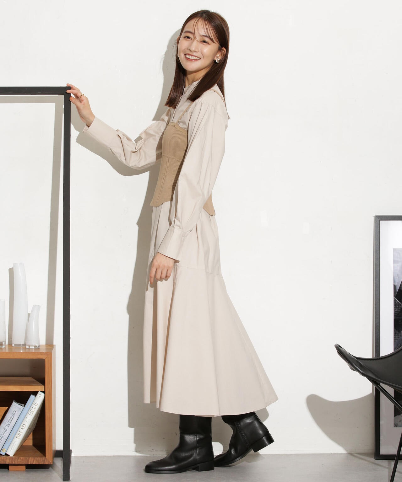 6693219316 ヘムフレアバンドカラーシャツワンピース