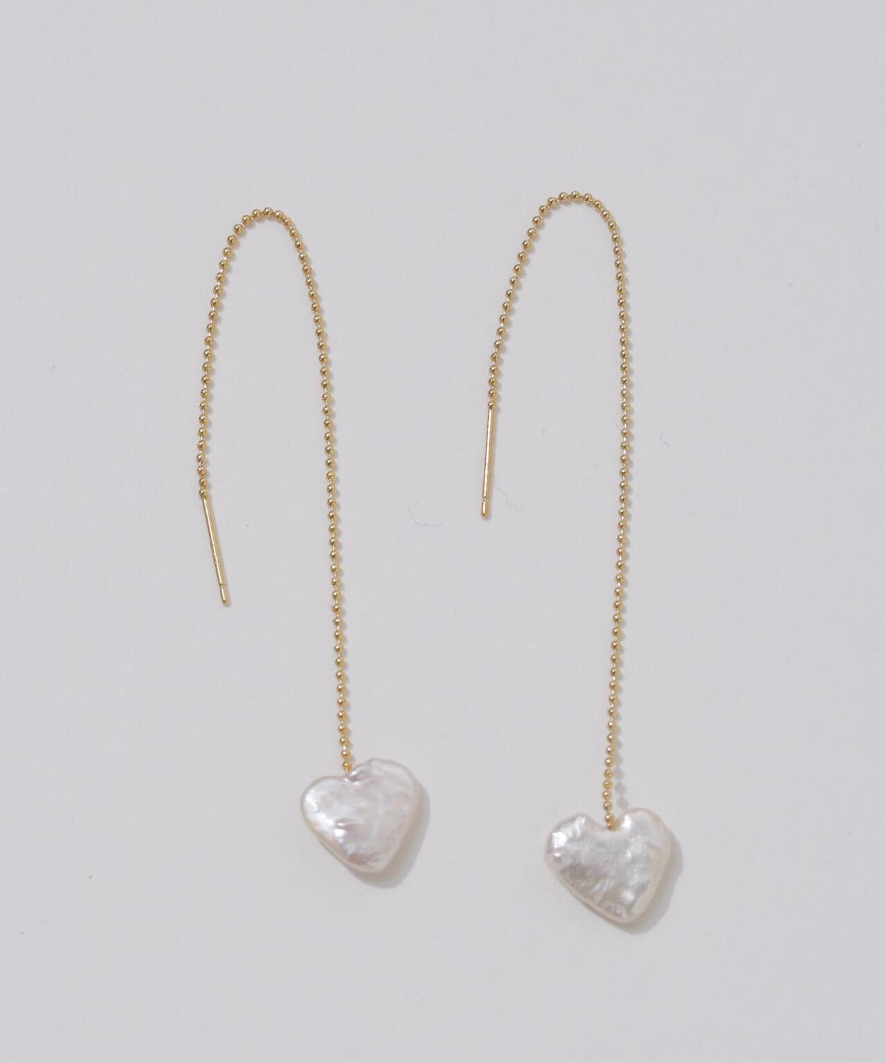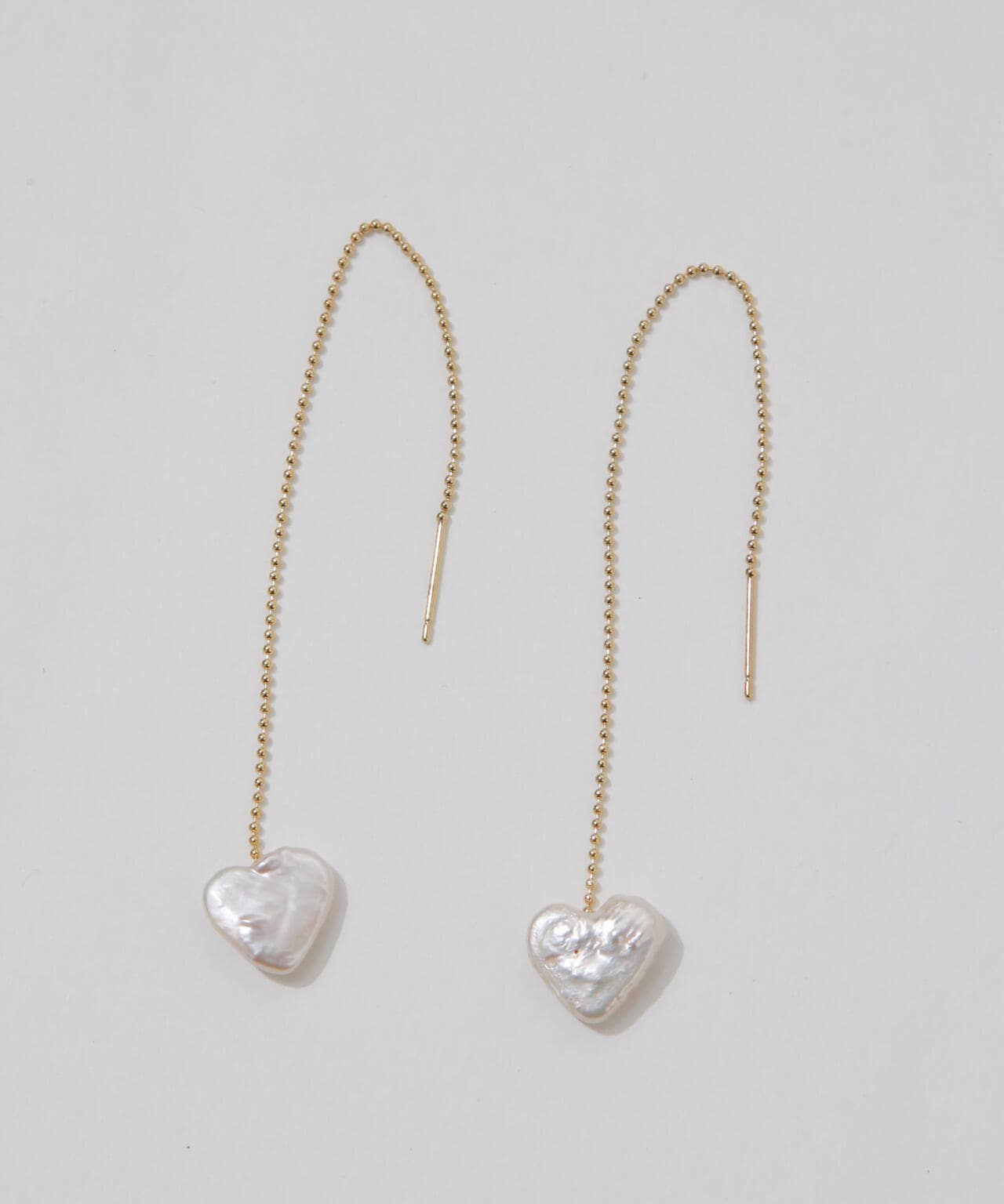 女性らしく上品に映えるハートパールピアス。動くたびに揺れるロングチェーンのモチーフが、エレガントな雰囲気を演出します。一点投入でさりげなく華やぎを演出してくれるから、デイリーからちょっとしたお呼ばれシーンまで活躍しそう!
