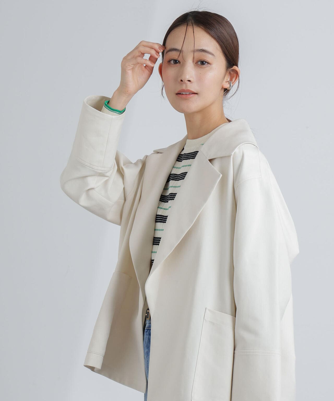 大きなラペルが印象的なミドル丈コート。オーバーサイズのシルエットに、フロントは釦などを省いたシンプルなデザインに仕上げました。袖が太めのデザインなので、袖口をくしゃっと折りあげたラフな着こなしも楽しめるひと品です。