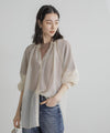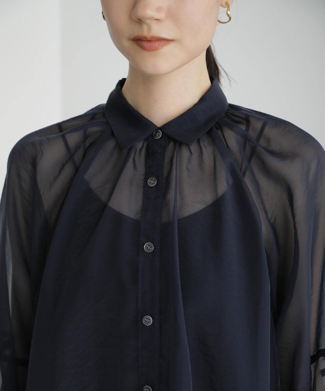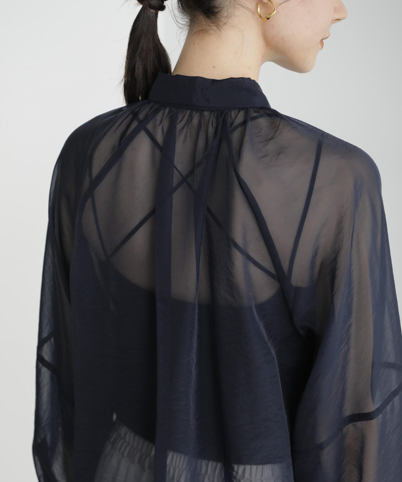 色の陰影や煌めきのあるオシャレな透け感のシアーシャツ。お尻まですっぽり隠れる長め着丈でネックギャザーでたっぷりとした袖分量を持たせた華のあるデザイン。シアー感を邪魔しないラグラン切り替えで、中に合わせるインナーの袖丈を選ばないのも嬉しいポイント◎。インナー次第で様々なコーディネートが楽しめる春夏のレイヤードスタイルに欠かせないアイテムです!
